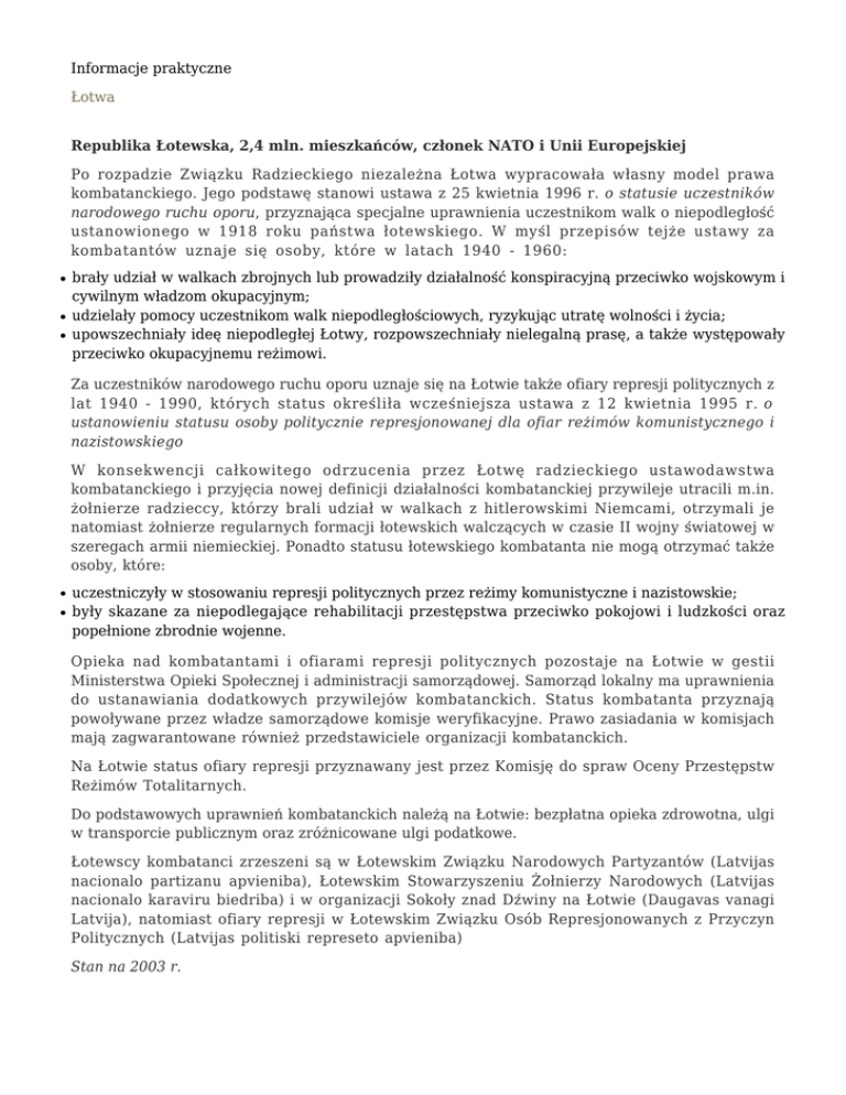 Informacje praktyczne Łotwa Republika Łotewska, 2,4 mln. mieszkańców, członek NATO i Unii Europejskiej Po rozpadzie Związku Radzieckiego niezależna Łotwa wypracowała własny model prawa kombatanckiego. Jego podstawę stanowi ustawa z 25 kwietnia 1996 r. o statusie uczestników narodowego ruchu oporu, przyznająca specjalne uprawnienia uczestnikom walk o niepodległość ustanowionego w 1918 roku państwa łotewskiego. W myśl przepisów tejże ustawy za kombatantów uznaje się osoby, które w latach 1940 - 1960: ● ● ● brały udział w walkach zbrojnych lub prowadziły działalność konspiracyjną przeciwko wojskowym i cywilnym władzom okupacyjnym; udzielały pomocy uczestnikom walk niepodległościowych, ryzykując utratę wolności i życia; upowszechniały ideę niepodległej Łotwy, rozpowszechniały nielegalną prasę, a także występowały przeciwko okupacyjnemu reżimowi. Za uczestników narodowego ruchu oporu uznaje się na Łotwie także ofiary represji politycznych z lat 1940 - 1990, których status określiła wcześniejsza ustawa z 12 kwietnia 1995 r. o ustanowieniu statusu osoby politycznie represjonowanej dla ofiar reżimów komunistycznego i nazistowskiego W konsekwencji całkowitego odrzucenia przez Łotwę radzieckiego ustawodawstwa kombatanckiego i przyjęcia nowej definicji działalności kombatanckiej przywileje utracili m.in. żołnierze radzieccy, którzy brali udział w walkach z hitlerowskimi Niemcami, otrzymali je natomiast żołnierze regularnych formacji łotewskich walczących w czasie II wojny światowej w szeregach armii niemieckiej. Ponadto statusu łotewskiego kombatanta nie mogą otrzymać także osoby, które: ● ● uczestniczyły w stosowaniu represji politycznych przez reżimy komunistyczne i nazistowskie; były skazane za niepodlegające rehabilitacji przestępstwa przeciwko pokojowi i ludzkości oraz popełnione zbrodnie wojenne. Opieka nad kombatantami i ofiarami represji politycznych pozostaje na Łotwie w gestii Ministerstwa Opieki Społecznej i administracji samorządowej. Samorząd lokalny ma uprawnienia do ustanawiania dodatkowych przywilejów kombatanckich. Status kombatanta przyznają powoływane przez władze samorządowe komisje weryfikacyjne. Prawo zasiadania w komisjach mają zagwarantowane również przedstawiciele organizacji kombatanckich. Na Łotwie status ofiary represji przyznawany jest przez Komisję do spraw Oceny Przestępstw Reżimów Totalitarnych. Do podstawowych uprawnień kombatanckich należą na Łotwie: bezpłatna opieka zdrowotna, ulgi w transporcie publicznym oraz zróżnicowane ulgi podatkowe. Łotewscy kombatanci zrzeszeni są w Łotewskim Związku Narodowych Partyzantów (Latvijas nacionalo partizanu apvieniba), Łotewskim Stowarzyszeniu Żołnierzy Narodowych (Latvijas nacionalo karaviru biedriba) i w organizacji Sokoły znad Dźwiny na Łotwie (Daugavas vanagi Latvija), natomiast ofiary represji w Łotewskim Związku Osób Represjonowanych z Przyczyn Politycznych (Latvijas politiski represeto apvieniba) Stan na 2003 r.