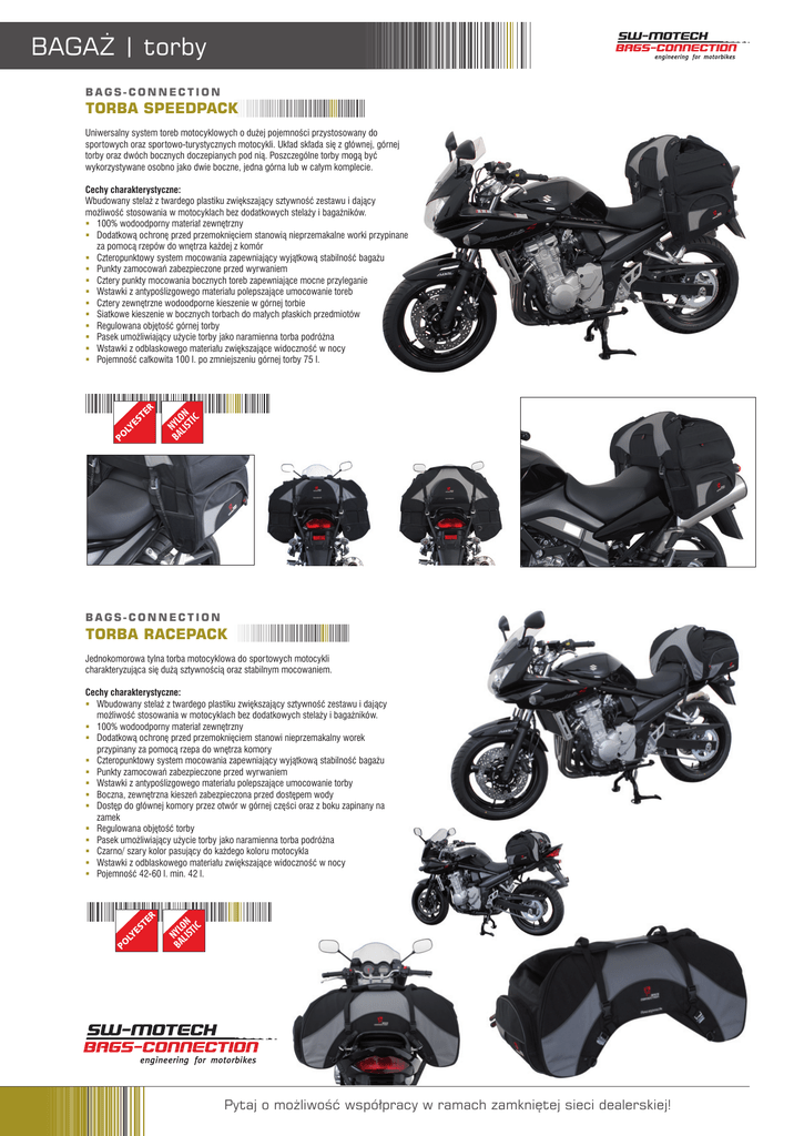BAGAŻ | torby BAGS-CONNECTION TORBA SPEEDPACK Uniwersalny system toreb motocyklowych o dużej pojemności przystosowany do sportowych oraz sportowo-turystycznych motocykli. Układ składa się z głównej, górnej torby oraz dwóch bocznych doczepianych pod nią. Poszczególne torby mogą być wykorzystywane osobno jako dwie boczne, jedna górna lub w całym komplecie. BA NYL LIS ON TIC Cechy charakterystyczne: Wbudowany stelaż z twardego plastiku zwiększający sztywność zestawu i dający możliwość stosowania w motocyklach bez dodatkowych stelaży i bagażników. 100% wodoodporny materiał zewnętrzny Dodatkową ochronę przed przemoknięciem stanowią nieprzemakalne worki przypinane za pomocą rzepów do wnętrza każdej z komór Czteropunktowy system mocowania zapewniający wyjątkową stabilność bagażu Punkty zamocowań zabezpieczone przed wyrwaniem Cztery punkty mocowania bocznych toreb zapewniające mocne przyleganie Wstawki z antypoślizgowego materiału polepszające umocowanie toreb Cztery zewnętrzne wodoodporne kieszenie w górnej torbie Siatkowe kieszenie w bocznych torbach do małych płaskich przedmiotów Regulowana objętość górnej torby Pasek umożliwiający użycie torby jako naramienna torba podróżna Wstawki z odblaskowego materiału zwiększające widoczność w nocy Pojemność całkowita 100 l. po zmniejszeniu górnej torby 75 l. BAGS-CONNECTION TORBA RACEPACK Jednokomorowa tylna torba motocyklowa do sportowych motocykli charakteryzująca się dużą sztywnością oraz stabilnym mocowaniem. BA NYL LIS ON TIC Cechy charakterystyczne: Wbudowany stelaż z twardego plastiku zwiększający sztywność zestawu i dający możliwość stosowania w motocyklach bez dodatkowych stelaży i bagażników. 100% wodoodporny materiał zewnętrzny Dodatkową ochronę przed przemoknięciem stanowi nieprzemakalny worek przypinany za pomocą rzepa do wnętrza komory Czteropunktowy system mocowania zapewniający wyjątkową stabilność bagażu Punkty zamocowań zabezpieczone przed wyrwaniem Wstawki z antypoślizgowego materiału polepszające umocowanie torby Boczna, zewnętrzna kieszeń zabezpieczona przed dostępem wody Dostęp do głównej komory przez otwór w górnej części oraz z boku zapinany na zamek Regulowana objętość torby Pasek umożliwiający użycie torby jako naramienna torba podróżna Czarno/ szary kolor pasujący do każdego koloru motocykla Wstawki z odblaskowego materiału zwiększające widoczność w nocy Pojemność 42-60 l. min. 42 l. Pytaj o możliwość współpracy w ramach zamkniętej sieci dealerskiej! torby | BAGAŻ BAGS-CONNECTION TORBA REARBAG Jednokomorowa torba motocyklowa montowana na tylnym siedzeniu motocykli sportowych i sportowo – turystycznych. Odpowiedni kształt spodniej części torby umożliwia dopasowanie do każdego modelu motocykla. ze Pok ciw ro de wie szc c zo wy Pr BA NYL LIS ON TIC Cechy charakterystyczne: Wbudowane usztywnienie zapewniające stabilną budowę torby i możliwość stosowania bez dodatkowych bagażników i stelaży Wodoodporny materiał zewnętrzny zapobiegający przed przemoczeniem Dodatkową ochronę przed deszczem stanowi nakładka zakładana na główną klapę torby Zamki kieszeni zabezpieczone przed przemoknięciem dzięki specjalnej nakładce z nieprzemakalnego materiału Czteropunktowy system mocowania zapewniający stabilność bagażu Dwie zewnętrzne kieszenie, z czego jedna odpinana do stosowania jako torebka na pasek Regulowana objętość torby Paski umożliwiające stosowanie torby jako plecak Czarno/ szary kolor pasujący do każdego koloru motocykla Wstawki z odblaskowego materiału zwiększające widoczność w nocy Pojemność max 38 l. min. 25 l. BAGS-CONNECTION TORBA CARGOBAG Miękka torba montowana z tyłu, dopasowująca się do kształtu motocykla. Torba posiada możliwość regulacji objętości. Kształt dolnej części umożliwia zamocowanie na każdym typie motocykla. [email protected] Pr P ze ok ciw ro de wie szc c zo wy BA NYL LIS ON TIC Cechy charakterystyczne: Materiał zewnętrzny zabezpieczający przed czynnikami zewnętrznymi Pokrowiec przeciwdeszczowy zapobiegający przemoczeniu chowany w specjalnej kieszeni Czteropunktowy system mocowania Spód torby wyszyty materiałem antypoślizgowym Dwie zewnętrzne kieszenie Regulowana objętość torby Możliwość dopięcia dodatkowej torby np. Tentbag Wstawki z odblaskowego materiału zwiększające widoczność w nocy Uniwersalny czarny kolor Pojemność max 52 l. 61 65 35 750 BAGAŻ | torby BAGS-CONNECTION TANK BAG SPORT Jednokomorowa torba na zbiornik ergonomicznie wyprofilowana przeznaczona szczególnie do sportowych motocykli. Specjalny kształt umożliwia jazdę z dużymi prędkościami oraz pewne trzymanie kierownicy. ET MA GN ze Pok ciw ro de wie szc c zo wy Pr BA NYL LIS ON TIC Cechy charakterystyczne: Sześć wyjątkowo mocnych magnesów zapewniający silne przyleganie do zbiornika Spód wyszyty antypoślizgowym materiałem zapewniającym stabilność torby Paski mocujące umożliwiające montaż torby na tylnym siedzeniu lub plastikowym zbiorniku Wyprofilowany kształt ułatwiający „ chowanie się za owiewką ” podczas jazdy z dużymi prędkościami Wodoodporny materiał zapewniający szczelność torby Dodatkowy wodoodporny pokrowiec zapewniający 100% nieprzemakalności Nakładka na zamki zapobiegająca przed przemoknięciem torby Kieszeń na mapę w klapie torby Trzy zewnętrzne kieszenie, z czego jedna odpinana służąca jako torebka na pasek Usztywniona kieszeń na okulary Dwie wewnętrzne kieszenie Regulowana objętość torby Suwaki zamków wykończone miękkim plastikiem zapobiegającym niszczeniu powłoki lakieru zbiornika Torba przypinana do podstawy, która może służyć jako sama kieszeń na mapę Pasek umożliwiający użycie torby jako naramiennej Czarno/ szary kolor pasujący do każdego koloru motocykla Wstawki z odblaskowego materiału zwiększające widoczność w nocy Pojemność max 22