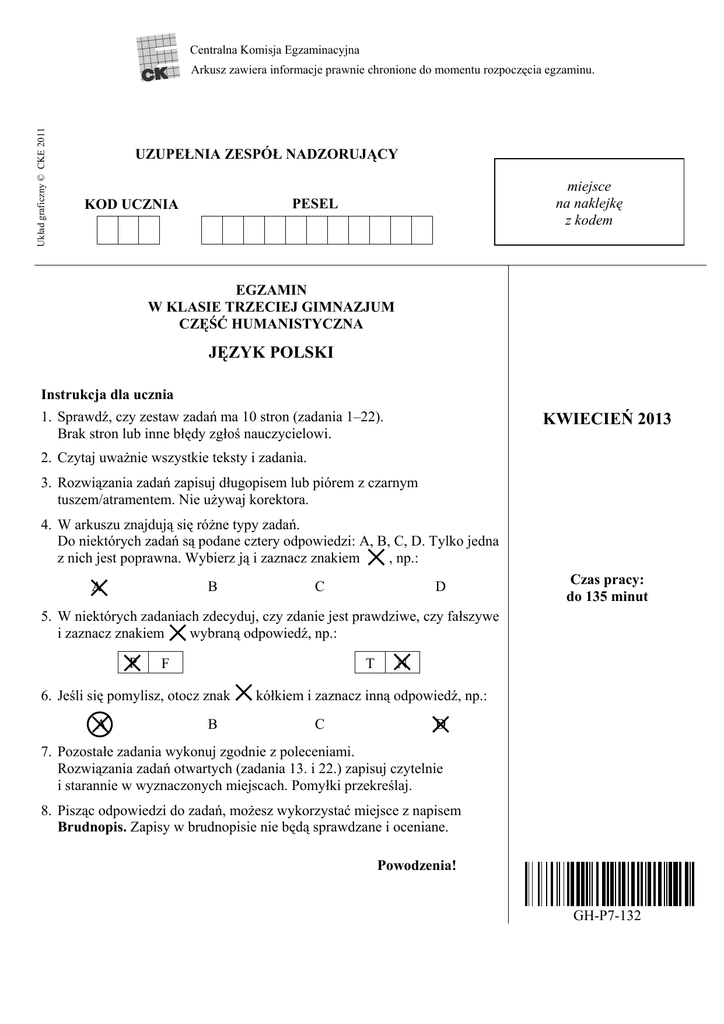 Centralna Komisja Egzaminacyjna Układ graficzny © CKE 2011 Arkusz zawiera informacje prawnie chronione do momentu rozpoczęcia egzaminu. UZUPEŁNIA ZESPÓŁ NADZORUJĄCY miejsce na naklejkę z kodem PESEL KOD UCZNIA EGZAMIN W KLASIE TRZECIEJ GIMNAZJUM CZĘŚĆ HUMANISTYCZNA JĘZYK POLSKI Instrukcja dla ucznia 1. Sprawdź, czy zestaw zadań ma 10 stron (zadania 1–22). Brak stron lub inne błędy zgłoś nauczycielowi. KWIECIEŃ 2013 2. Czytaj uważnie wszystkie teksty i zadania. 3. Rozwiązania zadań zapisuj długopisem lub piórem z czarnym tuszem/atramentem. Nie używaj korektora. 4. W arkuszu znajdują się różne typy zadań. Do niektórych zadań są podane cztery odpowiedzi: A, B, C, D. Tylko jedna z nich jest poprawna. Wybierz ją i zaznacz znakiem , np.: A B C D Czas pracy: do 135 minut 5. W niektórych zadaniach zdecyduj, czy zdanie jest prawdziwe, czy fałszywe i zaznacz znakiem wybraną odpowiedź, np.: P F T 6. Jeśli się pomylisz, otocz znak A B N kółkiem i zaznacz inną odpowiedź, np.: C D 7. Pozostałe zadania wykonuj zgodnie z poleceniami. Rozwiązania zadań otwartych (zadania 13. i 22.) zapisuj czytelnie i starannie w wyznaczonych miejscach. Pomyłki przekreślaj. 8. Pisząc odpowiedzi do zadań, możesz wykorzystać miejsce z napisem Brudnopis. Zapisy w brudnopisie nie będą sprawdzane i oceniane. Powodzenia! GH-P7-132 Przeczytaj tekst i wykonaj zadania 1.–6. O ODWADZE Czasami słyszymy o ludziach, którzy bez chwili zastanowienia rzucają się w ogień czy burzliwy nurt rzeki. Niektórzy z zazdrością myślą o ich odwadze. Rodzi się jednak pytanie: „Czy to jest odwaga?”. Odwaga jest siostrą strachu. Żeby być odważnym, trzeba najpierw poczuć obawę. Trzeba ten strach poczuć, trzeba się z nim pomęczyć. Strach każe unikać niebezpieczeństwa, wycofywać się, uciekać, ale inne powody skłaniają ludzi do działania, do zrobienia czegoś, co może być w następstwie kosztowne lub nawet groźne. Odwaga jest więc aktem wyboru, ponieważ wiąże się z decyzją o pokonaniu strachu w imię jakiejś cenionej wartości. Irena Sendlerowa1 dobrze wiedziała, co robi. Wiedziała, co się stanie z nią, z jej najbliższymi, gdy Niemcy dowiedzą się, że ratuje żydowskie dzieci. Dokonała wyboru. Czy się bała? Strach – jak sama mówiła – towarzyszył jej życiu przez wiele lat, ale potrafiła go przezwyciężyć. Kinga Baranowska jest sławną na świecie himalaistką2. Odważnie wspina się na najwyższe szczyty Ziemi. Czuje jednak respekt3 przed górami, bo wie, że jest się czego bać. Mówi, że jeśli przestanie się bać, przekroczy granice dopuszczalnego ryzyka. Trzeba bowiem poczuć strach, by w pełni świadomie zdobyć się na odwagę. Często jednak odwaga myli się ludziom z brawurą4, z brakiem wyobraźni czy wręcz głupotą. Każdego roku wielu takich „odważnych” decyduje się na tragiczne w skutkach skoki do wody z wysokiego brzegu lub mostu. Każdego dnia tacy „odważni” kierowcy giną w wypadkach, raniąc lub zabijając także innych ludzi. Nie boją się. Myślą, że są odważni, bo o odwadze według nich świadczy podjęcie lekkomyślnego działania, które staje się ważniejsze od skutków. Powtórzmy więc pytanie: „Czy to jest odwaga?”. Warto się zastanowić, czym naprawdę jest odwaga. A może odwaga to szczególny rodzaj ostrożności? Na podstawie: Wiesław Łukaszewski, Odwaga, „Charaktery” 2010, nr 9. 1 Irena Sendlerowa – podczas II wojny światowej wraz ze współpracownikami wyprowadziła z warszawskiego getta i uratowała od śmierci około 2,5 tys. dzieci żydowskich. 2 Himalaistka – kobieta sportowo wspinająca się na szczyty Himalajów lub innych wysokich gór. 3 Respekt – szacunek. 4 Brawura – lekceważenie niebezpieczeństwa, skłonność do popisywania się (zwłaszcza odwagą). Zadanie 1. (0-1) Według autora tekstu odważny jest człowiek, który A. B. C. D. pokonuje strach, by zrobić coś wartościowego. bez zastanowienia rzuca się w ogień lub nurt rzeki. podejmuje ryzyko, bo nigdy się nie boi. decyduje się działać, gdy nie ma ryzyka. Zadanie 2. (0-1) Z artykułu wynika, że przykładem brawury jest A. B. C. D. skok do wody z wysokiego mostu dla zabawy. zgodna z przepisami jazda samochodem. starannie przygotowana wspinaczka na wysoki szczyt. udział w walce zbrojnej w imię ważnych celów. Strona 2 z 10 Zadanie 3. (0-1) Podobieństwo między Ireną Sendlerową i Kingą Baranowską polega na tym, że obie kobiety A. B. C. D. ratowały odważnie życie innych. nie potrafiły pokonać strachu. bardzo ceniły ryzyko. nauczyły się pokonywać strach. Zadanie 4. (0-1) Autor tekstu napisał, że odwaga jest siostrą strachu. Znaczy to, że A. B. C. D. gdy ktoś jest odważny, nigdy nie czuje strachu. odwadze zawsze towarzyszy strach. odwaga i strach to stany przeciwstawne, wykluczające się. kto ma rodzeństwo, jest odważny. Zadanie 5. (0-1) Zdania w tabeli dotyczą tekstu O przy nim F (fałsz). ODWADZE. Oceń, które zdanie jest fałszywe. Zaznacz 1. Autor w artykule analizuje sytuacje, w których odwadze towarzyszył strach. F 2. Celem autora jest zachęcenie do przemyślenia problemu, czym jest odwaga. F 3. Autor twierdzi, że nie powinniśmy być odważni, bo jest to ryzykowne. F Zadanie 6. (0-1) Autor tekstu w ostatnim akapicie dwa razy ujął wyraz odważni w cudzysłów. Znaczy to, że A. B. C. D. ci ludzie wcale nie są odważni, tylko bezmyślni. szczególnie podkreśla odwagę tych osób. cytuje kogoś, z kim rozmawiał o odwadze. ci ludzie wcale nie są odważni, tylko tchórzliwi. Strona 3 z 10 Przeczytaj tekst i wykorzystaj zawartą w nim informację do wykonania zadania 7. Odwaga: dzielność, lwie serce, męstwo, nieustraszoność, śmiałość Słownik wyrazów bliskoznacznych, PWN, Warszawa 2008. Zadanie 7. (0-1) W tabeli zostały umieszczone zdania z wyrazami ze słownika. Które z nich autor artykułu O ODWADZE uznałby za prawdziwe? Zaznacz przy nim