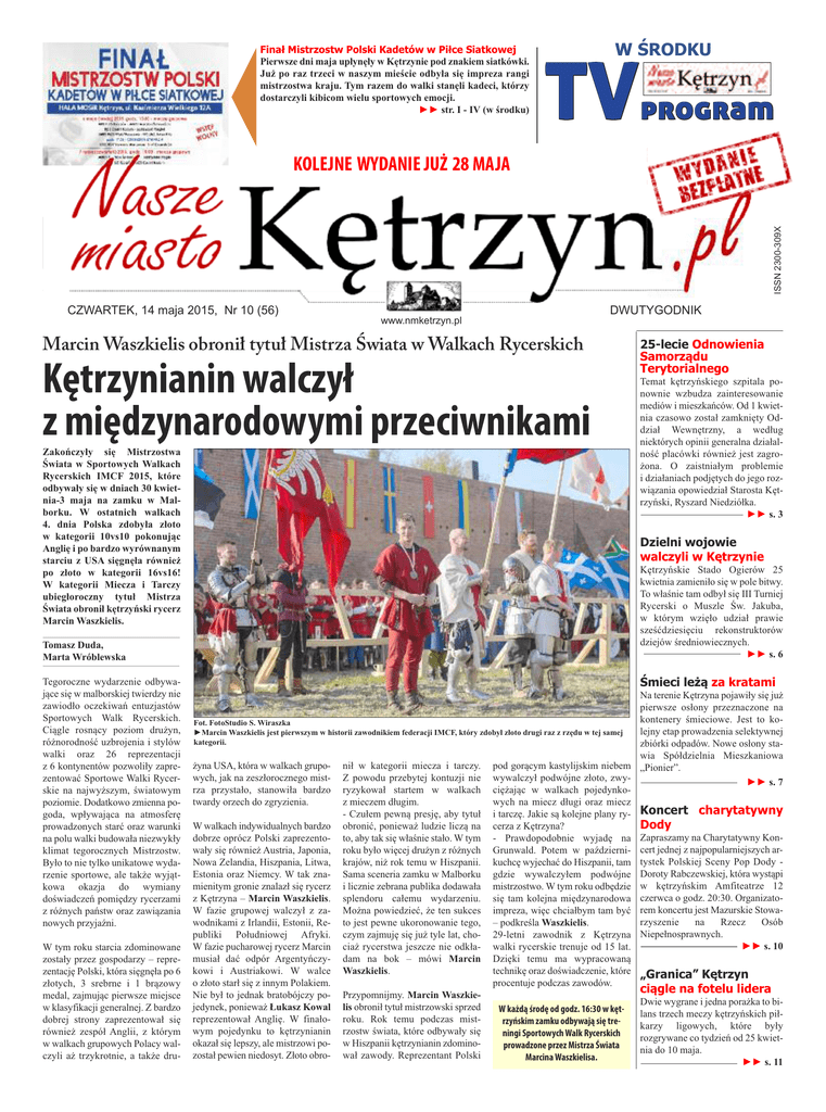 CZWARTEK, 14 maja 2015, Nr 10 (56) W ŚRODKU TVprogram KOLEJNE WYDANIE JUŻ 28 MAJA www.nmketrzyn.pl DWUTYGODNIK Marcin Waszkielis obronił tytuł Mistrza Świata w Walkach Rycerskich Kętrzynianin walczył P z międzynarodowymi przeciwnikami Zakończyły się Mistrzostwa Świata w Sportowych Walkach Rycerskich IMCF 2015, które odbywały się w dniach 30 kwietnia-3 maja na zamku w Malborku. W ostatnich walkach 4. dnia Polska zdobyła złoto w kategorii 10vs10 pokonując Anglię i po bardzo wyrównanym starciu z USA sięgnęła również po złoto w kategorii 16vs16! W kategorii Miecza i Tarczy ubiegłoroczny tytuł Mistrza Świata obronił kętrzyński rycerz Marcin Waszkielis. Tomasz Duda, Marta Wróblewska Tegoroczne wydarzenie odbywające się w malborskiej twierdzy nie zawiodło oczekiwań entuzjastów Sportowych Walk Rycerskich. Fot. FotoStudio S. Wiraszka Ciągle rosnący poziom drużyn, ►Marcin Waszkielis jest pierwszym w historii zawodnikiem federacji IMCF, który zdobył złoto drugi raz z rzędu w tej samej różnorodność uzbrojenia i stylów kategorii. walki oraz 26 reprezentacji żyna USA, która w z 6 kontynentów pozwoliły zapreRachel obudzi się rano w łóżku z Dexem. Niewalkach dość, grupo- nił w kategorii miecza i tarczy. pod gorącym kastylijskim niebem ż zentować Sportowe Walki Rycer- wych, jak na zeszłorocznego mist- Z powodu przebytej kontuzji nie wywalczył podwójne złoto, zwyskie na najwyższym, światowym rza przystało, stanowiła bardzo ryzykował startem w walkach ciężając w walkach pojedynkoz mieczem długim. wych na miecz długi oraz miecz poziomie. Dodatkowo zmienna po- twardy orzech do zgryzienia. - Czułem pewną presję, aby tytuł i tarczę. Jakie są kolejne plany rygoda, wpływająca na atmosferę prowadzonych starć oraz warunki W walkach indywidualnych bardzo obronić, ponieważ ludzie liczą na cerza z Kętrzyna? na polu walki budowała niezwykły dobrze oprócz Polski zaprezento- to, aby tak się właśnie stało. W tym - Prawdopodobnie wyjadę na klimat tegorocznych Mistrzostw. wały się również Austria, Japonia, roku było więcej drużyn z różnych Grunwald. Potem w październiByło to nie tylko unikatowe wyda- Nowa Zelandia, Hiszpania, Litwa, krajów, niż rok temu w Hiszpanii. kuchcę wyjechać do Hiszpanii, tam rzenie sportowe, ale także wyjąt- Estonia oraz Niemcy. W tak zna- Sama sceneria zamku w Malborku gdzie wywalczyłem podwójne kowa okazja do wymiany mienitym gronie znalazł się rycerz i licznie zebrana publika dodawała mistrzostwo. W tym roku odbędzie doświadczeń pomiędzy rycerzami z Kętrzyna – Marcin Waszkielis. splendoru całemu wydarzeniu. się tam kolejna międzynarodowa z różnych państw oraz zawiązania W fazie grupowej walczył z za- Można powiedzieć, że ten sukces impreza, więc chciałbym tam być wodnikami z Irlandii, Estonii, Re- to jest pewne ukoronowanie tego, – podkreśla Waszkielis. nowych przyjaźni. publiki Południowej Afryki. czym zajmuję się już tyle lat, cho- 29-letni zawodnik z Kętrzyna W tym roku starcia zdominowane W fazie pucharowej rycerz Marcin ciaż rycerstwa jeszcze nie odkła- walki rycerskie trenuje od 15 lat. zostały przez gospodarzy – repre- musiał dać odpór Argentyńczy- dam na bok – mówi Marcin Dzięki temu ma wypracowaną technikę oraz doświadczenie, które zentację Polski, która sięgnęła po 6 kowi i Austriakowi. W walce Waszkielis. procentuje podczas zawodów. złotych, 3 srebrne i 1 brązowy o złoto starł się z innym Polakiem. medal, zajmując pierwsze miejsce Nie był to jednak bratobójczy po- Przypomnijmy. Marcin Waszkiew klasyfikacji generalnej. Z bardzo jedynek, ponieważ Łukasz Kowal lis obronił tytuł mistrzowski sprzed W każdą środę od godz. 16:30 w kętdobrej strony zaprezentował się reprezentował Anglię. W finało- roku. Rok temu podczas mistrzyńskim zamku odbywają się trerównież zespół Anglii, z którym wym pojedynku to kętrzynianin rzostw świata, które odbywały się ningi Sportowych Walk Rycerskich w walkach grupowych Polacy wal- okazał się lepszy, ale mistrzowi po- w Hiszpanii kętrzynianin zdominoprowadzone przez Mistrza Świata czyli aż trzykrotnie, a także dru- został pewien niedosyt. Złoto obro- wał zawody. Reprezentant Polski Marcina Waszkielisa. ISSN 2300-309X ◄ Finał Mistrzostw Polski Kadetów w Piłce Siatkowej Pierwsze dni maja upłynęły w Kętrzynie pod znakiem siatkówki. Już po raz trzeci w naszym mieście odbyła się impreza rangi mistrzostwa kraju. Tym razem do walki stanęli kadeci, którzy dostarczyli kibicom wielu sportowych emocji. ►► str. I - IV (w środku) 25-lecie Odnowienia Samorządu Terytorialnego Temat kętrzyńskiego szpitala ponownie wzbudza zainteresowanie mediów i mieszkańców. Od 1 kwietnia czasowo został zamknięty Oddział Wewnętrzny, a według niektórych opinii generalna działalność placówki również jest zagrożona. O zaistniałym problemie i działaniach podjętych do jego rozwiązania opowiedział Starosta Kętrzyński, Ryszard Niedziółka. ►► s. 3 Dzielni wojowie walczyli w Kętrzynie Kętrzyńskie Stado Ogierów 25 kwietnia zamieniło się w pole bitwy. To właśnie tam odbył się III Turniej Rycerski o Muszle Św. Jakuba, w którym wzięło udział prawie sześćdziesięciu rekonstruktorów dziejów średniowiecznych. ►► s. 6 Śmieci leżą za kratami Na terenie Kętrzyna pojawiły się już pierwsze osłony przeznaczone na kontenery śmieciowe. Jest to kolejny etap prowadzenia selektywnej zbiórki odpadów. Nowe osłony stawia Spółdzielnia Mieszkaniowa „Pionier”. ►► s. 7 Koncert charytatywny Dody Zapraszamy na Charytatywny Koncert jednej z najpopularniejszych artystek Polskiej Sceny Pop Dody Doroty Rabczewskiej, która wystąpi w kętrzyńskim Amfiteatrze 12 czerwca o godz. 20:30. Organizatorem koncertu jest Mazurskie Stowarzyszenie na Rzecz Osób Niepełnosprawnych. ►► s. 10 „Granica” Kętrzyn ciągle na f