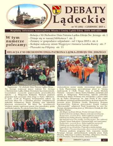 nr VI (181) - CZERWIEC 2015 r. - Relacja z XI Obchodów Dnia Patrona Lądka-Zdroju Św. Jerzego str. 1 - Dzieje się w naszej bibliotece ! str. 2 - Zmiany w gospodarce odpadami - od 1 lipca 2015 r. str. 6 - Kolejne sukcesy sióstr Węgrzyn i trenera Leszka Kawy str. 7 - Pluszaki na Filipiny str. 11 RELACJA Z XI OBCHODÓW DNIA PATRONA LĄDKA-ZDROJU ŚW. JERZEGO Tegoroczne - XI obchody Dnia Patrona Lądka-Zdroju Św. Jerzego rozpoczął spacer traktem Św. Jerzego z Burmistrzem Lądka-Zdroju Romanem Kaczmarczykiem. Uczestników wycieczki poprowadziła przewodniczka lądecka – p. Małgorzata Bednarek. Ważnym punktem programu było uczczenie Dnia Flagi w Parku 1000-lecia. O godz. 15.00 na Wzgórzu Świętojerskim odbyła się uroczysta Msza Św. z udziałem pocztów sztandarowych jednostki Ochotniczej Straży Pożarnej oraz lądeckich placówek oświatowych. We Mszy Św. uczestniczyli włodarze miasta, zaproszeni goście oraz mieszkańcy grodu nad Białą Lądecką. Po zakończeniu Mszy Świętej wieloosobowa postać smoka stworzonego przez dzieci z Koła Plastycznego prowadzonego przez p. Tatianę Andrzejczak w CKiR, Święty Jerzy w osobie Michała Tramera – reżysera i aktora Teatru Kłodzko, pacholęta pod opieką p. Małgorzaty Wołczackiej, lądecka jednostka Ochotniczej Straży Pożarnej oraz mieszkańcy i goście udali się do Parku Zdrojowego im. Jana Pawła II aby zostać świadkami ceremonii przekazania kluczy do bram miasta Św. Jerzemu przez Włodarza Grodu, Burmistrza Romana Kaczmarczyka. Podczas uroczystości Zespół Ludowy „Skrzynczanki” odśpiewał Pieśń hymniczną ku czci Św. Jerzego skomponowaną przez p. Mirosława Grendę do słów p. Haliny Watras: Jak długie są dzieje Zdroju, Postać Jerzego obecna Symbol zdrowia i pokoju, Miasto wiele mu zawdzięcza. Święty nasz, rycerzu Jerzy, Tobie Lądek los zawierzył Obdaruj nas łaską zdrowia, Odwagi i siły dodaj! Ma imię pierwsze Twe źródło, Leczniczą moc dar cudowny Z kaplicy śpiew ludu płynie, Patronem bądź, nieś nam pomoc Święty nasz, rycerzu Jerzy, Tobie Lądek los zawierzył Obdaruj nas łaską zdrowia, Odwagi i siły dodaj! Legendy też są chwalebne, Pogromcę smoka malują Męczeństwo Twe jest zbawienne, Za co wierni Ci dziękują. Ważnym punktem programu było wręczenie medali Świętego Jerzego zatwierdzonych uchwałą przez Radę Miejską. Dekoracji Czesława Korobija, Zbigniewa Osucha, Leszka Pazdyka, Jacka Rzeźnika, Janusza Sosny str. 1 nr 6 [181/2015] DZIEJE SIĘ W NASZEJ BIBLIOTECE ! i Marka Wrony dokonał przewodniczący Konwentu Medalu Honorowego Św. Jerzego - Burmistrz Roman Kaczmarczyk. Tego dnia nastąpiło także wręczenie Małej Złotej Odznaki Polskiego Związku Emerytów, Rencistów i Inwalidów. Odznaczeniem tym uhonorowani zostali: Teresa Piskorowska i Janusz Sosna. Dzień Patrona Lądka-Zdroju – św. Jerzego to czas i miejsce na prezentację działających na terenie lądeckiej gminy grup i sekcji artystycznych. W programie Lądeckie Talenty zaprezentowali się: Paulina Koszyk, Julia Karmazyn, Kamil Kaczmarek, Tytus Kwiatkowski, Wiktoria Adamus, Martyna Siwiec ze Szkoły Podstawowej nr 1, Kamila Galas, Zuzanna Gałka i Paulina Mykietyszyn ze Studia Piosenki prowadzonego przez Łukasza Przepiórę w CKiR, grupa taneczna TNT, Wytwórnia Kroków Nietypowych, zespół tańca orientalnego Damascus.W drugiej części koncertu wysłuchaliśmy prezentacji w wykonaniu półfinalistów programu Must be the Music: Azzji i Huberta, zespołu rockowego Progressaid oraz duetu Backstage Acoustic. W pozostałe dni długiego weekendu zorganizowano spacer z Burmistrzem na Borówkową Górę inaugurującą otwarcie sezonu turystycznego. Kolejną propozycją dla aktywnych był spacer z Burmistrzem i Przewodnikiem Mirosławem Zbrzeźniakiem do Kątów Bystrzyckich połączony ze zwiedzaniem kościoła, Gotwaldówki, warsztatami ceramiki i piknikiem rodzinnym. W imieniu Organizatorów XI obchodów Dnia Patrona Lądka-Zdroju-św. Jerzego serdecznie dziękujemy wszystkim osobom, instytucjom i organizacjom, które włączyły się do współpracy w realizacji przedsięwzięcia. Małgorzata Stuła - Centrum Kultury i Rekreacji Fundacja Orange w bibliotece - Biblioteka Centrum Kultury i Rekreacji od kilku lat bierze udział w programie „Orange dla Bibliotek”. Fundacja Orange wspiera biblioteki publiczne w ich rozwoju informacyjnym, by stawały się jeszcze bardziej atrakcyjnym i przyjaznym miejscem dla swoich użytkowników. W bieżącym roku biblioteka otrzymała dotację w wysokości 1737 zł. Pieniądze te zostaną przeznaczone m.in. na pokrycie kosztów dostępu do Internetu oraz na zakup audiobooków dla dzieci. Dostępne w bibliotece komputery i tablety są do Państwa dyspozycji! Zapraszamy do bezpłatnego korzystania z Internetu. Pożar w Klubie Malucha!!! - na jednym z ostatnich spotkań w naszym klubie, wszystkie dzieci wraz z opiekunami wyruszyły w teren. Całą gromadą odwiedziliśmy Ochotniczą Straż Pożarną w Lądku-Zdroju. Dzieci poznały sprzęt wykorzystywany w akcjach. Każdy mógł zobaczyć strój strażaka, dotknąć węży i prądownic oraz założyć kask strażacki. Na koniec dzieci w podziękowaniu wręczyły wykonaną wcześniej laurkę. Największą frajdę sprawiła dzieciakom przejażdżka wozem strażackim, którym wróciły do biblioteki ;-) Bardzo dziękujemy Naszym Strażakom za popołudnie pełne atrakcji!!! Przypominamy, że zajęcia w Klubie odbywają się w każdą środę w godz. 16.30-18.00. Zapraszamy do udziału w nich dzieci w wieku 1-5 lat wraz z rodzicami i opiekunami. Kurs tabletowy – przez ostatnie 4 tygodnie w bibliotece trwał kurs obsługi tabletu dla Seniorów. W sumie udział w nim wzięło 11 osób. Kursanci poznali podstawy użytkowania tabletu, uczyli się pisać, surfować w internecie oraz ,,bawić się” różnymi ciekawymi aplikacjami. Jak się okazało tablet jest dużo prostszy w obsłudze od komputera. Wszyscy uczestni