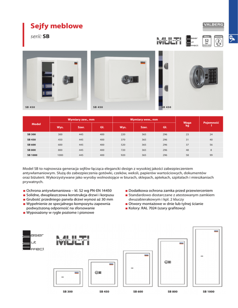 Sejfy meblowe serii: SB SB 450 SB 450 SB 450 Wymiary zew., mm Model Wymiary wew., mm Waga kg Pojemność l 296 23 24 365 296 31 40 365 296 37 56 720 365 296 48 8 920 365 296 58 99 Wys. Szer. Gł. Wys. Szer. Gł. SB 300 300 445 400 220 365 SB 450 450 445 400 370 SB 600 600 445 400 520 SB 800 800 445 400 SB 1000 1000 445 400 Model SB to najnowsza generacja sejfów łącząca elegancki design z wysokiej jakości zabezpieczeniem antywłamaniowym. Służą do zabezpieczenia gotówki, czeków, weksli, papierów wartościowych, dokumentów oraz biżuterii. Wykorzystywane jako wyroby wolnostojące w biurach, sklepach, aptekach, szpitalach i mieszkaniach prywatnych. ■■Ochrona antywłamaniowa – kl. S2 wg PN-EN 14450 ■■Solidne, dwupłaszczowa konstrukcja drzwi i korpusu ■■Grubość przedniego panela drzwi wynosi aż 30 mm ■■Wypełnienie ze specjalnego kompozytu zapewnia podwyższoną odporność na sforsowanie ■■Wyposażony w rygle poziome i pionowe SB 300 SB 450 ■■Dodatkowa ochrona zamka przed przewierceniem ■■Standardowo dostarczane z atestowanym zamkiem dwuzabierakowym i kpl. 2 kluczy ■■Otwory montażowe w dnie lub tylnej ścianie ■■Kolory: RAL 7024 (szary grafitowy) SB 600 SB 800 SB 1000