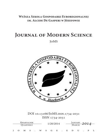 Wyższa Szkoła Gospodarki Euroregionalnej im. Alcide De Gasperi w Józefowie Journal of Modern Science JoMS DOI 10.13166/JoMS.issn.1734-2031 ISSN 1734-2031 Kwartalnik Quarterly j o m s January March 1/20/2014 . w s g e . e d u 2014 . p l Zespół redakcyjny / Editorial team Adres / Address Redaktor naczelna / Editor-in-Chief Wyższa Szkoła Gospodarki Euroregionalnej im. Alcide De Gasperi dr hab. Magdalena Sitek, prof. WSGE w Józefowie, Polska / Alcide De Gasperi University of Euroregional Economy in Józefów, Poland dr Małgorzata Such-Pyrgiel Zastępca redaktora naczelnego / Assistant Editor Wyższa Szkoła Gospodarki Euroregionalnej im. Alcide De Gasperi w Józefowie, Polska / Alcide De Gasperi University of Euroregional Economy in Józefów, Poland dr Krzysztof Dziurzyński Zastępca redaktora naczelnego / Assistant Editor Wyższa Szkoła Gospodarki Euroregionalnej im. Alcide De Gasperi w Józefowie, Polska / Alcide De Gasperi University of Euroregional Economy in Józefów, Poland mgr Aurelia Łuczyńska redaktor językowy (język angielski) / English language editor Wyższa Szkoła Gospodarki Euroregionalnej im. Alcide De Gasperi w Józefowie, Polska/ Alcide De Gasperi University of Euroregional Economy in Józefów, Poland mgr Elżbieta Jamróz redaktor językowy (język włoski) / Italian language editor Wyższa Szkoła Gospodarki Euroregionalnej im. Alcide De Gasperi w Józefowie, Polska/ Alcide De Gasperi University of Euroregional Economy in Józefów, Poland mgr Aleksandra Ukleja Sekretarz Redakcji / Managing Editor Wyższa Szkoła Gospodarki Euroregionalnej im. Alcide De Gasperi w Józefowie, Polska/ Alcide De Gasperi University of Euroregional Economy in Józefów, Poland redaktor tematyczny /Subject Editor Wyższa Szkoła Gospodarki Euroregionalnej im. Alcide De Gasperi dr hab. inż. Jerzy Zawisza, Prof. WSGE w Józefowie, Polska/ Alcide De Gasperi University of Euroregional Economy in Józefów, Poland prof. zw. dr hab. Bronisław Sitek redaktor tematyczny /Subject Editor Wyższa Szkoła Gospodarki Euroregionalnej im. Alcide De Gasperi w Józefowie, Polska/ Alcide De Gasperi University of Euroregional Economy in Józefów, Poland Adres redakcji / Editorial Office Wydawnictwo Wyższej Szkoły Gospodarki Euroregionalnej im. Alcide De Gasperi w Józefowie 05-410 Józefów, ul. Sienkiewicza 4 tel./fax +48 022 789 19 03 [email protected] www.joms.wsge.edu.pl Adres do przesyłania artykułów / Address for Submission Wyższa Szkoła Gospodarki Euroregionalnej im. Alcide De Gasperi w Józefowie, ul. Sienkiewicza 2, 05-140 Józefów, Polska / Alcide De Gasperi University of Euroregional Economy, ul. Sienkiewicza 4, 05-410 Józefów, Poland Aleksandra Ukleja tel.: (+48) 22 789 19 03 int. 12 e-m@il: [email protected] j2 | WSGE o m s . w s g e . e d u . p l j o m s . w s g e . e d u . p | l3 WSGE Rada Naukowa / Scientific Committee Prof. dr hab. Bronisław Sitek [Przewodniczący / Chairman] University of Warmia and Mazury in Olsztyn, Poland Prof. dr hab. Peter Terem [Zastępca Przewodniczącego/Deputy Chairman] Matej Bel University Banská Bystrica, Slovakia Prof. dr hab. Edward Erazmus Alcide De Gasperi University of Euroregional Economy in Józefów, Poland Dr hab. Piotr Majer, prof. UWM University of Warmia and Mazury in Olsztyn, Poland Prof. dr hab. Stanisław Mraz Matej Bel University Banská Bystrica, Slovakia Prof. dr. hab. Victoria Serzhanova University of Rzeszów, Poland Prof. dr hab. Witold Pokruszyński Alcide De Gasperi University of Euroregional Economy in Józefów, Poland Prof. Paulo Aldo Rossi University of Genoa, Italy Prof. Silvestre Bello Rodriguez University of Las Palmas de Gran Canaria, Spain Prof. dr hab. Ligita Simanskiene Klaipėda University, Lithuania Prof. dr hab. Jan Widacki Andrzej Frycz Modrzewski Krakow University, Poland Prof. dr hab. Zdzisław Majkut Alcide De Gasperi University of Euroregional Economy in Józefów, Poland Prof. Laura Tafaro University of Bari “Aldo Moro”, Italy Prof. dr hab. Svetlana Zapara Sumy State University, Ukraine Prof. Jaime Bonnet University of Valencia, Spain Prof. Cristina Hermida del Llano King Juan Carlos University in Madrid, Spain Assoc. Prof. PhD. Ioan Ganfalean “1 Decembrie 1918” University in Alba Iulia, Romania Dr hab. inż. Jerzy Zawisza, Prof. WSGE Alcide De Gasperi University of Euroregional Economy in Józefów, Poland Prof. Ksenofon Krisafi University of Tirana, Albania Prof. Dr. Sabri Gökmen Karamanoğlu Mehmetbey University, Turkey Lect. PhD. Miruna Mihaela Tudorascu “1 Decembrie 1918” University in Alba Iulia, Romania dr Wiesław Breński University of Warmia and Mazury in Olsztyn, Poland dr Lucyna Sikorska Polish Border Guard Training Centre in Kętrzyn, Poland dr Andrzej Wawrzusiszyn University of Warmia and Mazury in Olsztyn, Poland Dr hab. Wojciech Sroczyński, Prof. UPH Siedlce University of Natural Sciences and Humanities Prof. Cadgas Hakan Aladag Hacettepe University, Turkey Prof. Ufuc Yolcu Hacettepe University, Turkey Korekta / Proofreading - mgr Sławomir Koźlak Skład, łamanie, projekt okładki / Typesetting, type-matter, cover - mgr Miłosz Ukleja i mgr Aleksandra Ukleja Za wersję pierwotną niniejszego czasopisma uznaje się wersję wydaną drukiem. Elektroniczna wersja czasopisma stanowi kopię egzemplarzy wydanych drukiem i jest dostępna pod adresem. The printed version of Journal of Modern Science is the original one. The electronic version of the journal is available as a copy of the original printed version. http://www.joms.wsge.edu.pl Nakład / Circulation - 150 egzemplarzy / copies Druk i oprawa / Printing and binding Przedsiębiorstwo Produkcyjno-Reklamowe GRYF, ul. Andersa 42, 10-693 Olsztyn, tel.: 89 677 98 69 / fax.: 89 627 10 22 / [email protected] Wydawca / Publisher Wyższa Szkoła Gospodarki Euroregionalnej im. Alcide De Gasperi w Józefowie 05-410 Józefów, ul. Sienkiewicza 4 Aleksandra Ukleja tel./fax +48 022 789 19 03 [email protected] www.wsge.edu.pl 