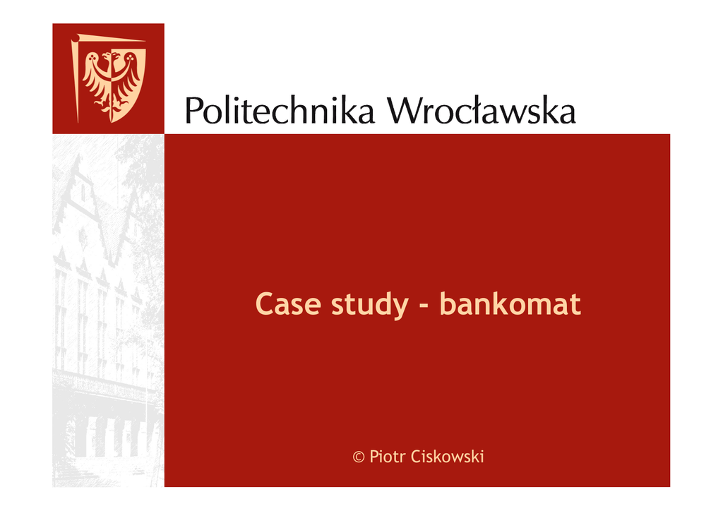 Case study - bankomat © Piotr Ciskowski UML diagram diagramy UML Structure diagram Behavior diagram Class diagram Component diagram Use case diagram Object diagram Deployment diagram Activity diagram Sequence diagram State machine diagram Communication diagram Composite structure diagram Package diagram Profile diagram Interaction diagram Interaction overview diagram Timing diagram CASE STUDY BANKOMAT o tworzenie systemu: wymagania → analiza → projekt → implementacja → testowanie o inżynieria wsteczna: • funkcjonalność • dziedzina • architektura • zachowanie Funkcjonalność PERSPEKTYWA PRZYPADKÓW UŻYCIA – DIAGRAMY PRZYPADKÓW UŻYCIA Bankomat - funkcjonalność o Z jakich bankomatów korzystasz? o Co możesz zrobić przy ich pomocy? o Co inni mogą z nim zrobić? ATM o klient może: ← aktor • podjąć gotówkę ← przypadek użycia • sprawdzić stan konta sprawdzić historię ← przypadek użycia ← przypadek użycia • doładować telefon ← przypadek użycia • wykonać przelew ← przypadek użycia o serwisant może: • naprawić maszynę ← aktor ← przypadek użycia o ochroniarz może: • załadować gotówkę ← aktor ← przypadek użycia Bankomat – diagramy przypadków użycia uc ATM use case diagram ATM account operations + authorize + check balance + check history + purchase cellphone credit + transfer money Customer + withdraw cash «system» Interbank network maintenance + access machine's interior Serviceman + load money + service the machine Securityman Bankomat – diagramy przypadków użycia uc account operations ATM «extend» check balance check history «extend» «extend» authorize withdraw cash «extend» transfer money Customer «extend» purchase cellphone credit Interbank network Bankomat – diagramy przypadków użycia uc maintenance ATM service the machine Serviceman «include» access machine's interior «include» load money Securityman Bankomat – diagramy przypadków użycia – Enterprise Architect Bankomat – diagramy przypadków użycia – Visual Paradigm for UML Bankomat – diagramy przypadków użycia – Visual Studio Bankomat - scenariusze o Z jakich bankomatów najczęściej korzystasz? o Co się wtedy dzieje? - krok po kroku… Bankomat - scenariusze o Z jakich bankomatów najczęściej korzystasz? o Co się dzieje gdy wypłacasz gotówkę z bankomatu? - krok po kroku… Dziedzina, budowa systemu (urządzenia) PERSPEKTYWA LOGICZNA – DIAGRAMY KLAS Bankomat o Opisz bankomat używając prostego języka o Opisz cały kontekst: klienta, bank, kartę, ... Bankomat - dziedzina na podst. Wikipedii (ang.): Bankomat jest skomputeryzowanym urządzeniem telekomunikacyjnym zapewniającym klientom instytucji finansowych dostęp do transakcji finansowych w przestrzeni publicznej, bez potrzeby kontaktu z kasjerem, czy konsultantem. (…) W większości współczesnych bankomatów klient jest identyfikowany przez włożenie plastikowej karty wyposażonej w pasek magnetyczny lub chip, posiadającej unikalny numer oraz zawierającej dodatkowe informacje zabezpieczające, takie jak data ważności i kod CVVC (CVV). Uwierzytelnienie odbywa się przez podanie przez klienta kodu PIN. (…) Przy użyciu bankomatu klient może uzyskać dostęp do swojego konta w banku, aby: wypłacić gotówkę, sprawdzić stan konta, a nawet doładować konto telefonu komórkowego. owns Client 1..2 Account 1..* Plastic card Bank Bankomat - dziedzina na podst. Wikipedii (ang.): W większości współczesnych bankomatów klient jest identyfikowany przez włożenie plastikowej karty wyposażonej w pasek magnetyczny lub chip, posiadającej unikalny numer oraz zawierającej dodatkowe informacje zabezpieczające, takie jak data ważności i kod CVVC (CVV). Uwierzytelnienie odbywa się przez podanie przez klienta kodu PIN. (…) Payment card Plastic card Magnetic card Chip card Credit card The customer is granted a credit line, from which the money is borrowed for payments. The balance may be payed each month in full or partially (in that case an interest is charged) Debit card The funds are withdrawn directly from either the account or the remaining balance of the card Charge card like credit card, except that the ba;ance must be payed in full each month Bankomat - dziedzina na podst. Wikipedii (ang.): W większości współczesnych bankomatów klient jest identyfikowany przez włożenie plastikowej karty wyposażonej w pasek magnetyczny lub chip, posiadającej unikalny numer oraz zawierającej dodatkowe informacje zabezpieczające, takie jak data ważności i kod CVVC (CVV). Uwierzytelnienie odbywa się przez podanie przez klienta kodu PIN. (…) Payment card - Card number :long Cardholder's name :char Expiration date :date Personal Identification Number Bankomat – urządzenie na podst. Wikipedii (ang.): Bankomat składa się zwykle z następujących elementów: - CPU (do obsługi interfejsu użytkownika i sterowania pozostałymi urządzeniami) - czytnik kart magnetycznych i/lub chipowych (do uwierzytelniania klienta) - PIN Pad (…), często umieszczony w zabezpieczonej obudowie - procesor szyfrujący, zwykle w zabezpieczonej obudowie - wyświetlacz (używany przez użytkownika podczas transakcji) - klawisze funkcyjne (zwykle blisko wyświetlacza) lub ekran dotykowy (używany podczas transakcji do wyboru opcji) - drukarka (drukująca potwierdzenia transakcji) - „pancerna” obudowa (z ograniczonym dostępem, a w niej szczególnie ważne części urządzenia) - obudowa (żeby było na czym zawiesić logo ;-) obrazek: Wikipedia Bankomat – urządzenie na podst. Wikipedii (ang.): „Pancerna” obudowa jest specjalnie zabezpieczona przed niepowołanym dostępem, mocno przymocowana do podłoża i zawiera szczególnie ważne elementy maszyny (…) a są to m.in. : - mechanizm wypłacający gotówkę - mechanizm przyjmujący depozyty (w bankomatach umożliwiających deponowanie gotówki): - moduł przetwarzający czeki - moduł przetwarzając
