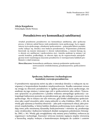 Studia Poradoznawcze 2012 ISSN 2299-4971 Alicja Kargulowa Dolnośląska Szkoła Wyższa Poradnictwo ery komunikacji satelitarnej Artykuł przedstawia poradnictwo ery komunikacji satelitarnej, jako społeczny proces, w którym udział bierze wiele podmiotów życia społecznego. Są to organizatorzy życia społecznego, członkowie społeczeństwa – potencjalni klienci poradni, osoby radzące się, doradcy oraz badacze-poradoznawcy. Wspomniane podmioty kierowały się innymi intencjami w okresie industrializmu, a innymi kierują się w okresie ery satelitarnej i społeczeństwa sieci. Autorka analizuje tę zmianę i jej szeroki kontekst, podkreślając, że obecnie dąży się do wypracowania antropologicznej teorii wyjaśniającej znaczenie poradnictwa w rozwiązywaniu ludzkich problemów w skali światowej. Słowa kluczowe: komunikacja satelitarna, intencje podmiotów społecznych, nowoczesność zwielokrotniona, poradoznawstwo, społeczeństwo sieci Społeczne, kulturowe i technologiczne konteksty rozwoju poradnictwa O poradnictwie najczęściej mówi się jako o interakcji doradcy z radzącym się nawiązanej w bezpośrednim kontakcie międzyosobowym. Rzadko natomiast zwraca się uwagę na obecność poradnictwa w ogólnej przestrzeni życia społecznego, nie analizuje się jego miejsca i zmian jego roli w społeczeństwie jako całości. Tymczasem spojrzenie na poradnictwo z punktu widzenia antropologii społecznej i antropologii kulturowej pozwala na potraktowanie go jako jednego z procesów życia społecznego. Ma to miejsce nie tyle wówczas, gdy krótko zdefiniujemy społeczeństwo jako zespół stosunków jakie wiążą jednostki ze sobą (Giddens, 2005, s. 69), ile wtedy, gdy ujmiemy je bardziej obszernie – jako pole wzajemnych relacji, jako przestrzeń międzyludzką, w której ludzkie działania podtrzymują życie społeczne i nadają temu polu nieustanną dynamikę funkcjonowania i stawania się, przekazując ramy strukturalne i kulturowe kolejnych działań następnym pokoleniom (Sztompka, 2002, s. 36). Wtedy, gdy uwzględnimy rolę zmiany pracy ludzkiej, zwłaszcza jej organizacji i technologii. Zauważyć wówczas możemy napięcia między równością a hierarchią, między wolnym a kontrolowanym dostępem do rynków i centrów 20 Studia Poradoznawcze 2012 administracyjnych, napięcia, które przyczyniają się do różnicowania się współczesnych cywilizacji, decydują o krystalizowaniu się ich ram kulturowych, modyfikują zachodzące w nich procesy społeczne1. Era rolnicza, era przemysłowa, era postindustrialna, to tylko niektóre nazwy poszczególnych okresów rozwoju społeczeństw. W ich obrębie następują zmiany w zakresie wytwarzania dóbr materialnych i duchowych oraz – co dla poradnictwa jest bardzo ważne – tworzenia się nowych stosunków społecznych i szeroko rozumianej międzyludzkiej komunikacji. Chodzi tu nie tylko o zmiany „fizyczne” stwarzające warunki do jej nawiązania, ale także o zmianę jej znaczenia dla połączonych nią osób. Za Mieczysławem Adamczykiem można w krajach cywilizowanych wymienić: erę komunikacji społeczeństw tradycyjnych (działalność kurierów, dyliżansów); erę Gutenberga (wynalazek w połowie XV w. druku i jego zastosowanie); erę telegrafu Morsa (od 1844 r.), erę radiową Marconiego (od 1901 r.); erę telewizyjną (od 1911 r.); erę komputerową (od 1946 r.); erę komunikacji satelitarnej (Adamczyk, 2011, s. 24). Jak widać, komunikacja międzyludzka przeobrażała się wraz z pojawianiem się środków technicznych, zmieniających jej formy i poszerzających jej przestrzenny zasięg, od bezpośredniej w kontaktach face to face po zapośredniczoną, jednakże również stwarzającą jej uczestnikom możliwość obserwacji siebie nawet przy przebywaniu na przeciwnych krańcach Ziemi. Tym razem nie dzięki fizycznej współobecności, ale za pomocą skomplikowanych urządzeń. Społeczeństwo współczesne, społeczeństwo ery komunikacji satelitarnej przede wszystkim kojarzy się nam właśnie z korzystaniem z takich wynalazków technicznych i technologicznych – modyfikujących komunikację, uczestnictwo w różnych wydarzeniach, a nawet pracę – jak Internet, telefon komórkowy lub faks. Aby pełniej określić toczące się w społeczeństwie procesy, pojawiające się fakty i zdarzenia dotyczące ludzi, nie można ograniczyć się jedynie do odkrywania sposobów korzystania z nowoczesnych urządzeń, ale trzeba również wziąć pod uwagę różnorodne intencje, które przyświecają poszczególnym podmiotom używającym tych wynalazków i „po swojemu” współtworzącym współczesną międzyludzką przestrzeń2. W odniesieniu do poradnictwa wskazanie intencji działań poszczególnych podmiotów społecznych jest tym bardziej konieczne, że działalność poradnicza, oparta na międzyludzkiej komunikacji, dotyka głębokich przeżyć ludzi poszukujących pomocy i wchodzących w intymne relacje z doradcą. Bowiem czymś, 1 2 Zdaniem Katza i Kahna, mając na myśli organizację życia społecznego, możemy wyróżnić podsystemy: produkcyjny – (techniczny) przetwarzający energię i informację, wytwarzający dobra materialne i niematerialne; wspierający – innowacje, nowe technologie, lokowanie produktów; scalający – utrzymujący ludzi w systemie poprzez rekrutację, indoktrynację lub socjalizację (szkoły, sądy, kościoły); adaptacyjny – badanie trendów społecznych, planowanie, przekształcanie wewnętrzne organizacji; kierowniczy – sprawowanie władzy, kontrola, koordynacja i kierowanie aktywnością ludzi. Jednoznaczne ulokowanie poradnictwa jest niemożliwe, jednak można upatrywać jego miejsce przede wszystkim w systemie scalającym (Katz, Kahn, 1979, s. 68-80). W naukach społecznych przy wyjaśnianiu zdarzeń intencje „pełnią funkcję analogiczną do terminów teoretycznych w wyjaśnianiu zdarzeń w przyrodzie. Teoretyczny charakter intencji podkreśla te