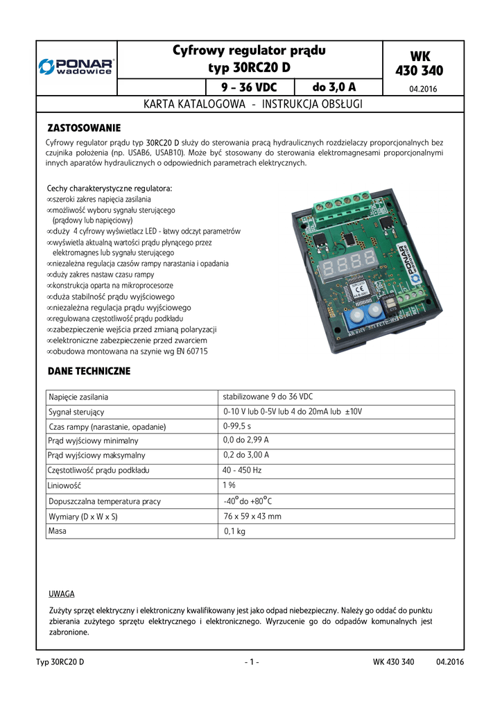 Cyfrowy regulator prądu typ 30RC20 D do 3,0 A 9 - 36 VDC KARTA KATALOGOWA - INSTRUKCJA OBSŁUGI WK 430 340 04.2016 ZASTOSOWANIE Cyfrowy regulator prądu typ 30RC20 D służy do sterowania pracą hydraulicznych rozdzielaczy proporcjonalnych bez czujnika położenia (np. USAB6, USAB10). Może być stosowany do sterowania elektromagnesami proporcjonalnymi innych aparatów hydraulicznych o odpowiednich parametrach elektrycznych. Cechy charakterystyczne regulatora: • szeroki zakres napięcia zasilania • możliwość wyboru sygnału sterującego (prądowy lub napięciowy) • duży 4 cyfrowy wyświetlacz LED - łatwy odczyt parametrów • wyświetla aktualną wartości prądu płynącego przez elektromagnes lub sygnału sterującego • niezależna regulacja czasów rampy narastania i opadania • duży zakres nastaw czasu rampy • konstrukcja oparta na mikroprocesorze • duża stabilność prądu wyjściowego • niezależna regulacja prądu wyjściowego • regulowana częstotliwość prądu podkładu • zabezpieczenie wejścia przed zmianą polaryzacji • elektroniczne zabezpieczenie przed zwarciem • obudowa montowana na szynie wg EN 60715 DANE TECHNICZNE Napięcie zasilania stabilizowane 9 do 36 VDC Sygnał sterujący 0-10 V lub 0-5V lub 4 do 20mA lub ±10V Czas rampy (narastanie, opadanie) 0-99,5 s Prąd wyjściowy minimalny 0,0 do 2,99 A Prąd wyjściowy maksymalny 0,2 do 3,00 A Częstotliwość prądu podkładu 40 - 450 Hz Liniowość 1% Dopuszczalna temperatura pracy -40 do +80 C Wymiary (D x W x S) 76 x 59 x 43 mm Masa 0,1 kg o o UWAGA Zużyty sprzęt elektryczny i elektroniczny kwalifikowany jest jako odpad niebezpieczny. Należy go oddać do punktu zbierania zużytego sprzętu elektrycznego i elektronicznego. Wyrzucenie go do odpadów komunalnych jest zabronione. Typ 30RC20 D -1- WK 430 340 04.2016 PROCEDURA USTAWIANIA Uwaga: · Przed przystąpieniem do konfiguracji parametrów należy ustawić przełącznik we właściwej pozycji oraz dokonać ustawienia właściwego typu sygnału sterującego "in" dla danego systemu. Standardowo sygnał sterujący (parametr: "in") ustawiony jest na 10 (sygnał napięciowy 0-10V) · Zastosowanie niewłaściwego sygnału wejściowego do ustawionego typu sygnału sterującego na regulatorze może być szkodliwe dla regulatora i może spowodować wystąpienia błędu i sygnalizację "ERROR". Ustawienie: 1. Po włączeniu zasilania na wyświetlaczu pojawia się wartość prądu wyjściowego elektromagnesu (A lub B), lub wartość sygnału zadanego (napięciowego lub prądowego). Kropka dziesiętna będzie pulsować (szybkość pulsowania kropki dziesiętnej określona jest w PARAMETRY I ZAKRESY) 2. Obrócić pokrętłem SELECT, aby wejść w tryb regulacji. Tryb regulacji jest sygnalizowany wyświetlaniem odpowiedniego dla danego parametru skrótu. 3. Po wybraniu parametru, który chcemy zmienić należy obrócić pokrętłem ADJUST w prawo lub w lewo, aby wybrać odpowiednią wartość. 4. Aby zmienić inny parametr, ponownie obrócić pokrętłem SELECT aby wybrać dany parametr, a następnie postępować wg pkt.3 5. Regulator w trakcie ustawiania jest w pełni funkcjonalny, wprowadzane zmiany parametrów są realizowane na bieżąco. 6. Aby zapisać nowe ustawienia w pamięci regulatora i powrócić do normalnego trybu pracy, należy odczekać 100 sekund lub obrócić pokrętłem SELECT aby wybrać parametr SA (SAVE SETINGS), a następnie obróć pokrętłem ADJUST od 0 do 2. 7. Po zapisaniu ustawień wyślwietlacz pokaże wartość prądu wyjściowego lub wartość sygnału zadanego (w zależności od ustawionej wartośći parametru "di"), kropka dziesiętna będzie pulsować. 8. Jeśli nie chcemy zapamiętać nowych ustawień, należy odłączyć regulator od napięcia zasilania przed upływem 100 sekund. 9. Aby powrócić do ustawień fabrycznych należy obrócić pokrętłem SELECT i wybrać parametr "rFP", a następnie obrócić pokrętłem ADJUST od 0 do 10, do zresetowania wyświetlacza. UWAGA: Dla punktu 9, po przywróceniu ustawień fabrycznych może być konieczne ponowne ustawienie typu sygnału sterującego "in". PARAMETRY I ZAKRESY A Hi: A Lo: ArUP: Ardn: b Hi: b Lo brUP brdn Cdb: JC dFr: in: di: SA: rFP: Err: CLr: Elektromagnes A HIGH, maksymalny prąd wyjściowy, 0,20 do 3,00 [A] * Elektromagnes A LOW, minimalny prąd wyjściowy, 0,00 do 2,99 [A] * Elektromagnes A RAMP UP, rampa narastająca - czas narastania prądu wyjściowego; 0,0 do 99,5 [s] Elektromagnes A RAMP DOWN, rampa opadająca - czas opadania prądu wyjściowego; 0,0 do 99,5 [s] Elektromagnes B HIGH, maksymalny prąd wyjściowy, 0,20 do 3,00 [A] * Elektromagnes B LOW, minimalny prąd wyjściowy, 0,00 do 2,99 [A] * Elektromagnes B RAMP UP, rampa narastająca - czas narastania prądu wyjściowego; 0,0 do 99,5 [s] Elektromagnes B RAMP DOWN, rampa opadająca - czas opadania prądu wyjściowego; 0,0 do 99,5 [s] COMMAND DEADBAND, obszar niewrażliwości na sygnał sterujący, 0-5 [%] JOYSTICK CALIBRATION / INPUT OFFSET COMPENSATION, regulacja punktu przełączenia pomiedzy elektromagnesem A i B; standardowo 50% sygnału wejściowego; zakres regulacji 40 - 60 [%] DITHER FREQUENCY, częstotliwość prądu podkładu (PWM), 40 do 450 [Hz] INPUT SIGNAL SELECTION, wybór typu sygnału sterującego; 5 (0-5V) lub 10 (0-10V) lub 420 (4-20 mA) lub -10 (±10V) wymaga zmiany ustawienia położenia przełącznika DISPLAYED SIGNAL, ustawienie wyświetlanej wartości; 0 - sygnał sterujący napięciowy [V] lub prądowy [mA], 1 - prąd wyjściowy [A], pulsująca krpka dziesiętna na wyświetlaczu wskazuje obecny tryb wyświetlacza: · szybkie pulsowanie kropki dziesiętnej, kilka razy na sekundę, wskazuje "di" = 0 · wolne pulsowanie kropki dziesiętnej, jeden raz na sekundę, wskazuje "di" = 1 · brak pulswania lub brak kropki dziesiętnej, wyświetlacz jest w trybie USTAWIENIA SAVE SETTINGS, zapis ustawień, patrz PROCEDURA USTAWIANIA pkt 6. RESET FACTORY PARAMETERS, przywracanie