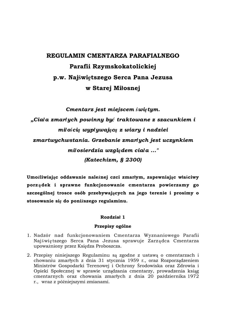 REGULAMIN CMENTARZA PARAFIALNEGO Parafii Rzymskokatolickiej p.w. Najświętszego Serca Pana Jezusa w Starej Miłosnej Cmentarz jest miejscem świętym. „Ciała zmarłych powinny być traktowane z szacunkiem i miłością wypływającą z wiary i nadziei zmartwychwstania. Grzebanie zmarłych jest uczynkiem miłosierdzia wzglądem ciała ..." (Katechizm, § 2300) Umożliwiając oddawanie należnej czci zmarłym, zapewniając właściwy porz ą dek i sprawne funkcjonowanie cmentarza powierzamy go szczególnej trosce osób przebywających na jego terenie i prosimy o stosowanie się do poniższego regulaminu. Rozdział 1 Przepisy ogólne 1. Nadzór nad funkcjonowaniem Cmentarza Wyznaniowego Parafii Naj ś wi ę tszego Serca Pana Jezusa sprawuje Zarz ą dca Cmentarza upoważniony przez Księdza Proboszcza. 2. Przepisy niniejszego Regulaminu są zgodne z ustawą o cmentarzach i chowaniu zmarłych z dnia 31 stycznia 1959 r., oraz Rozporządzeniem Ministrów Gospodarki Terenowej i Ochrony Środowiska oraz Zdrowia i Opieki Społecznej w sprawie urządzania cmentarzy, prowadzenia ksiąg cmentarnych oraz chowania zmarłych z dnia 20 października 1972 r., wraz z późniejszymi zmianami. 3. Regulamin rozróżnia trzy zasadnicze typy usług świadczonych na terenach cmentarzy: - usługi cmentarne (zarządzanie cmentarzem), - usługi pogrzebowe, - usługi kamieniarskie. 4. Ilekroć w Regulaminie jest mowa o: - zarządzaniu cmentarzem – rozumie się przez to usługi cmentarne, do których należy: przyjmowanie zwłok do pochowania i zawieranie umów o użytkowanie grobu, przyjmowanie opłat cmentarnych, prowadzenie przewidzianej prawem ewidencji i dokumentacji, utrzymanie porządku, kopanie, murowanie i zasypywanie grobów, ekshumacje, obs ł uga uroczysto ś ci pogrzebowych i piecza nad ich godnym przebiegiem, troska o bezpieczeństwo osób i mienia, wykonywanie wszelkich prac związanych z ogrodzeniem, zagospodarowaniem i utrzymaniem terenu cmentarza, które to czynnoś ci nale ż ą do kompetencji Zarządcy. - usługach pogrzebowych – rozumie się przez to eksportację zwłok z miejsca zgonu do miejsca przechowywania, przewóz zwłok w kraju i na trasach międzynarodowych, przechowywanie zwłok, przygotowanie zwłok do pogrzebu, transport zwłok do miejsca grzebania i obsługa, załatwianie wszelkich spraw związanych z pochówkiem (odbiór karty zgonu, zakup miejsca, uzgadnianie terminu pogrzebu), sprzedaż trumien, urn, tablic, kwiatów, klepsydr i innych akcesoriów. - usługach kamieniarskich – rozumie się przez to wykonywanie wszelkich czynności związanych z montażem, demontażem lub naprawą nagrobka i opaski wokół nagrobka. - dysponencie grobu – rozumie się przez to osobę, która ma zawartą z Parafią umowę na użytkowanie grobu, w imieniu i za zgodą wszystkich osób posiadających do niego prawo. - prawie do grobu – rozumie się przez to określenie zakresu, czyli przedmiotu osobistych i materialnych uprawnień najbliższej rodziny wobec miejsca pochowania bliskiej osoby. Obejmuje to w szczególno ś ci dochowanie, przebudow ę grobu, ekshumacj ę , postawienie nagrobka i inne czynności z tym związane. - prawie do pochowania – rozumie się przez to określenie podmiotów w porządku określonym przez art. 10 ust. o cmentarzach i chowaniu zmarłych, posiadających uprawnienia do pochówku i w konsekwencji do miejsca pochowania osoby bliskiej. - grobie murowanym – rozumie się przez to dół, w którym boki są murowane a nad trumną wykonuje się sklepienie. - grobie ziemnym – rozumie się przez to dół, w którym chowa się trumnę ze zwłokami i zasypuje ziemia wydobytą z tego dołu. - grobie urnowym — rozumie się przez to rodzaj grobu murowanego o określonych wymiarach. 5. Parafia jest właścicielem gruntów, drzewostanu i grobów, jako ściśle związanych z gruntem i wszystkich urządzeń znajdujących się na terenach cmentarzy. Za właścicieli nagrobków uważa się dysponentów grobów. 6. Zarządca wykonuje usługi cmentarne na podstawie niniejszego regulaminu stosując określone procedury i formularze pism oraz zawiera stosowne umowy z innymi podmiotami. 7. Wobec osób nie stosujących się do regulaminu będą wyciągane konsekwencje prawne i administracyjne. Rozdział 2 Przepisy porządkowe 1. Osoby przebywaj ą ce na terenie cmentarza obowi ą zane s ą do zachowania ciszy, powagi i szacunku należnego zmarłym, dbania o porządek i czystość na odwiedzanych grobach i na terenie całego cmentarza. 2. Wszelkie prace przy grobach (w szczególności budowa katakumb, stawienie nagrobków, wykonanie opasek wokół nagrobków), które wpływają na kształt architektury cmentarza winny być zgłaszane w kancelarii cmentarza. 3. Niedozwolone jest na terenie cmentarza: - deptanie po grobach, - przebywanie osób w stanie nietrzeźwym, palenie papierosów, - niszczenie zieleni i pojemników na śmieci, - wyrzucanie śmieci w miejscach do tego nie przeznaczonych, - wprowadzanie psów i innych zwierząt, - jazda na rowerze, - ustawianie ławek bez zezwolenia, sadzenie drzew i krzewów. Postawione dotychczas ławki i nasadzone drzewa i krzewy mogą być usunięte przez pracowników Zarządcy, - handlowanie i zarobkowanie w inny sposób bez zgody Zarządcy, - wjeżdżanie pojazdami mechanicznymi bez zgody Zarządcy. 4. Krzyże mogą być ustawiane wyłącznie na mogiłach (umocowane trwale). Symbole religijne i inne elementy nagrobków ustawione na przejściach lub położone na mogiłach (nietrwale), mogą być usunięte przez pracowników Zarządcy. 5. Miejsca grzebalne podlegają opłatom za użytkowanie. 6. Cmentarz jest otwarty od godz. 700 do zmroku. Przebywanie na cmentarzu po zmroku jest zabronione. 7. Dzieci w wieku przedszkolnym mogą przebywać na cmentarzu tylko pod opieką dorosłych. 8. Proboszcz Parafii przyjmuje interesantów w Kancelarii Parafialnej ul. Borkowska 1. 9. Kancelaria cmentarna czynna jest po wcześniejszym uzgodnieniu telefo