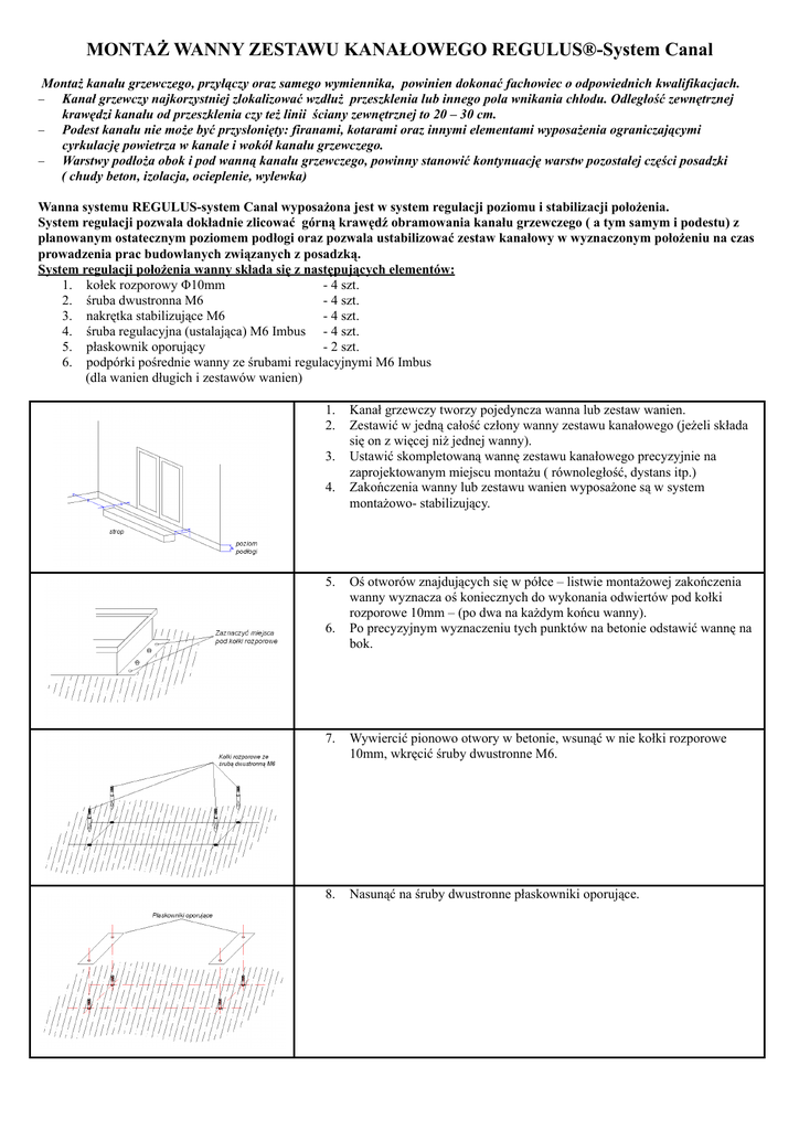 MONTAŻ WANNY ZESTAWU KANAŁOWEGO REGULUS®-System Canal Montaż kanału grzewczego, przyłączy oraz samego wymiennika, powinien dokonać fachowiec o odpowiednich kwalifikacjach. Kanał grzewczy najkorzystniej zlokalizować wzdłuż przeszklenia lub innego pola wnikania chłodu. Odległość zewnętrznej krawędzi kanału od przeszklenia czy też linii ściany zewnętrznej to 20 – 30 cm. − Podest kanału nie może być przysłonięty: firanami, kotarami oraz innymi elementami wyposażenia ograniczającymi cyrkulację powietrza w kanale i wokół kanału grzewczego. − Warstwy podłoża obok i pod wanną kanału grzewczego, powinny stanowić kontynuację warstw pozostałej części posadzki ( chudy beton, izolacja, ocieplenie, wylewka) − Wanna systemu REGULUS-system Canal wyposażona jest w system regulacji poziomu i stabilizacji położenia. System regulacji pozwala dokładnie zlicować górną krawędź obramowania kanału grzewczego ( a tym samym i podestu) z planowanym ostatecznym poziomem podłogi oraz pozwala ustabilizować zestaw kanałowy w wyznaczonym położeniu na czas prowadzenia prac budowlanych związanych z posadzką. System regulacji położenia wanny składa się z następujących elementów: 1. kołek rozporowy Φ10mm - 4 szt. 2. śruba dwustronna M6 - 4 szt. 3. nakrętka stabilizujące M6 - 4 szt. 4. śruba regulacyjna (ustalająca) M6 Imbus - 4 szt. 5. płaskownik oporujący - 2 szt. 6. podpórki pośrednie wanny ze śrubami regulacyjnymi M6 Imbus (dla wanien długich i zestawów wanien) 1. 2. 3. 4. 5. 6. Kanał grzewczy tworzy pojedyncza wanna lub zestaw wanien. Zestawić w jedną całość człony wanny zestawu kanałowego (jeżeli składa się on z więcej niż jednej wanny). Ustawić skompletowaną wannę zestawu kanałowego precyzyjnie na zaprojektowanym miejscu montażu ( równoległość, dystans itp.) Zakończenia wanny lub zestawu wanien wyposażone są w system montażowo- stabilizujący. Oś otworów znajdujących się w półce – listwie montażowej zakończenia wanny wyznacza oś koniecznych do wykonania odwiertów pod kołki rozporowe 10mm – (po dwa na każdym końcu wanny). Po precyzyjnym wyznaczeniu tych punktów na betonie odstawić wannę na bok. 7. Wywiercić pionowo otwory w betonie, wsunąć w nie kołki rozporowe 10mm, wkręcić śruby dwustronne M6. 8. Nasunąć na śruby dwustronne płaskowniki oporujące. 9. Założyć ocieplenie pod wannę zgodnie z projektem przebijając je śrubami dwustronnymi. W miejscach przechodzenia śrub regulacyjnych przez warstwę ocieplenia należy wyciąć w ociepleniu okienko aż do płaskownika oporującego. 10. Osadzić wannę kanału na śrubach dwustronnych. 11. Wkręcić śruby regulacyjne imbusowe do nakrętek listwy montażowej. Poprzez dalsze wkręcanie śrub regulacyjnych unosić wannę aż nastąpi zrównanie górnej krawędzi obramowania z ostateczną, dokładnie wyznaczoną powierzchnią podłogi. Ważne! Po zakończeniu tej czynności, obydwa końce wanny ( zestawu wanien), powinny znaleźć się na tym samym poziomie. Wymagana duża precyzja wykonania !! 12. Po ustaleniu wysokości wanny kanału i jej wypoziomowaniu na śruby dwustronne, na których osadziliśmy wannę ( zestaw) nakręcić do oporu nakrętki M6 stabilizując ostatecznie położenie wanny. INFORMACJA WYJAŚNIAJĄCA Śruby regulacyjne imbusowe M6 wspierają się na płaskowniku oporującym i zabezpieczają koniec wanny kanału przed jej opadnięciem, natomiast nakrętki na śrubach dwustronnych mają na celu zabezpieczenie wanny kanału przed jej uniesieniem. 13. Po ustabilizowaniu i dokładnym wypoziomowaniu samych zakończeń wanny kanału, w przypadku wanien długich, łamanych czy też zestawów wanien należy je dodatkowo wesprzeć za pomocą dołączonych płaskowników również zaopatrzonych w śruby regulacyjne. Płaskowniki te ułatwiają wypoziomowanie wanny (zestawu) na całej długości, zabezpieczają wannę przed ugięciem i opadnięciem oraz ułatwiają jej prostoliniowe ustawienie. Na czas wykonywania wylewek i innych prac w miejscach lokalizacji podparć pośrednich wannę najlepiej dociążyć tak, by jej położenie w poziomie i pionie nie zmieniło się (by nie uległa przepchnięciu lub uniesieniu poprzez płynną wylewkę czy też np. piankę montażową). 14. Opcjonalnie założyć ocieplenie na ściankach bocznych wanny poniżej wylewki. 15. Uzupełnić wylewkę podłogi tak, aby opierało się na niej obramowanie wanny kanału. Obramowanie przenosi obciążenie podestu na podłoże. 16. Zachowanie odpowiedniego, stałego dystansu pomiędzy krawędziami obramowania uzyskujemy poprzez samodzielnie wykonane rozpórki dystansowe lub poprzez zastosowanie rozpórek fabrycznych. 17. Gęstość rozlokowania rozpórek zależy od technologii wykonania uzupełnienia wypełnienia wokół wanny ( 0,5 – 1m). 18. Na czas prowadzenia dalszych prac budowlanych wnętrze wanny kanału można zabezpieczyć dokładnie wyciętą na wymiar podestu płytą. Pokrycie takie zabezpieczy wnętrze kanału przed zabrudzeniem oraz ustabilizuje obramowanie wanny. Właściwy podest zakładamy po zakończeniu robót budowlanych.