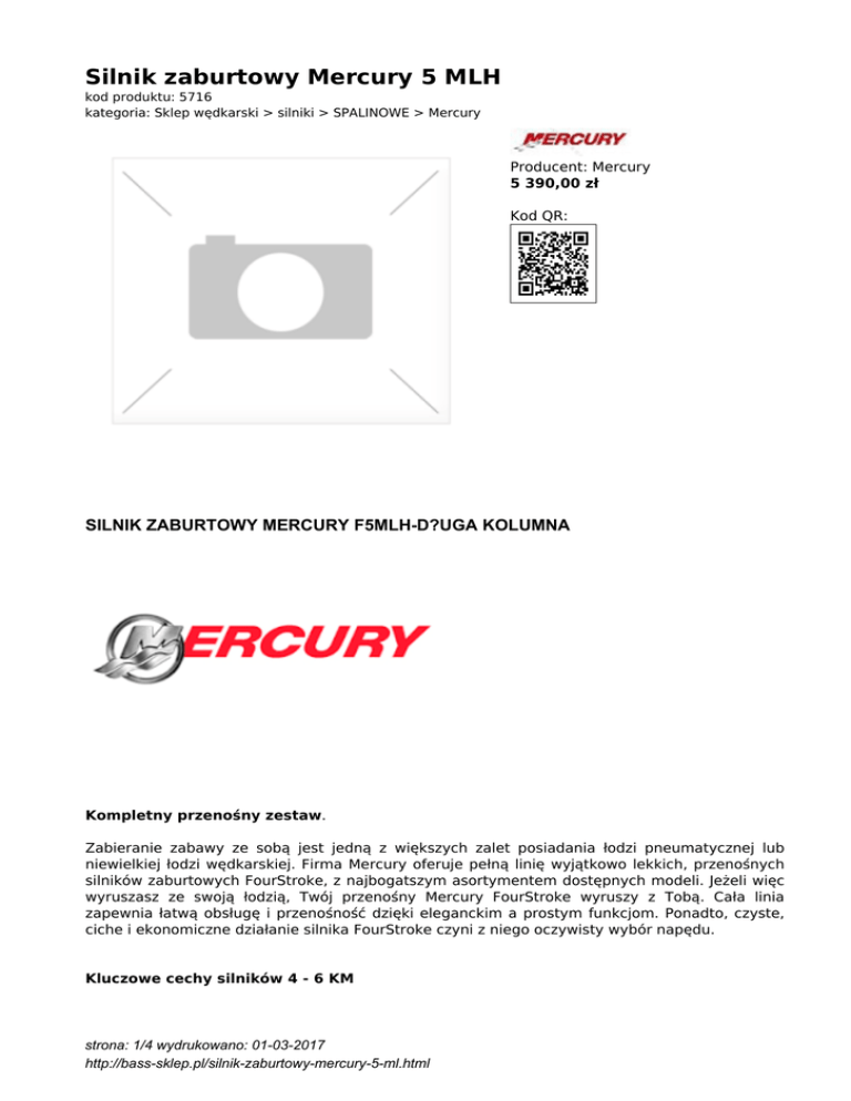 Silnik zaburtowy Mercury 5 MLH kod produktu: 5716 kategoria: Sklep wędkarski > silniki > SPALINOWE > Mercury Producent: Mercury 5 390,00 zł Kod QR: SILNIK ZABURTOWY MERCURY F5MLH-D?UGA KOLUMNA Kompletny przenośny zestaw. Zabieranie zabawy ze sobą jest jedną z większych zalet posiadania łodzi pneumatycznej lub niewielkiej łodzi wędkarskiej. Firma Mercury oferuje pełną linię wyjątkowo lekkich, przenośnych silników zaburtowych FourStroke, z najbogatszym asortymentem dostępnych modeli. Jeżeli więc wyruszasz ze swoją łodzią, Twój przenośny Mercury FourStroke wyruszy z Tobą. Cała linia zapewnia łatwą obsługę i przenośność dzięki eleganckim a prostym funkcjom. Ponadto, czyste, ciche i ekonomiczne działanie silnika FourStroke czyni z niego oczywisty wybór napędu. Kluczowe cechy silników 4 - 6 KM strona: 1/4 wydrukowano: 01-03-2017 http://bass-sklep.pl/silnik-zaburtowy-mercury-5-ml.html Łatwy rozruch linką Standardowy system automatycznej dekompresji cylindra znacznie redukuje siłę ciągnienia zapewniając rozruch bez wysiłku – a więc każdy członek rodziny może z łatwością uruchomić silnik. Championi wagi lekkiej Przy ciężarze jedynie 55 funtów (25 kg) model 6 KM jest najlżejszym silnikiem w swojej klasie. Zwarta, lekka konstrukcja czyni go prawdziwie zaburtowym w ruchu. Wyjątkowy wydech poprzez system napędu śruby. Żaden inny czterosuwowy silnik 6 KM na rynku nie oferuje, zapewniającego ciche i przyjemne działanie, wydechu przez system napędu śruby. Zintegrowany zbiornik paliwa Wszystkie modele standardowo dostarczane s? ze zintegrowanym zbiornikiem o pojemno?ci 0,3 galona USA / 1 litra Specyfikacje silnika 5 FourStroke KM/kW na wale Obr./min. przy pełnym otwarciu przepustnicy Konfiguracja cylindrów Pojemność skokowa (CID / cm3) Rozwiert i skok (cale / mm) 5 / 3,7 4500-5500 1 7,5 / 123 2,32 x 1,77 cala 59 x 45mm System zasilania paliwem Zapłon 2 zawory z górnozaworowy) popychaczami (silnik CDI z elektronicznym wyprzedzeniem iskry System paliwowy Gaźnikowy Prąd alternatora 4 A dla oświetlenia/ 2 A dla ładowania; 50 W strona: 2/4 wydrukowano: 01-03-2017 http://bass-sklep.pl/silnik-zaburtowy-mercury-5-ml.html dla oświetlenia (opcjonalny) System chłodzenia 25 Ręczny Przełożenie przekładni 2,15:1 Układ biegów F-N-R Rumpel Pozycje trymowania 6 System wydechowy Poprzez system napędowy Napęd dla wód płytkich Tak Zakres trymowania dla wód płytkich (stopnie) 16 Zalecany olej Zalecane paliwo Zintegrowany zbiornik paliwa (gal. / l) Mercury 4-Stroke Outboard Oil 87 oktanów / do 10% etanolu 0,3 / 1,0 Opcjonalny zbiornik paliwa (gal. / l) 3,2/12 System ostrzegania operatora przez zabezpieczenie silnika Niskie ciśnienie oleju Nadmierne obroty Długość wału W dla Chłodzony wodą, z termostatem Rozruch Sterowanie / 15 cali (381mm) 20 cali (508 mm) strona: 3/4 wydrukowano: 01-03-2017 http://bass-sklep.pl/silnik-zaburtowy-mercury-5-ml.html ładowania 25 cali (635mm) Ciężar na sucho * Najlżejszy dostępny model Klasyfikacja CARB Star 57lbs / 26kg 3 strona: 4/4 wydrukowano: 01-03-2017 http://bass-sklep.pl/silnik-zaburtowy-mercury-5-ml.html