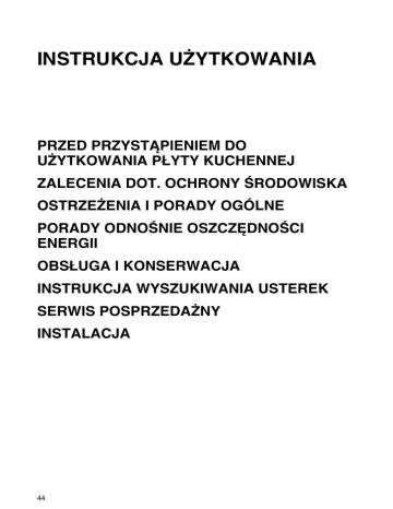 INSTRUKCJA UŻYTKOWANIA PRZED PRZYSTĄPIENIEM DO UŻYTKOWANIA PŁYTY KUCHENNEJ ZALECENIA DOT. OCHRONY ŚRODOWISKA OSTRZEŻENIA I PORADY OGÓLNE PORADY ODNOŚNIE OSZCZĘDNOŚCI ENERGII OBSŁUGA I KONSERWACJA INSTRUKCJA WYSZUKIWANIA USTEREK SERWIS POSPRZEDAŻNY INSTALACJA 44 PRZED PRZYSTĄPIENIEM DO UŻYTKOWANIA PŁYTY KUCHENNEJ Niniejsza instrukcja obowiązuje jedynie w krajach, których symbole umieszczone są na tylnej okładce instrukcji obsługi oraz na urządzeniu. Aby osiągnąć pełną satysfakcję z płyty kuchennej, należy uważnie przeczytać instrukcję i zachować ją na przyszłość. Materiały z opakowania (plastikowe worki, części polistyrenowe itd.) stanowią potencjalne zagrożenie i należy trzymać je poza zasięgiem dzieci. Sprawdzić, czy podczas transportu płyta kuchenna nie uległa uszkodzeniu. Instalacja i podłączenie elektryczne powinny być wykonane przez wykwalifikowanego technika, zgodnie z instrukcjami producenta i lokalnymi przepisami bezpieczeństwa. ZALECENIA DOT. OCHRONY ŚRODOWISKA 1. Opakowanie Materiał z opakowania nadaje się całkowicie do przetworzenia i jest oznaczony symbolem recyklingu , który oznacza, że materiał ten musi być dostarczony do lokalnego zakładu utylizacji odpadów. Piekarnik Niniejsze urządzenie posiada oznaczenia zgodnie z Dyrektywą Europejską 2002/96/WE w sprawie zużytego sprzętu elektrycznego i elektronicznego (WEEE). Zapewniając prawidłowe złomowanie niniejszego urządzenia przyczynią się Państwo do ograniczenia ryzyka wystąpienia negatywnego wpływu produktu na środowisko i zdrowie ludzi. Symbol na urządzeniu lub w dokumentacji do niego dołączonej oznacza, że urządzenia nie należy utylizować jak zwykłych odpadów domowych. Należy oddać je do punktu zajmującego się utylizacją i recyklingiem urządzeń elektrycznych i elektronicznych. Prowadzący zbieranie, w tym lokalne punkty zbiórki, sklepy oraz gminne jednostki, tworzą odpowiedni system umożliwiający oddanie tego sprzętu. W celu uzyskania dodatkowych informacji dotyczących przetwarzania, odzyskiwania oraz recyklingu niniejszego produktu należy skontaktować się z odpowiednimi urzędami, punktami zbiórki odpadów komunalnych lub ze sklepem, w którym produkt został zakupiony. 45 OSTRZEŻENIA I PORADY OGÓLNE Przed czyszczeniem lub konserwacją należy odłączyć płytę kuchenną od zasilania. Urządzenie nie może być obsługiwane przez osoby (włącznie z dziećmi) o ograniczonych zdolnościach psychicznych, sensorycznych lub mentalnych, niedysponujące dostatecznym doświadczeniem lub dostateczną wiedzą, chyba że obsługa urządzenia będzie przebiegać pod nadzorem oraz po odpowiednim poinstruowaniu przez osobę odpowiedzialną za bezpieczeństwo takich osób. Stosowanie urządzeń gazowych powoduje powstanie ciepła oraz wilgotności w pomieszczeniu. Należy sprawdzić, czy pomieszczenie posiada odpowiednią wentylację lub zainstalować okap z przewodem wyciągowym. Przy długotrwałej pracy, konieczna może być dodatkowa wentylacja (otwarcie okna lub zwiększenie mocy wyciągu w okapie). Nie pozwalać dzieciom zbliżać się do urządzenia, gdy jest włączone i zaraz po jego wyłączeniu. Po użyciu, sprawdzić, czy pokrętła są na pozycji (wyłączone), oraz zamknąć główny zawór doprowadzenia gazu lub zawór w butli z gazem. Ostrzeżenie: pokrywa (jeśli dostarczona) może pęknąć, w przypadku przegrzania. Przed jej zamknięciem, należy sprawdzić, czy wszystkie palniki zostały wyłączone. Ostrzeżenie: Ochronne podkładki gumowe na kratkach mogą prowadzić do zadławienia małych dzieci. Po oczyszczeniu kratek, należy sprawdzić, czy gumowe podkładki są prawidłowo zamontowane. Deklaracja zgodności Płyta kuchenna została zaprojektowana, wyprodukowana i wprowadzona na rynek zgodnie z: - wymogami bezpieczeństwa Dyrektywy Gazowej EWG nr 90/396; - wymogami bezpieczeństwa Dyrektywy Niskonapięciowej 2006/95/WE (zastępującej Dyrektywę 73/23/EWG) - warunkami ochrony UE podanymi w dyrektywie “EMC” 89/336; - wymogami dyrektywy EWG 93/68. Płyta kuchenna została zaprojektowana do użytku z produktami spożywczymi i jest zgodna z Rozporządzeniem (WE) 1935/2004. Płyta kuchenna (klasa 3) jest przeznaczona wyłącznie do gotowania. Jakiekolwiek inne użycie (np. ogrzewanie pomieszczeń) jest niewłaściwe i niebezpieczne. PORADY ODNOŚNIE OSZCZĘDNOŚCI ENERGII Płyta kuchenna wyposażona jest w palniki gazowe oraz / lub pola grzewcze o różnych średnicach. Używane czajniki lub garnki powinny mieć średnicę dna równą lub nieco większą niż palnik gazowy lub pole grzewcze. stosować tylko garnki i patelnie o płaskim dnie. Garnki oraz patelnie nie mogą sięgać panelu z pokrętłami. Palnik Średnica naczynia Duży (9,1 cm) Średni (6,4 cm) Mały (4,5 cm) Z potrójną koroną (12 cm) Typ brytfanny (23 cm x 4,5 cm) od 24 do 26 cm 16 do 22 cm od 8 do 14 cm od 24 do 26 cm 16 do 35 cm Jeśli to możliwe, należy przykrywać naczynia. Aby skrócić czas gotowania, warzywa, ziemniaki, itp. należy przygotowywać dodając niewielką ilość wody. Stosując naczynia ciśnieniowe, można zmniejszyć pobór mocy oraz długość gotowania. 46 NIE! OBSŁUGA I KONSERWACJA Czyszczenie powierzchni płyty kuchennej, kratek oraz panelu sterowania Ważne: do czyszczenia płyty nie wolno stosować parowych urządzeń czyszczących. Przed czyszczeniem płyty kuchennej, należy odłączyć zasilanie i odczekać, aż płyta ostygnie. Wytrzeć ją szmatką zamoczoną w gorącej wodzie i mydle lub rozcieńczonym, płynnym detergencie. Nie używać produktów korozyjnych, ściernych, chlorowych lub myjek metalowych. Nie używać parowych urządzeń czyszczących. Nie stosować produktów łatwopalnych. Nie pozostawiać na płycie rozlanych substancji kwaśnych lub alkalicznych, jak np. ocet, sól lub sok cytrynowy itd. Powierzchnia ze stali nierdzewnej Czyścić przy pomocy specjalnych środków. Uwaga: jeśli 