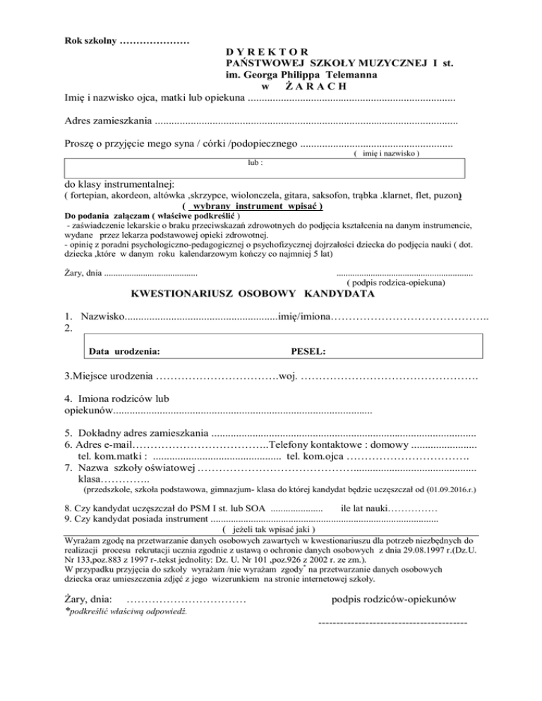 Rok szkolny ………………… DYREKTOR PAŃSTWOWEJ SZKOŁY MUZYCZNEJ I st. im. Georga Philippa Telemanna w ŻARACH Imię i nazwisko ojca, matki lub opiekuna ............................................................................ Adres zamieszkania ............................................................................................................... Proszę o przyjęcie mego syna / córki /podopiecznego ........................................................ ( imię i nazwisko ) lub : do klasy instrumentalnej: ( fortepian, akordeon, altówka ,skrzypce, wiolonczela, gitara, saksofon, trąbka .klarnet, flet, puzon) ( wybrany instrument wpisać ) Do podania załączam ( właściwe podkreślić ) - zaświadczenie lekarskie o braku przeciwskazań zdrowotnych do podjęcia kształcenia na danym instrumencie, wydane przez lekarza podstawowej opieki zdrowotnej. - opinię z poradni psychologiczno-pedagogicznej o psychofizycznej dojrzałości dziecka do podjęcia nauki ( dot. dziecka ,które w danym roku kalendarzowym kończy co najmniej 5 lat) Żary, dnia ......................................... ............................................................ ( podpis rodzica-opiekuna) KWESTIONARIUSZ OSOBOWY KANDYDATA 1. Nazwisko........................................................imię/imiona…………………………………….. 2. Data urodzenia: PESEL: 3.Miejsce urodzenia …………………………….woj. …………………………………………. 4. Imiona rodziców lub opiekunów............................................................................................... 5. Dokładny adres zamieszkania ................................................................................................. 6. Adres e-mail………………………………..Telefony kontaktowe : domowy ........................ tel. kom.matki : ............................................... tel. kom.ojca ……………………………. 7. Nazwa szkoły oświatowej .……………………………………............................................. klasa………….. (przedszkole, szkoła podstawowa, gimnazjum- klasa do której kandydat będzie uczęszczał od (01.09.2016.r.) 8. Czy kandydat uczęszczał do PSM I st. lub SOA ..................... ile lat nauki…………… 9. Czy kandydat posiada instrument ........................................................................................... ( jeżeli tak wpisać jaki ) Wyrażam zgodę na przetwarzanie danych osobowych zawartych w kwestionariuszu dla potrzeb niezbędnych do realizacji procesu rekrutacji ucznia zgodnie z ustawą o ochronie danych osobowych z dnia 29.08.1997 r.(Dz.U. Nr 133,poz.883 z 1997 r-.tekst jednolity: Dz. U. Nr 101 ,poz.926 z 2002 r. ze zm.). W przypadku przyjęcia do szkoły wyrażam /nie wyrażam zgody* na przetwarzanie danych osobowych dziecka oraz umieszczenia zdjęć z jego wizerunkiem na stronie internetowej szkoły. Żary, dnia: …………………………… *podkreślić właściwą odpowiedź. podpis rodziców-opiekunów -----------------------------------------