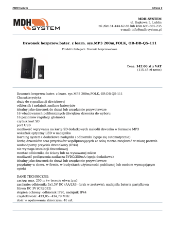 MDH System Strona 1 MDH-SYSTEM ul. Bajkowa 5, Lublin tel./fax.81-444-62-85 lub kom.693-865-235 e mail: [email protected] Dzwonek bezprzew.bater. z learn. sys.MP3 200m,FOLK, OR-DB-QS-111 Produkt z kategorii: Dzwonki bezprzewodowe Cena: 142.00 zł z VAT (115.45 zł netto) Dzwonek bezprzew.bater. z learn. sys.MP3 200m,FOLK, OR-DB-QS-111 Charakterystyka służy do sygnalizacji dźwiękowej odbiornik i nadajnik zasilane bateryjnie idealny jako dzwonek do drzwi lub urządzenie przywoławcze 16 wbudowanych polifonicznych dźwięków dzwonka do wyboru 16 poziomów regulacji głośności czytnik kart SD port USB możliwość wgrywania na kartę SD dodatkowych melodii dzwonka w formacie MP3 wskaźnik optyczny LED w nadajniku learning system ( dodatkowe nadajniki i odbiorniki loguje się automatycznie) liczbę dzwonków oraz przycisków współpracujących ze sobą można zwiększać w miarę potrzeb wodoodporny przycisk dzwonkowy (IP44) nie wymaga instalacji dzwonkowej montaż odbiornika do ściany lub na wysuwanej nóżce możliwość podłączenia zasilacza 5VDC/350mA (opcja dodatkowa) idealny jako dzwonek do drzwi lub urządzenie przywoławcze przydatny w domu, w firmie, w budynkach użyteczności publicznej lub osobom wymagającym opieki DANE TECHNICZNE: zasięg: max. 200 m (w terenie otwartym) zasilanie: odbiornik: 3x1,5V DC (AA/LR6 - brak w zestawie), nadajnik: bateria pastylkowa litowa DC 3V (CR2032) stopień ochrony: odbiornik IP20, nadajnik IP44 częstotliwość: 433,05 - 434,79 MHz ilość w opakowaniu zbiorczym: 40 szt. MDH System Strona 2 Zapraszamy do naszego sklepu internetowego www.mdh-system.pl Dokument wygenerowany 2017-03-01 o godzinie 21:24