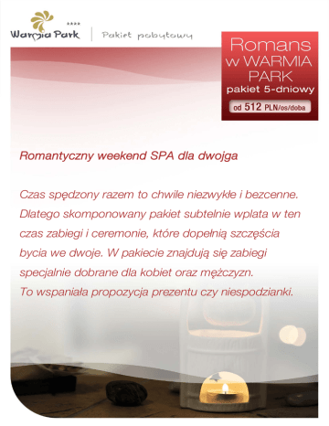 Romantyczny weekend SPA dla dwojga Czas spędzony razem to chwile niezwykłe i bezcenne. Dlatego skomponowany pakiet subtelnie wplata w ten czas zabiegi i ceremonie, które dopełnią szczęścia bycia we dwoje. W pakiecie znajdują się zabiegi specjalnie dobrane dla kobiet oraz mężczyzn. To wspaniała propozycja prezentu czy niespodzianki. W programie ● 2 noclegi ● 2 śniadania (na życzenie do łóżka) ● 2 obiadokolacje przy świecach ● butelka wina do pokoju ● 5% zniżki na pozostałe zabiegi w SPA ● SPA dla Niej * Rasul - orientalny zabieg z mineralnymi glinkami wulkanicznymi w kabinie (zabieg można wykonywać we dwoje, sobie nawzajem) * Illuminating radiance - ekspresowy zabieg upiększający dla każdego typu skóry. Zabieg ma za zadanie nawilżyć, odżywić, wygładzić i odświeżyć naskórek, usunąć oznaki zmęczenia oraz przywrócić skórze zdrowy i promienny wygląd. * Pielęgnacyjny zabieg na dłonie * Youthful Grape Ceremony - odmładzająca ceremonia dla każdego typu skóry, w szczególności zmęczonej i odwodnionej. Zabieg składa się z drobnoziarnistego peelingu o działaniu odżywczym. Maska z winem to doskonała propozycja dla osób przemęczonych i zestresowanych. Ceremonia z winnym kokonem jest zabiegiem odmładzająco-ujędrniającym. * Masaż M.E.R. - wspaniały masaż całego ciała przy użyciu ciepłych olejków i aromatów według uznania Gościa. Dogłębnie odpręża, relaksuje duszę i ciało. Zalecany w celu ukojenia zmysłów i zmęczonej skóry. ● SPA dla Niego * Rasul - orientalny zabieg z mineralnymi glinkami wulkanicznymi w kabinie (zabieg można wykonywać we dwoje, sobie nawzajem) * Zabieg relaksacyjny dla mężczyzn + masaż pleców Zabieg łączący w sobie naturalne składniki, które stymulują metabolizm komórkowy, usprawniają krążenie i detoksykują cały organizm. Poprzez rozgrzanie określonych partii następuje rozluźnienie, zmniejszenie napięcia i relaks. Polecany w szczególności osobom zestresowanym i przemęczonym. * Kąpiel „Morska bryza” - odżywiająco–regenerująca idealna dla osób zmęczonych i zestresowanych. Dzięki zawartości magnezu, wapnia i soli mineralnych w ekspresowym tempie przywraca dobre samopoczucie. Odżywia i regeneruje naskórek, poprawia kondycję. * Illuminating radiance - ekspresowy zabieg upiększający dla każdego typu skóry. Zabieg ma za zadanie nawilżyć, odżywić, wygładzić i odświeżyć naskórek, usunąć oznaki zmęczenia oraz przywrócić skórze zdrowy i promienny wygląd. * Masaż twarzy, szyi i dekoltu - masaż poprawia ukrwienie skóry, przez co staje się ona młodsza i bardziej jędrna. Masaż działa relaksacyjne, odpręża muskulaturę przez co spłyca zmarszczki mimiczne, a twarz wygląda na wypoczętą, świeżo i pogodnie. Zastrzegamy sobie możliwość zmiany zabiegu w przypadku przeciwwskazań do jego wykonania. GRATIS • • • • • atrakcje 3-poziomowego aquaparku sauny basen solankowy siłownia możliwość korzystania z saloniku zabaw dla dzieci (pod opieką osoby dorosłej) • WiFi • zestaw do przyrządzania kawy i herbaty Pakiety rozpoczynają się w dowolny dzień tygodnia (do uzgodnienia z recepcją hotelową). Oferta nie obejmuje długich weekendów oraz świąt. SPA czynne jest w godzinach od 10:00 do 21:00. Godziny zabiegów ustalane są indywidualnie w recepcji SPA. Gościom korzystającym z naszych pakietów pobytowych zapewniamy nieograniczony wstęp do 3-poziomowego aquaparku, na basen solankowy oraz na siłownię. Cena pakietów obejmuje podatek VAT. Pakiety SPA rozpoczynają się obiadokolacją w dniu przyjazdu, a kończą śniadaniem w dniu wyjazdu. Naszych Gości prosimy o zabranie stroju kąpielowego, stroju gimnastycznego, obuwia sportowego oraz klapek na basen. Wszystkie zabiegi wykonywane są na bazie kosmetyków firm THALGO, THAL’ION, BEAUTY CREATION, PURLES oraz marki KURLAND. Gościom korzystającym z zabiegów w SPA oferujemy herbatki ziołowe oraz wodę mineralną gratis. Doba hotelowa rozpoczyna się o godzinie 16:00 a kończy się o godzinie 13:00 w dniu wyjazdu. Miłego pobytu! Hotel & SPA WARMIA PARK Pluski ul. Pluszna 36, 11-034 Stawiguda tel.: +48-89-519-53-00, fax: +48-89-519-53-03 [email protected] www.warmiapark.pl www.warmiaparkclub.pl