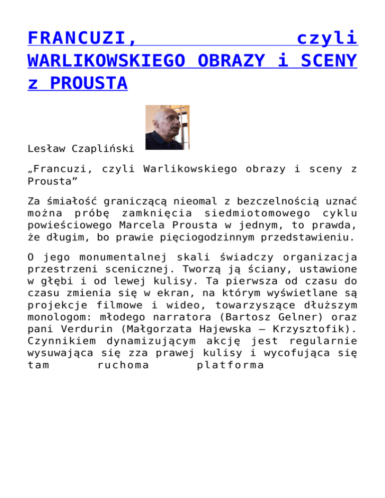 FRANCUZI, czyli WARLIKOWSKIEGO OBRAZY i SCENY z PROUSTA Lesław Czapliński „ Francuzi, czyli Warlikowskiego obrazy i sceny z Prousta” Za śmiałość graniczącą nieomal z bezczelnością uznać można próbę zamknięcia siedmiotomowego cyklu powieściowego Marcela Prousta w jednym, to prawda, że długim, bo prawie pięciogodzinnym przedstawieniu. O jego monumentalnej skali świadczy organizacja przestrzeni scenicznej. Tworzą ją ściany, ustawione w głębi i od lewej kulisy. Ta pierwsza od czasu do czasu zmienia się w ekran, na którym wyświetlane są projekcje filmowe i wideo, towarzyszące dłuższym monologom: młodego narratora (Bartosz Gelner) oraz pani Verdurin (Małgorzata Hajewska – Krzysztofik). Czynnikiem dynamizującym akcję jest regularnie wysuwająca się zza prawej kulisy i wycofująca się tam ruchoma platforma z usytuowanym na niej salonem księstwa Guermantes, z nimi samymi oraz ich gośćmi . Stanowi to niewątpliwe nawiązanie do scenicznych mobili Jerzego Grzegorzewskiego, ale w przeciwieństwie do dramaturgii jego przedstawień, w których kwestie postaci stanowiły montaż wypowiedzi, wyrwanych z różnych kontekstów, tutaj występuje ciągłość sytuacyjna w obrębie scen. Ze ściany, znajdującej się po lewej, od czasu do czasu wysuwa się łoże, sygnalizując w ten sposób przestrzeń prywatną. Rozegrają się tu sceny pomiędzy baronem de Charlusem (Jacek Poniedziałek) i Charles’em Morelem (Piotr Polak) oraz Swannem (Mariusz Banaszewski) i Odetną (Maja Ostaszewska), w których dominuje pierwiastek sadomasochistyczny. Towarzyskie konwersacje maskują w istocie pustkę i konwencjonalny charakter relacji pomiędzy postaciami, osłaniając rozpad autentycznych więzi. Także dialogi są pozorne. Postacie toczą właściwie, niczym u Czechowa, równoległe monologi, pomimo zajmowania wspólnej przestrzeni. Stąd wrażenie drętwoty niektórych scen, zwłaszcza w pierwszej części przedstawienia, i duszenia się aktorów w gorsecie narzuconych im ról, co być może uznać należy za świadomą i zamierzoną strategię inscenizacyjną? Zresztą we współczesnym teatrze klucz do odczytania spektaklu zazwyczaj dostarczany bywa dopiero w trakcie jego trwania. Akcja zatem niejednokrotnie jakby wyhamowuje, ulega dezintegracji niczym u Antonioniego. Ponowoczesna poetyka przedstawienia polega między innymi na heterogeniczności składowych. A więc mamy do czynienia, obok wspomnianych projekcji, z multiplikacjami działań aktorskich na pierwszym planie poprzez jednoczesne wyświetlanie ich w powiększeniu na tylnej ścianie, a także z włączeniem w obręb przedstawienia manifestacji z innych dziedzin sztuki – monologi Racine’owskiej Fedry w wykonaniu aktorki Racheli (jej pierwowzorem była Sarah Bernhardt), w którą wcieliła się Agata Buzek, oraz recital wiolonczelisty (Adam Zdunik). W jego trakcie akcja jakby zamiera, postacie stają się jednocześnie publicznością i muszą w jakiś sposób wypełnić ten dla nich martwy czas. Niektórzy z nich wydają się wyraźnie zagubieni. Na przykład Ewa Dałkowska, która w „Kabarecie warszawskim” dała popis gry aktorskiej, choć jakby przeniesionej z teatru z innej epoki, tym razem, jako Królowa Neapolu, poprzestaje na strojeniu min. Każda z trzech części zostaje na ogół spuentowana błyskotliwie rozegraną sceną finałową. W pierwszej jest to rozmowa pomiędzy Odettą i Swannem, który przepytuje ją na okoliczność jej wcześniejszych związków z kobietami , w drugiej spotkanie tegoż z księstwem Guermantes (Magdalena Cielecka i Marek Kalita), w trakcie którego powiadamia ich o swojej śmiertelnej chorobie, w trzeciej przywołany występ Racheli. Na długo zapada w pamięć wybitna kreacja aktorska Zdzisława Malanowicza, na początku przywołującego postać Dreyfusa i wygłaszającego długi monolog na tle dobiegających z oddali odgłosów szczekających psów , a pod koniec wcielającego się w postarzałego narratora. W ogóle wyjątkowo przejmujące wrażenie wywiera ostatnia część, w której pojawiają się wszyscy żyjący spośród dotychczasowych bohaterów, noszący na sobie brzemię lat, co zostało bardzo zręcznie osiągnięte w równej mierze środkami aktorskimi, co charakteryzatorskimi, choć w przypadku barona de Charlusa, miast zrośniętego z nim statywu z kroplówką, widziałbym przytroczony do spodni pojemnik odcewnikowania, coraz częściej oglądany latem na ulicach miast. Zastanawiającym może być stereotypowe kojarzenie mężołóstwa z transwestytyzmem, a więc z mężczyznami przebranymi w baletowe paczki i „Jeziorem łabędzim” Czajkowskiego, choć akurat w tle rozbrzmiewa w tym przypadku muzyka z jego „Dziadka do orzechów”. Z kolei monologowi młodego narratora (Bartosz Gelner) o mężołóstwie towarzyszą w tle kadry dwuznacznego filmu Jeana Painlevé „Konik morski”, z jednej strony stanowiącego naukową obserwację, z drugiej ukazującego niespożyty instynkt rozrodczy tych stworzeń, a zatem, czyżby dostarczającego ironicznego kontrapunktu dla zachowań i obyczajów postaci spektaklu, aluzję, że ludzkim światem rządzą podobne mechanizmy? Teatr Nowy w Warszawie: „Francuzi”. Scenariusz: Krzysztof Warlikowski, Piotr Gruszczyński. Reż. Krzysztof Warlikowski. Scen. Małgorzata Szczęśniak. Muz. Jan Duszyński.