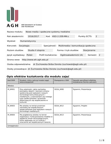 Nazwa modułu: Rok akademicki: Wydział: Kierunek: Nowe media i społeczne systemy medialne 2016/2017 Kod: HSO-2-209-MK-s Punkty ECTS: 2 Humanistyczny Socjologia Poziom studiów: Specjalność: Studia II stopnia Język wykładowy: Polski Multimedia i komunikacja społeczna Forma i tryb studiów: Profil kształcenia: Stacjonarne Ogólnoakademicki (A) Semestr: 2 Strona www: http://www.wh.agh.edu.pl Osoba odpowiedzialna: dr Żuchowska-Skiba Dorota ([email protected]) Osoby prowadzące: dr Żuchowska-Skiba Dorota ([email protected]) Opis efektów kształcenia dla modułu zajęć Kod EKM Student, który zaliczył moduł zajęć wie/umie/potrafi Powiązania z EKK Sposób weryfikacji efektów kształcenia (forma zaliczeń) M_W001 Zna zależności, jakie zachodzą pomiędzy ideami i teoriami zmiany społecznej pod wpływem nowych technologii komunikacyjnych i medialnych, a tworzeniem się nowego typu społeczeństwa i przemian dokonujących się współcześnie w kulturze. SO2A_W08 Egzamin, Prezentacja M_W003 Ma wiedzę na temat przemian zachodzą we współczesnym społeczeństwie pod wpływem nowych technologii medialnych. SO2A_W12 Egzamin, Projekt M_W004 Ma pogłębioną wiedzę na temat organizacji i funkcjonowania mediów w aspekcie zmian technologicznych, które wpływają na ich funkcje i znaczenie we współczesnym świecie. SO2A_W13 Egzamin, Prezentacja Wiedza Umiejętności 1/8 Karta modułu - Nowe media i społeczne systemy medialne M_U001 Potrafi samodzielnie dokonać analizy zasad funkcjonowania mediów współcześnie i ich przemian pod wpływem nowych technologii medialnych. SO2A_U04 Egzamin, Prezentacja M_U002 Potrafi tworzyć narzędzia do analizy różnorodnych przekazów medialnych. SO2A_U07 Egzamin, Prezentacja, Projekt M_U005 Potrafi samodzielnie wykorzystując interdyscyplinarne źródła, aby przedstawić przemiany zachodzące we współczesnym świecie pod wpływem nowych technologii medialnych oraz w obrębie samych mediów. SO2A_U09, SO2A_U11, SO2A_U12 Egzamin, Prezentacja, Projekt, Aktywność na zajęciach, Udział w dyskusji, Zaangażowanie w pracę zespołu SO2A_K06 Aktywność na zajęciach Kompetencje społeczne M_K001 Ma świadomość znaczenia analizy socjologicznej dla rozumienia współczesnych procesów społecznych, politycznych, gospodarczych i kulturowych zachodzących pod wpływem zmian technologicznych we współczesnych społeczeństwach Matryca efektów kształcenia w odniesieniu do form zajęć Konwersatori um Zajęcia seminaryjne Zajęcia praktyczne Zajęcia terenowe Zajęcia warsztatowe Zna zależności, jakie zachodzą pomiędzy ideami i teoriami zmiany społecznej pod wpływem nowych technologii komunikacyjnych i medialnych, a tworzeniem się nowego typu społeczeństwa i przemian dokonujących się współcześnie w kulturze. + - - - - - - - - - - M_W003 Ma wiedzę na temat przemian zachodzą we współczesnym społeczeństwie pod wpływem nowych technologii medialnych. + - - - - - - - - - - M_W004 Ma pogłębioną wiedzę na temat organizacji i funkcjonowania mediów w aspekcie zmian technologicznych, które wpływają na ich funkcje i znaczenie we współczesnym świecie. + - - - - - - - - - - E-learning Ćwiczenia projektowe M_W001 Inne Ćwiczenia laboratoryjne Forma zajęć Ćwiczenia audytoryjne Student, który zaliczył moduł zajęć wie/umie/potrafi Wykład Kod EKM Wiedza Umiejętności 2/8 Karta modułu - Nowe media i społeczne systemy medialne M_U001 Potrafi samodzielnie dokonać analizy zasad funkcjonowania mediów współcześnie i ich przemian pod wpływem nowych technologii medialnych. + - - - - - - - - - - M_U002 Potrafi tworzyć narzędzia do analizy różnorodnych przekazów medialnych. + - - - - - - - - - - M_U005 Potrafi samodzielnie wykorzystując interdyscyplinarne źródła, aby przedstawić przemiany zachodzące we współczesnym świecie pod wpływem nowych technologii medialnych oraz w obrębie samych mediów. + - - - - - - - - - - - - - - - - - - - - - Kompetencje społeczne M_K001 Ma świadomość znaczenia analizy socjologicznej dla rozumienia współczesnych procesów społecznych, politycznych, gospodarczych i kulturowych zachodzących pod wpływem zmian technologicznych we współczesnych społeczeństwach Treść modułu zajęć (program wykładów i pozostałych zajęć) Wykład Zajęcia te mają studentom przybliżyć pojęcie cywilizacji medialnej. Termin ten stanowi określenie zmian zachodzących w społeczeństwie pod wpływem nowoczesnych technik komunikacyjnych. W pierwszej kolejności wykłady zostaną poświęcone: przedstawieniu koncepcji społeczeństwa sieci oraz ukazaniu perspektywy teorii determinizmu technologicznego, a także pokazaniu teorii analizy sieci . Drugi nurt refleksji w ramach wykładów poświęcony będzie ukazaniu funkcjonowania w dzisiejszych warunkach mediów. Omówione zostaną podstawowe elementy przemian jakie dokonują się obecnie w tradycyjnych mediach pod wpływem nowych technologii. I. Społeczeństwo sieci 1. Społeczeństwo sieci – charakterystyka 2 godziny 2. Koncepcje determinizmu technologicznego 4 godziny 3 Sieci w społeczeństwie: Analiza sieci społecznych (SNA) 2 godziny 4. Sieci w społeczeństwie: Sieciowa teoria wymiany (NET) 2 godziny 5. Teoria społeczeństwa sieci (TNS)2 godziny 6. Sieci ludzkie i nieludzkie: Teoria aktora sieci (ANT) i Nowa Nauka Sieci (NST) 2 godziny II. Nowe media – w poszukiwaniu nowego paradygmatu? 1.Czym są nowe media 2 godziny: 2 godziny 2.Książka i prasa w dobie nowych mediów: 2 godziny 3.Przekazy audialne współcześnie: 2 godziny 4.Kino i film w dobie nowych mediów: 2 godziny 5.Telewizja i video dziś: 2 godziny 3/8 Karta modułu - Nowe media i społeczne systemy medialne 6. Komputery i sieci: 2 godziny 7.Komunikacja internetowa, gry komputerowe i rzeczywistość wirtualna: 2 godziny Sposób obliczania oceny końcowej Egzamin w formie testu i otwartych pytań 100% Wymagania wstępne i dodatkowe – Zalecana literatura i p