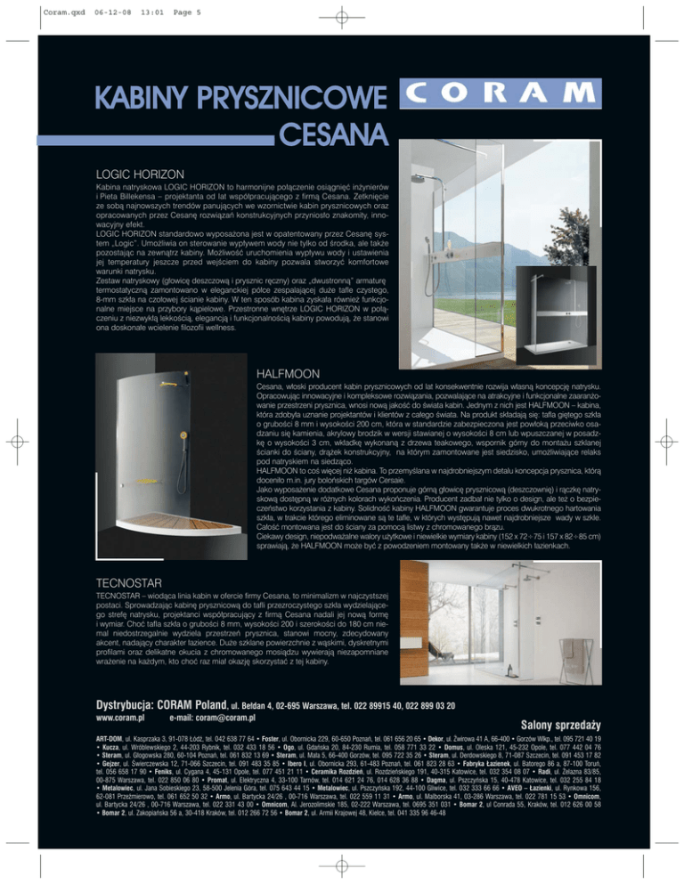 Coram.qxd 06-12-08 13:01 Page 5 KABINY PRYSZNICOWE CESANA LOGIC HORIZON Kabina natryskowa LOGIC HORIZON to harmonijne połączenie osiągnięć inżynierów i Pieta Billekensa – projektanta od lat współpracującego z firmą Cesana. Zetknięcie ze sobą najnowszych trendów panujących we wzornictwie kabin prysznicowych oraz opracowanych przez Cesanę rozwiązań konstrukcyjnych przyniosło znakomity, innowacyjny efekt. LOGIC HORIZON standardowo wyposażona jest w opatentowany przez Cesanę system „Logic”. Umożliwia on sterowanie wypływem wody nie tylko od środka, ale także pozostając na zewnątrz kabiny. Możliwość uruchomienia wypływu wody i ustawienia jej temperatury jeszcze przed wejściem do kabiny pozwala stworzyć komfortowe warunki natrysku. Zestaw natryskowy (głowicę deszczową i prysznic ręczny) oraz „dwustronną” armaturę termostatyczną zamontowano w eleganckiej półce zespalającej duże tafle czystego, 8-mm szkła na czołowej ścianie kabiny. W ten sposób kabina zyskała również funkcjonalne miejsce na przybory kąpielowe. Przestronne wnętrze LOGIC HORIZON w połączeniu z niezwykłą lekkością, elegancją i funkcjonalnością kabiny powodują, że stanowi ona doskonałe wcielenie filozofii wellness. HALFMOON Cesana, włoski producent kabin prysznicowych od lat konsekwentnie rozwija własną koncepcję natrysku. Opracowując innowacyjne i kompleksowe rozwiązania, pozwalające na atrakcyjne i funkcjonalne zaaranżowanie przestrzeni prysznica, wnosi nową jakość do świata kabin. Jednym z nich jest HALFMOON – kabina, która zdobyła uznanie projektantów i klientów z całego świata. Na produkt składają się: tafla giętego szkła o grubości 8 mm i wysokości 200 cm, która w standardzie zabezpieczona jest powłoką przeciwko osadzaniu się kamienia, akrylowy brodzik w wersji stawianej o wysokości 8 cm lub wpuszczanej w posadzkę o wysokości 3 cm, wkładkę wykonaną z drzewa teakowego, wspornik górny do montażu szklanej ścianki do ściany, drążek konstrukcyjny, na którym zamontowane jest siedzisko, umożliwiające relaks pod natryskiem na siedząco. HALFMOON to coś więcej niż kabina. To przemyślana w najdrobniejszym detalu koncepcja prysznica, którą doceniło m.in. jury bolońskich targów Cersaie. Jako wyposażenie dodatkowe Cesana proponuje górną głowicę prysznicową (deszczownię) i rączkę natryskową dostępną w różnych kolorach wykończenia. Producent zadbał nie tylko o design, ale też o bezpieczeństwo korzystania z kabiny. Solidność kabiny HALFMOON gwarantuje proces dwukrotnego hartowania szkła, w trakcie którego eliminowane są te tafle, w których występują nawet najdrobniejsze wady w szkle. Całość montowana jest do ściany za pomocą listwy z chromowanego brązu. Ciekawy design, niepodważalne walory użytkowe i niewielkie wymiary kabiny (152 x 72÷75 i 157 x 82÷85 cm) sprawiają, że HALFMOON może być z powodzeniem montowany także w niewielkich łazienkach. TECNOSTAR TECNOSTAR – wiodąca linia kabin w ofercie firmy Cesana, to minimalizm w najczystszej postaci. Sprowadzając kabinę prysznicową do tafli przezroczystego szkła wydzielającego strefę natrysku, projektanci współpracujący z firmą Cesana nadali jej nową formę i wymiar. Choć tafla szkła o grubości 8 mm, wysokości 200 i szerokości do 180 cm niemal niedostrzegalnie wydziela przestrzeń prysznica, stanowi mocny, zdecydowany akcent, nadający charakter łazience. Duże szklane powierzchnie z wąskimi, dyskretnymi profilami oraz delikatne okucia z chromowanego mosiądzu wywierają niezapomniane wrażenie na każdym, kto choć raz miał okazję skorzystać z tej kabiny. Dystrybucja: CORAM Poland, ul. Bełdan 4, 02-695 Warszawa, tel. 022 89915 40, 022 899 03 20 www.coram.pl e-mail: [email protected] Salony sprzedaży ART-DOM, ul. Kasprzaka 3, 91-078 Łódź, tel. 042 638 77 64 • Foster, ul. Obornicka 229, 60-650 Poznań, tel. 061 656 20 65 • Dekor, ul. Żwirowa 41 A, 66-400 • Gorzów Wlkp., tel. 095 721 40 19 • Kucza, ul. Wróblewskiego 2, 44-203 Rybnik, tel. 032 433 18 56 • Ogo, ul. Gdańska 20, 84-230 Rumia, tel. 058 771 33 22 • Domus, ul. Oleska 121, 45-232 Opole, tel. 077 442 04 76 • Steram, ul. Głogowska 280, 60-104 Poznań, tel. 061 832 13 69 • Steram, ul. Mała 5, 66-400 Gorzów, tel. 095 722 35 26 • Steram, ul. Derdowskiego 8, 71-087 Szczecin, tel. 091 453 17 82 • Gejzer, ul. Świerczewska 12, 71-066 Szczecin, tel. 091 483 35 85 • Ibero I, ul. Obornicka 293, 61-483 Poznań, tel. 061 823 28 63 • Fabryka Łazienek, ul. Batorego 86 a, 87-100 Toruń, tel. 056 658 17 90 • Feniks, ul. Cygana 4, 45-131 Opole, tel. 077 451 21 11 • Ceramika Rozdzień, ul. Rozdzieńskiego 191, 40-315 Katowice, tel. 032 354 08 07 • Radi, ul. Żelazna 83/85, 00-875 Warszawa, tel. 022 850 06 80 • Promat, ul. Elektryczna 4, 33-100 Tarnów, tel. 014 621 24 76, 014 628 36 88 • Dagma, ul. Pszczyńska 15, 40-478 Katowice, tel. 032 255 84 18 • Metalowiec, ul. Jana Sobieskiego 23, 58-500 Jelenia Góra, tel. 075 643 44 15 • Metalowiec, ul. Pszczyńska 192, 44-100 Gliwice, tel. 032 333 66 66 • AVEO – Łazienki, ul. Rynkowa 156, 62-081 Przeźmierowo, tel. 061 652 50 32 • Armo, ul. Bartycka 24/26 , 00-716 Warszawa, tel. 022 559 11 31 • Armo, ul. Malborska 41, 03-286 Warszawa, tel. 022 781 15 53 • Omnicom, ul. Bartycka 24/26 , 00-716 Warszawa, tel. 022 331 43 00 • Omnicom, Al. Jerozolimskie 185, 02-222 Warszawa, tel. 0695 351 031 • Bomar 2, ul Conrada 55, Kraków, tel. 012 626 00 58 • Bomar 2, ul. Zakopiańska 56 a, 30-418 Kraków, tel. 012 266 72 56 • Bomar 2, ul. Armii Krajowej 48, Kielce, tel. 041 335 96 46-48