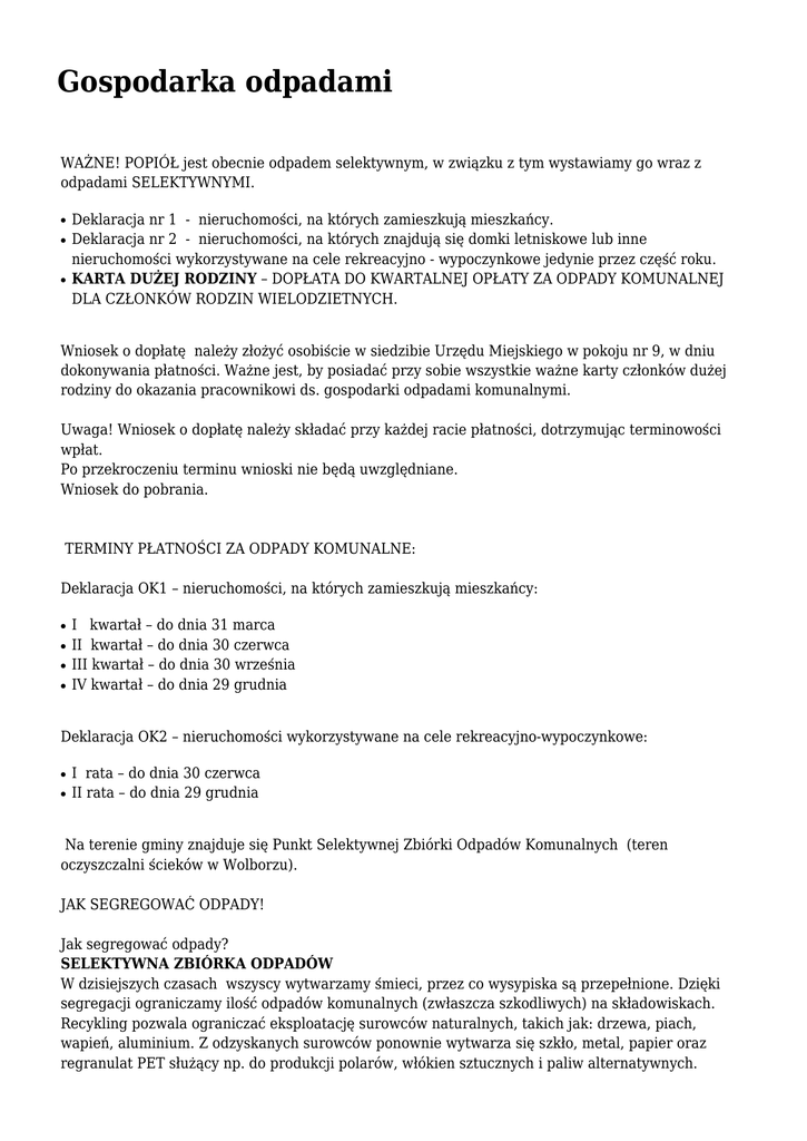 Gospodarka odpadami WAŻNE! POPIÓŁ jest obecnie odpadem selektywnym, w związku z tym wystawiamy go wraz z odpadami SELEKTYWNYMI. ● ● ● Deklaracja nr 1 - nieruchomości, na których zamieszkują mieszkańcy. Deklaracja nr 2 - nieruchomości, na których znajdują się domki letniskowe lub inne nieruchomości wykorzystywane na cele rekreacyjno - wypoczynkowe jedynie przez część roku. KARTA DUŻEJ RODZINY – DOPŁATA DO KWARTALNEJ OPŁATY ZA ODPADY KOMUNALNEJ DLA CZŁONKÓW RODZIN WIELODZIETNYCH. Wniosek o dopłatę należy złożyć osobiście w siedzibie Urzędu Miejskiego w pokoju nr 9, w dniu dokonywania płatności. Ważne jest, by posiadać przy sobie wszystkie ważne karty członków dużej rodziny do okazania pracownikowi ds. gospodarki odpadami komunalnymi. Uwaga! Wniosek o dopłatę należy składać przy każdej racie płatności, dotrzymując terminowości wpłat. Po przekroczeniu terminu wnioski nie będą uwzględniane. Wniosek do pobrania. TERMINY PŁATNOŚCI ZA ODPADY KOMUNALNE: Deklaracja OK1 – nieruchomości, na których zamieszkują mieszkańcy: ● ● ● ● I kwartał – do dnia 31 marca II kwartał – do dnia 30 czerwca III kwartał – do dnia 30 września IV kwartał – do dnia 29 grudnia Deklaracja OK2 – nieruchomości wykorzystywane na cele rekreacyjno-wypoczynkowe: ● ● I rata – do dnia 30 czerwca II rata – do dnia 29 grudnia Na terenie gminy znajduje się Punkt Selektywnej Zbiórki Odpadów Komunalnych (teren oczyszczalni ścieków w Wolborzu). JAK SEGREGOWAĆ ODPADY! Jak segregować odpady? SELEKTYWNA ZBIÓRKA ODPADÓW W dzisiejszych czasach wszyscy wytwarzamy śmieci, przez co wysypiska są przepełnione. Dzięki segregacji ograniczamy ilość odpadów komunalnych (zwłaszcza szkodliwych) na składowiskach. Recykling pozwala ograniczać eksploatację surowców naturalnych, takich jak: drzewa, piach, wapień, aluminium. Z odzyskanych surowców ponownie wytwarza się szkło, metal, papier oraz regranulat PET służący np. do produkcji polarów, włókien sztucznych i paliw alternatywnych. Wystarczy zapoznać się z podstawowymi regułami dotyczącymi segregacji odpadów, by zacząć postępować zgodnie z nimi. WOREK NIEBIESKI – odpady segregowane – papier Wrzucamy: gazety, papier, książki, zeszyty, kartony, pudła tekturowe. Ważne! Nie wrzucamy: papieru przebitkowego (kalka), tłustego papieru, zużytych papierów higienicznych. Pamiętaj! Zanim wrzucisz: opakowania kartonowe, torebki papierowe złóż na płasko. WOREK ŻÓŁTY – odpady segregowane – tworzywa sztuczne, metal i opakowania wielomateriałowe Wrzucamy: butelki typu PET, butelki po chemii gospodarczej, opakowania po produktach spożywczych, folię opakowaniową, puszki aluminiowe, stalowe po żywności, napojach, karmie dla zwierząt, opakowania wielomateriałowe (kartoniki po sokach, napojach, produktach mlecznych). Ważne! Nie wrzucamy: tworzyw piankowych, silikonów, gum, butelek po środkach chemicznych, farbach, olejach, tworzyw sztucznych zastosowania medycznego, złomu żelaznego, złomu metali kolorowych. Pamiętaj! Zanim wrzucisz: odkręć nakrętkę, usuń resztki produktów z opakowań, zgnieć opakowanie. WOREK ZIELONY – odpady segregowane – szkło Wrzucamy: opakowania szklane, białe i kolorowe, butelki po: napojach, sokach, alkoholach, żywności, słoiki po dżemach i przetworach. Ważne! Nie wrzucamy: porcelany, ceramiki, szkła stołowego, zniczy szklanych, żarówek, lamp, reflektorów, luster, szyb okiennych i samochodowych, opakowań po lekach. Pamiętaj! Zanim wrzucisz: opakowania szklane opróżnij z resztek produktów oraz pozbądź się zakrętek, korków i kapsli. WOREK BRĄZOWY – odpady segregowane – bioodpady Wrzucamy: odpadki kuchenne (resztki owoców, warzyw, produktów mlecznych, skorupki jaj, łupiny orzechów, fusy po kawie, herbacie razem z filtrem papierowym), ściętą trawę, chwasty, liście, drobne gałązki, spady owocowe, zwiędłe kwiaty cięte, doniczkowe. WOREK CZARNY – odpady segregowane – popiół Wrzucamy: popiół Ważne! Nie wrzucamy: gorącego popiołu. Więcej informacji w sprawie odpadów komunalnych można uzyskać pod nr tel. 44 61-64-241 wew.25 lub e-mail: [email protected]