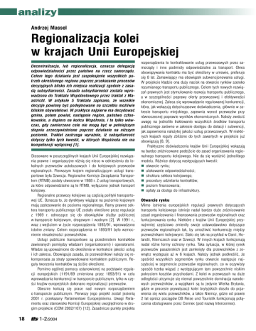 analizy Andrzej Massel Regionalizacja kolei w krajach Unii Europejskiej Decentralizacja, lub regionalizacja, oznacza delegację odpowiedzialności przez państwo na rzecz samorządu. Celem tego działania jest zaspokojenie wszystkich potrzeb określonego regionu poprzez przekazanie procesów decyzyjnych blisko ich miejsca realizacji zgodnie z zasadą subsydiarności. Zasada subsydiarności została wprowadzona do Traktatu Wspólnotowego przez traktat z Maastricht. W artykule 5 Traktatu zapisano, że wszelkie decyzje powinny być podejmowane na szczeblu możliwie bliskim obywatelowi. W praktyce najpierw ma decydować gmina, potem powiat, następnie region, państwo członkowskie, a dopiero na końcu Wspólnota, i to tylko wówczas, gdy zamierzone cele nie mogą być w pełniejszym stopniu urzeczywistnione poprzez działanie na niższym poziomie. Traktat zastrzega wyraźnie, iż subsydiarność dotyczy tylko tych kwestii, w których Wspólnota nie ma kompetencji wyłącznej [1]. Stosowane w poszczególnych krajach Unii Europejskiej rozwiązania prawne i organizacyjne różnią się nieco w odniesieniu do lokalnych przewozów autobusowych i do kolejowych przewozów regionalnych. Pierwszym krajem regionalizującym usługi transportowe była Szwecja. Regionalne Komisje Zarządzania Transportem (RTMB) zostały utworzone w 1988 r. Z usług transportowych, za które odpowiedzialne są te RTMB, wyłączono jednak transport kolejowy. Regionalne przewozy kolejowe są częścią polityki transportowej UE. Oznacza to, że dyrektywy wiążące na poziomie krajowym mają zastosowanie do poziomu regionalnego. Ramy prawne sektora transportu publicznego UE zostały określone przez regulacje z 1969 r. odnoszące się do obowiązków służby publicznej w transporcie kolejowym, drogowym i wodnym [2]. W 1991 r., wraz z wejściem w życie rozporządzenia 1893/91, wprowadzono istotne zmiany. Celem rozporządzenia nr 1893/91 było wzmocnienie niezależności przewoźników. Usługi publiczne transportowe są przedmiotem kontraktów zawieranych pomiędzy władzami (organizatorami) i operatorami. Władze są upoważnione do określenia w kontrakcie jakości usług i ich zakresu. Obowiązuje zasada, że przewoźnikowi należy się rekompensata za straty spowodowane kontraktem publicznym. Reguły tworzenia kontraktów są ściśle określone. Pomimo ogólnej pomocy ustanowionej na podstawie regulacji europejskich (1191/69 zmieniona przez 1893/91) w celu wprowadzania konkurencji w transporcie publicznym, tylko w części krajów europejskich dokonano regionalizacji przewozów. Obecnie kończą się prace nad nowym rozporządzeniem o transporcie publicznym. Pierwszy jego projekt został jesienią 2001 r. przekazany Parlamentowi Europejskiemu. Uwagi Parlamentu oraz stanowisko Komisji Europejskiej uwzględniono w drugim projekcie (COM 2002/107) [12]. Zasadnicze punkty projektu 18 1-2/2004 rozporządzenia to kontraktowanie usług przewozowych przez samorządy i inne podmioty odpowiedzialne za transport. Okres obowiązywania kontraktu ma być określony w umowie, preferuje się 8 lat. Zamawiający ma obowiązek subwencjonowania usługi. W projekcie kładzie ona duży nacisk na otwarcie rynków szeroko rozumianego transportu publicznego. Celem tych nowych rozwiązań prawnych jest stymulowanie rozwoju transportu publicznego, a w szczególności poprawy oferty przewozowej i efektywności ekonomicznej. Zaleca się wprowadzanie regulowanej konkurencji, która, jak wskazują dotychczasowe doświadczenia, głównie w zakresie transportu miejskiego, zapewnia wzrost przewozów przy równoczesnej poprawie wyników ekonomicznych. Należy zwrócić uwagę na jednolite traktowanie wszystkich środków transportu publicznego zarówno w zakresie dostępu do dotacji i subwencji, jak zapewnienia należytej jakości usług przewozowych. W niektórych krajach reguły zbliżone do tych zawartych w projekcie już obowiązują [8, 9]. Praktyczne doświadczenia krajów Unii Europejskiej wskazują na bardzo zróżnicowane podejście do zasad organizowania regionalnego transportu kolejowego. Nie da się wyróżnić jednolitego modelu. Różnice dotyczą następujących kwestii: n otwarcie rynku; n ulokowanie odpowiedzialności; n struktura sektora kolejowego; n procedury udzielania kontraktów; n poziom finansowania; n opłaty za dostęp do infrastruktury. Otwarcie rynku Mimo istnienia europejskich regulacji prawnych dotyczących transportu kolejowego istnieje nadal bardzo duże zróżnicowanie zasad organizowania i finansowania przewozów regionalnych oraz funkcjonowania rynku. Niektóre z krajów Unii Europejskiej przynajmniej częściowo zmieniły swoje ustawodawstwo dotyczące przewozów regionalnych tak, by umożliwić konkurencję między przewoźnikami kolejowymi. Stało się tak na przykład w Danii, Holandii, Niemczech oraz w Szwecji. W innych krajach funkcjonują nadal różne formy ochrony rynku. Taka sytuacja, w której rynek przewozów pasażerskich jest zamknięty dla przewoźników z zewnątrz występuje aż w 6 krajach. Należy jednak podkreślić, że spośród wszystkich segmentów rynku otwarcie następuje najszybciej w segmencie przewozów regionalnych, co w oczywisty sposób trzeba wiązać z występującym tam powszechnie niskim pokryciem kosztów przychodami. Z kolei w przewozach na duże odległości utrzymuje się niemal powszechnie dominacja narodowych przewoźników, a wyjątkami są tu jedynie Wielka Brytania, gdzie w procesie prywatyzacji kolei brytyjskich doszło do pojawienia się wielu przewoźników, a także Niemcy, gdzie od prawie 2 lat oprócz pociągów DB Reise und Touristik funkcjonują połączenia obsługiwane przez Connex (pod nazwą Interconnex). analizy Tablica 1 Otwarcie rynku przewozów kolejowych [7] Kraj Brak otwarcia Francja Grecja n n n n Hiszpania Holandia Irlandia Luksemburg Niemcy Portugalia Szwecja Wielka Brytania Włochy Krajowe n Dania Finlandia Międzyregionalne n Austria Belgia Regional
