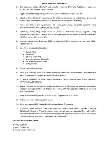 REGULAMIN NOCY BIBLIOTEK 1. Organizatorem „Nocy bibliotek” jest Miejska i Gminna Biblioteka Publiczna w Wołowie, ul. Gen. Wł. Sikorskiego 8, 56-100 Wołów. 2. Zajęcia przeznaczone są dla czytelników MiGBP w Wołowie w wieku 7-13 lat. 3. Udział w „Nocy bibliotek” zobowiązuje do udziału w konkursie na najładniejsze przebranie w stylu Harry Potter (dzieci przychodzą do biblioteki w strojach Harry Potter). 4. Liczba uczestników jest ograniczona (20 osób) /obowiązuje kolejność zgłoszeń, które przyjmowane będą do 1 czerwca 2016 r.- środa/. 5. Czytelnicy, którzy chcą wziąć udział w „Nocy w Bibliotece” muszą wypełnić kartę zgłoszeniową (wzór karty można pobrać osobiście w bibliotece lub na stronie internetowej biblioteki www.migbp-wolow.pl). 6. Impreza rozpocznie się 4 czerwca 2016 r. o godzinie 17:00, a zakończy się 5 czerwca 2016r. o godzinie 8:00. 7. Uczestnicy muszą zabrać ze sobą: śpiwór / koc poduszkę obuwie na zmianę wygodne ubranie do spania szczotkę i pastę do zębów dobry humor 8. Kolację zapewni organizator. 9. Dzieci nie powinny mieć przy sobie pieniędzy, telefonów komórkowych, wartościowych rzeczy /za zagubione rzeczy organizator nie odpowiada/. 10. W trakcie spotkania w wyjątkowych sytuacjach należy dzwonić pod numer telefonu: 607794954 lub 664995778. 11. Należy stosować się do poleceń opiekunów będących w Bibliotece. W wypadku uporczywie nieodpowiedniego zachowania dziecka, pracownicy Biblioteki poproszą rodziców o zabranie dziecka z imprezy. 12. Dzieci musi odebrać opiekun 5 czerwca 2016 r. w godzinach 7:30 – 8:00. 13. Podczas nocy mile widziany jeden rodzic. 14. Dzieci ubezpiecza PZU. Koszty ubezpieczenia pokrywa Organizator. 15. Uczestnicy „Nocy bibliotek” wyrażają zgodę na zamieszczenie przez Miejską i Gminną Bibliotekę Publiczną w Wołowie swojego wizerunku utrwalonego podczas „Nocy bibliotek” , na stronie i podstronach: www,migbp-wolow.pl (www.migbp-wolow.pl) w celach związanych z upublicznieniem fotorelacji z przebiegu „Nocy bibliotek”. GŁÓWNE PUNKTY SPOTKANIA 1. Tira przydziału. 2. Mecz Quidditcha 3. Nocny Maraton Filmowy