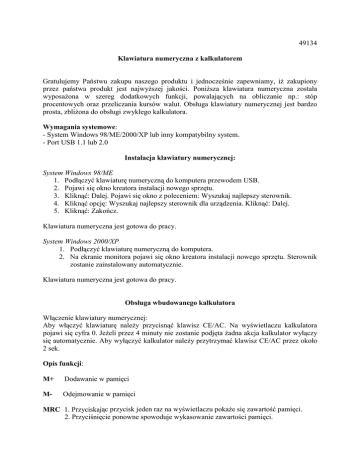 49134 Klawiatura numeryczna z kalkulatorem Gratulujemy Państwu zakupu naszego produktu i jednocześnie zapewniamy, iŜ zakupiony przez państwa produkt jest najwyŜszej jakości. PoniŜsza klawiatura numeryczna została wyposaŜona w szereg dodatkowych funkcji, powalających na obliczanie np.: stóp procentowych oraz przeliczania kursów walut. Obsługa klawiatury numerycznej jest bardzo prosta, zbliŜona do obsługi zwykłego kalkulatora. Wymagania systemowe: - System Windows 98/ME/2000/XP lub inny kompatybilny system. - Port USB 1.1 lub 2.0 Instalacja klawiatury numerycznej: System Windows 98/ME 1. Podłączyć klawiaturę numeryczną do komputera przewodem USB. 2. Pojawi się okno kreatora instalacji nowego sprzętu. 3. Kliknąć: Dalej. Pojawi się okno z poleceniem: Wyszukaj najlepszy sterownik. 4. Kliknąć opcję: Wyszukaj najlepszy sterownik dla urządzenia. Kliknąć: Dalej. 5. Kliknąć: Zakończ. Klawiatura numeryczna jest gotowa do pracy. System Windows 2000/XP 1. Podłączyć klawiaturę numeryczną do komputera. 2. Na ekranie monitora pojawi się okno kreatora instalacji nowego sprzętu. Sterownik zostanie zainstalowany automatycznie. Klawiatura numeryczna jest gotowa do pracy. Obsługa wbudowanego kalkulatora Włączenie klawiatury numerycznej: Aby włączyć klawiaturę naleŜy przycisnąć klawisz CE/AC. Na wyświetlaczu kalkulatora pojawi się cyfra 0. JeŜeli przez 4 minuty nie zostanie podjęta Ŝadna akcja kalkulator wyłączy się automatycznie. Aby wyłączyć kalkulator naleŜy przytrzymać klawisz CE/AC przez około 2 sek. Opis funkcji: M+ Dodawanie w pamięci M- Odejmowanie w pamięci MRC 1. Przyciskając przycisk jeden raz na wyświetlaczu pokaŜe się zawartość pamięci. 2. Przyciśnięcie ponowne spowoduje wykasowanie zawartości pamięci. TAB Określenie ilości miejsc po przecinku, przy zaokrąglaniu wyników. W przypadku klawiatury numerycznej przycisk funkcjonuje tak jak klawisz TAB na zwykłej klawiaturze. +/- Zmiana wartości danej liczby z dodatniej na ujemną i odwrotnie. % 1. W kombinacji ze znakami rachunkowymi słuŜy do obliczania procentów. 2. Ustalenie stopy procentowej. CUR 1. Ustalenie waluty i jej kursu 2. W przypadku klawiatury numerycznej jest to symbol €. √ Symbol pierwiastka. Wyciąganie pierwiastków z liczb dodatnich. GT Pamięć sum całkowitych MODE Zmiana trybu pracy klawiatury: kalkulator/ zwykła klawiatura numeryczna SEND Przesyła wynik działań matematycznych do komputera. Fn Przycisk kombinacyjny dla klawiszy funkcyjnych TAX- oraz TAX +. Po ustaleniu stopy procentowej moŜna przyciskając klawisz Fn i TAX- lub TAX+ wyświetlić dany wynik. TAX- Obliczenie ceny – podatek. TAX+ Obliczenie ceny wraz z podatkiem. JeŜeli funkcja NUM nie jest aktywna przycisk ten słuŜy jako =. Funkcje specjalne Oddana do państwa dyspozycji klawiatura numeryczna nie stwarza problemów z synchronizacją. UŜytkownik moŜe jednocześnie wykorzystywać klawiaturę numeryczną i pisać. Urządzenie nie wymaga dodatkowych sterowników i jest urządzeniem typu Plug & Play. NiezaleŜnie od statusu klawisza funkcyjnego NUM na klawiaturze standardowej uŜytkownik moŜe swobodnie wybierać między przyciskami poszczególnych cyfr lub przyciskami strzałek na bloku numerycznym. JeŜeli uŜytkownik przyciśnie klawisz NUM, zmieni w ten sposób status klawisza NUM klawiatury numerycznej. JeŜeli klawisz NUM nie zostanie ponownie naciśnięty w czasie 0,8 sek. status klawisza NUM zmieni się równieŜ na klawiaturze. Funkcja ta została rozwinięta dla specjalistycznego oprogramowania np.: Exel. Zmianę statusu klawisza NUM uŜytkownik moŜe obserwować na monitorze komputera. Tak, więc obsługa klawiatury numerycznej została uproszczona. Wyświetlacz Na wyświetlaczu klawiatury numerycznej pojawiają się, po naciśnięciu odpowiedniego klawisza znaki cyfr, wyniki oraz symbole ostrzegawcze i informacyjne. -MINUS Oznaczenie wartości ujemnej MEMORY Oznaczenie niezaleŜnej pamięci ERROR Błąd ‘ Symbol grupowania cyfr CALC Oznaczenie kalkulatora KEYPAD Oznaczenie klawiatury numerycznej GT Suma łączna CUR MnoŜenie z ceny i waluty (EURO) TAX MnoŜenie z ceny i stopy procentowej (EURO) Wybór zaokrąglania i miejsc dziesiętnych Ustawienie zaokrąglania Definiuje system zaokrąglania F system zmiennoprzecinkowy, wartość zostanie podana bez zaokrąglenia 0,2,4 Ilość miejsc po przecinku dla ustawienia 5/4 systemu zaokrąglania A W trybie A przypisane zostaną automatycznie wszystkim wartościom dwa miejsca po przecinku. Tryb ten jest konieczny przy obliczeniach walutowych dokonywanych na dolarach lub innych walutach, gdzie wymagane są dwa miejsca po przecinku. W tym trybie dwa miejsca po przecinku nie zostaną dodane, jeŜeli podczas wpisywania wartości przytrzymany zostanie przycisk DEL lub wykonywana będzie inna operacja matematyczna niŜ dodawanie, czy odejmowanie. Ustawienie funkcji pomocnej przy operacjach na kursach walut (CUR) Przytrzymując przycisk CUR przez około 1-1,5 sek. na wyświetlaczu kalkulatora zacznie mrugać symbol €. NaleŜy wpisać odpowiednią wartość parametru i przycisnąć klawisz CUR ponownie. Symbol € zgaśnie. Funkcja została uaktywniona i wyłączy się. JeŜeli na wyświetlaczu pojawi się ponownie „0” wpisaną wcześniej wartość moŜna wywołać przyciskając klawisz CUR. Wpisana wartość liczbowa zostanie pomnoŜona przez wartość CUR. Przykład: Wpisany parametr CUR wynosi 34. Liczba wpisana z klawiatury wynosi 180. Przy wyświetlonym symbolu € EURO na wyświetlaczu: JeŜeli po wpisaniu liczby 180 naciśniemy przycisk CUR wynik zostanie przemnoŜony przez 34, a więc: 180*34 = 6120 Przy niewyświetlonym symbolu EURO na wyświetlaczu: Po naciśnięciu przycisku CUR wynik 180 podzielony zostanie przez 34 (180/34 = 5,29). Ustawienie funkcji pomocnej przy obliczeniach stóp procentowych (TAX) Przytrzymując przycisk % przez około 1-1,5 sek. na wyświetlaczu kalkulatora zacznie mrugać symbol T