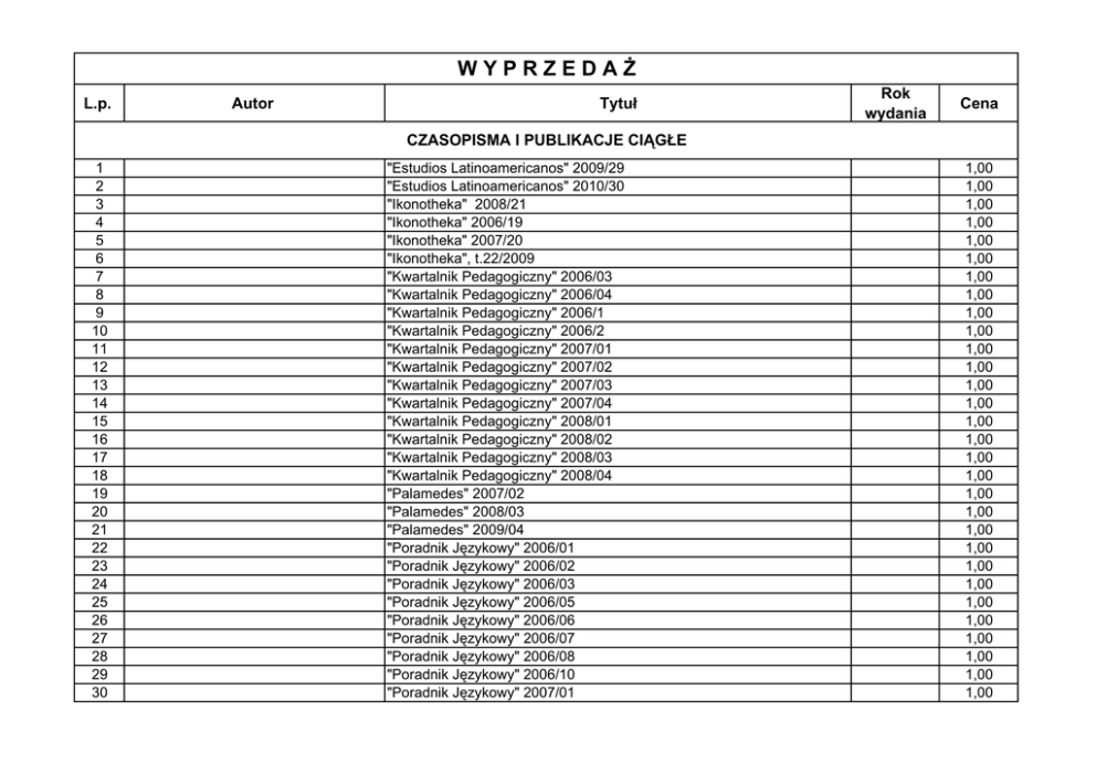 WYPRZEDAŻ L.p. Autor Tytuł Rok wydania Cena CZASOPISMA I PUBLIKACJE CIĄGŁE 1 2 3 4 5 6 7 8 9 10 11 12 13 14 15 16 17 18 19 20 21 22 23 24 25 26 27 28 29 30 "Estudios Latinoamericanos" 2009/29 "Estudios Latinoamericanos" 2010/30 "Ikonotheka" 2008/21 "Ikonotheka" 2006/19 "Ikonotheka" 2007/20 "Ikonotheka", t.22/2009 "Kwartalnik Pedagogiczny" 2006/03 "Kwartalnik Pedagogiczny" 2006/04 "Kwartalnik Pedagogiczny" 2006/1 "Kwartalnik Pedagogiczny" 2006/2 "Kwartalnik Pedagogiczny" 2007/01 "Kwartalnik Pedagogiczny" 2007/02 "Kwartalnik Pedagogiczny" 2007/03 "Kwartalnik Pedagogiczny" 2007/04 "Kwartalnik Pedagogiczny" 2008/01 "Kwartalnik Pedagogiczny" 2008/02 "Kwartalnik Pedagogiczny" 2008/03 "Kwartalnik Pedagogiczny" 2008/04 "Palamedes" 2007/02 "Palamedes" 2008/03 "Palamedes" 2009/04 "Poradnik Językowy" 2006/01 "Poradnik Językowy" 2006/02 "Poradnik Językowy" 2006/03 "Poradnik Językowy" 2006/05 "Poradnik Językowy" 2006/06 "Poradnik Językowy" 2006/07 "Poradnik Językowy" 2006/08 "Poradnik Językowy" 2006/10 "Poradnik Językowy" 2007/01 1,00 1,00 1,00 1,00 1,00 1,00 1,00 1,00 1,00 1,00 1,00 1,00 1,00 1,00 1,00 1,00 1,00 1,00 1,00 1,00 1,00 1,00 1,00 1,00 1,00 1,00 1,00 1,00 1,00 1,00 31 32 33 34 35 36 37 38 39 40 41 42 43 44 45 46 47 48 49 50 51 52 53 54 55 56 57 58 59 60 61 62 63 64 65 66 "Poradnik Językowy" 2007/02 "Poradnik Językowy" 2007/04 "Poradnik Językowy" 2007/06 "Poradnik Językowy" 2007/07 "Poradnik Językowy" 2007/09 "Poradnik Językowy" 2007/10 "Poradnik Językowy" 2008/02 "Poradnik Językowy" 2008/03 "Poradnik Językowy" 2008/04 "Poradnik Językowy" 2008/05 "Poradnik Językowy" 2008/06 "Poradnik Językowy" 2008/09 "Poradnik Językowy" 2009/01 "Poradnik Językowy" 2009/02 "Poradnik Językowy" 2009/03 "Poradnik Językowy" 2009/04 "Poradnik Językowy" 2009/05 "Poradnik Językowy" 2009/06 "Poradnik Językowy" 2009/07 "Poradnik Językowy" 2009/08 "Poradnik Językowy" 2009/09 "Poradnik Językowy" 2009/10 "Poradnik Językowy" 2010/01 "Poradnik Językowy" 2010/02 "Poradnik Językowy" 2010/03 "Poradnik Językowy" 2010/04 "Poradnik Językowy" 2010/05 "Poradnik Językowy" 2010/06 "Poradnik Językowy" 2010/07 "Poradnik Językowy" 2010/08 "Poradnik Językowy" 2010/09 "Poradnik Językowy" 2010/10 "Poradnik Językowy", 2008/07 "Poradnik Językowy", 2008/08 "Poradnik Językowy", 2008/10 "Przegląd Glottodydaktyczny" 2005/21 1,00 1,00 1,00 1,00 1,00 1,00 1,00 1,00 1,00 1,00 1,00 1,00 1,00 1,00 1,00 1,00 1,00 1,00 1,00 1,00 1,00 1,00 1,00 1,00 1,00 1,00 1,00 1,00 1,00 1,00 1,00 1,00 1,00 1,00 1,00 1,00 67 68 69 70 71 72 73 74 75 76 77 78 79 80 81 82 83 84 85 86 87 88 89 90 91 92 93 94 95 96 97 98 99 100 101 102 "Przegląd Glottodydaktyczny" 2006/22 "Przegląd Glottodydaktyczny" 2007/23 "Przegląd Glottodydaktyczny" 2008/24 "Przegląd Humanistyczny" 2003/07 "Przegląd Humanistyczny" 2005/06 "Przegląd Humanistyczny" 2006/02 "Przegląd Humanistyczny" 2006/03 "Przegląd Humanistyczny" 2006/04 "Przegląd Humanistyczny" 2006/05-06 "Przegląd Humanistyczny" 2007/01 "Przegląd Humanistyczny" 2007/02 "Przegląd Humanistyczny" 2007/03 "Przegląd Humanistyczny" 2007/04 "Przegląd Humanistyczny" 2007/05 "Przegląd Humanistyczny" 2007/06 "Przegląd Humanistyczny" 2008/01 "Przegląd Humanistyczny" 2008/02 "Przegląd Humanistyczny" 2008/03 "Przegląd Humanistyczny" 2008/04 "Przegląd Humanistyczny" 2008/05 "Przegląd Humanistyczny" 2008/06 "Przegląd Humanistyczny" 2009/01 "Przegląd Humanistyczny" 2009/02 "Przegląd Humanistyczny" 2009/03 "Przegląd Humanistyczny" 2009/04 "Przegląd Humanistyczny" 2009/06 "Przegląd Humanistyczny" 2009/07 "Przegląd Humanistyczny" 2009/08 "Przegląd Humanistyczny" 2009/09 "Przegląd Humanistyczny" 2009/10 "Przegląd Humanistyczny" 2010/01 "Przegląd Humnaistyczny" 2009/05 "Przegląd Muzykologiczny" 2007/07 "Przegląd Muzykologiczny", nr 5/2006 "Przegląd Muzykologiczny", nr 6/2006 "Stan Rzeczy" 2011/01 1,00 1,00 1,00 1,00 1,00 1,00 1,00 1,00 1,00 1,00 1,00 1,00 1,00 1,00 1,00 1,00 1,00 1,00 1,00 1,00 1,00 1,00 1,00 1,00 1,00 1,00 1,00 1,00 1,00 1,00 1,00 1,00 1,00 1,00 1,00 1,00 103 104 105 106 107 108 109 110 111 112 113 114 115 116 117 118 119 120 121 122 123 124 125 126 127 128 129 130 131 132 133 "Stosunki Międzynarodowe" 2009/1-2 "Stosunki Międzynarodowe" 2009/3-4 "Studia Interkulturowe Europy S-W" 1 "Studia Interkulturowe Europy S-W" 2 "Studia Interkulturowe Europy S-W" 3 "Studia Interkulturowe Europy S-W" 4 "Wiek Oświecenia" t.25 "Wiek Oświecenia", t. 22 "Wiek Oświecenia", t. 23. Miscellanea "Wiek Oświecenia", t. 24. Wojciech Bogusławski Africana Bulletin, [vol.] 53 Africana Bulletin, [vol.] 55 Afryka, Azja, Ameryka Łacińska, t.82. Anglica, poz.15. Crossroutes: Literature, Culture and Language Anglica, poz.17. Debating Literature and Culture Anglica, poz.18. Explorations in the English language Folio No. 1 Novensia, t.15. <Studia i materiały> Praca zbiorowa pod red. nauk. Piotra Dyczka Novensia, t.16. Novensia, t.17. <Studia i materiały> Novensia, t.18-19. <Studia i materia y> Novensia, t.20 Praca BUW, poz.31. Katalog druków XVI Prace BUW, poz. 24. Rękopisy kompozytorów Młodej Polski. Katalog 2 Prace BUW, poz.30. Kolekcje Prace BUW, poz.32. Kolekcje Prace i Studia Geograficzne, t.31. <50-lecie pracy naukowej Urszuli Soczyńskiej. 30-lecie pracy naukowej i dydaktycznej Zakładu Hydrologii> Praca zbiorowa Prace i Studia Geograficzne, t.33. <Cechy teksturalne osadów stokowych i fluwialnych> Praca zbiorowa Prace i Studia Geograficzne, t.34. <50 Prace i Studia Geograficzne, t.35. Recepcja. Transfer. Przekład 2005/04 1,00 1,00 1,00 1,00 1,00 1,00 1,00 1,00 1,00 1,00 1,00 1,00 1,00 1,00 1,00 1,00 1,00 1,00 1,00 1,00 1,00 1,00 1,00 1997 1,00 1,00 1,00 1,00 1,00 1,00 1,00 1,00 134 135 Recepcja. Transfer. Przekład 2006/05 Recepcja. Transfer. Przekład 2007/06 Recepcja. Transfer. Przekład. [Tom] 2. Czytając przekłady Praca zbiorowa pod redakcją Jana Koźbiała Recepcja. Transfer. Przekład. [Tom] 3. Studia Iuridica, t.45. Miscellanea Studia Iuridica, t.46. 