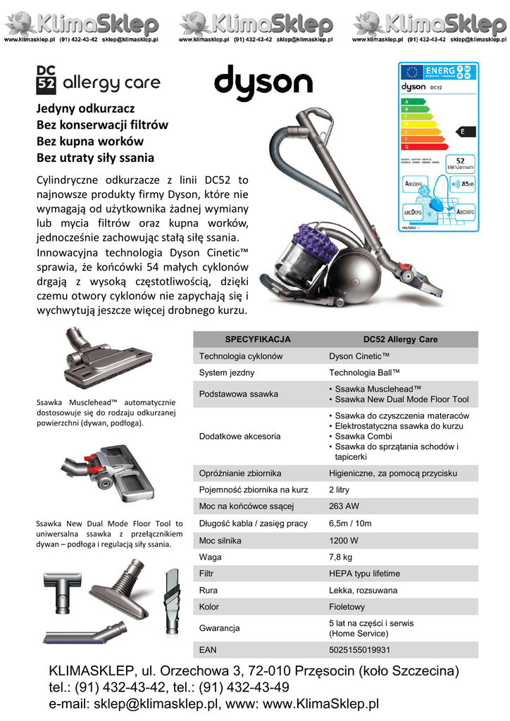 Jedyny odkurzacz Bez konserwacji filtrów Bez kupna worków Bez utraty siły ssania Cylindryczne odkurzacze z linii DC52 to najnowsze produkty firmy Dyson, które nie wymagają od użytkownika żadnej wymiany lub mycia filtrów oraz kupna worków, jednocześnie zachowując stałą siłę ssania. Innowacyjna technologia Dyson Cinetic™ sprawia, że końcówki 54 małych cyklonów drgają z wysoką częstotliwością, dzięki czemu otwory cyklonów nie zapychają się i wychwytują jeszcze więcej drobnego kurzu. SPECYFIKACJA Technologia cyklonów Dyson Cinetic™ System jezdny Technologia Ball™ Podstawowa ssawka • Ssawka Musclehead™ • Ssawka New Dual Mode Floor Tool Ssawka Musclehead™ automatycznie dostosowuje się do rodzaju odkurzanej powierzchni (dywan, podłoga). Dodatkowe akcesoria Ssawka New Dual Mode Floor Tool to uniwersalna ssawka z przełącznikiem dywan – podłoga i regulacją siły ssania. DC52 Allergy Care • • • • Ssawka do czyszczenia materaców Elektrostatyczna ssawka do kurzu Ssawka Combi Ssawka do sprzątania schodów i tapicerki Opróżnianie zbiornika Higieniczne, za pomocą przycisku Pojemność zbiornika na kurz 2 litry Moc na końcówce ssącej 263 AW Długość kabla / zasięg pracy 6,5m / 10m Moc silnika 1200 W Waga 7,8 kg Filtr HEPA typu lifetime Rura Lekka, rozsuwana Kolor Fioletowy Gwarancja 5 lat na części i serwis (Home Service) EAN 5025155019931 KLIMASKLEP, ul. Orzechowa 3, 72-010 Przęsocin (koło Szczecina) tel.: (91) 432-43-42, tel.: (91) 432-43-49 e-mail: [email protected], www: www.KlimaSklep.pl