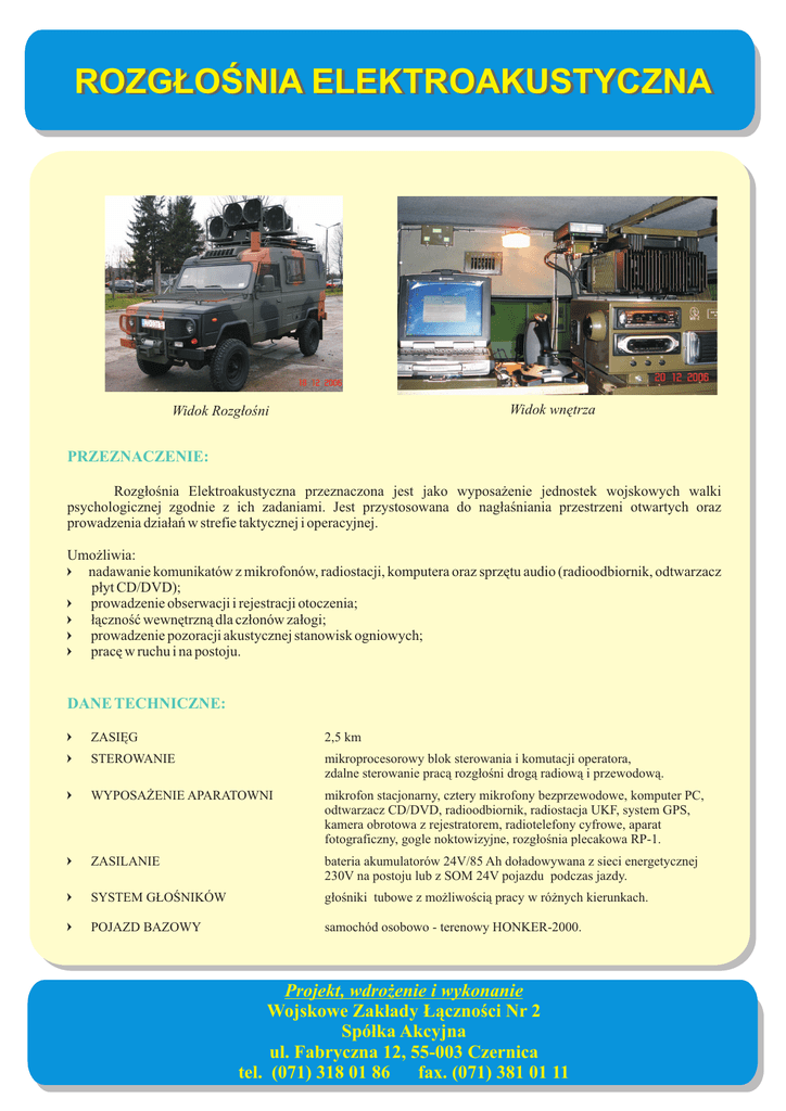 ROZGŁOŚNIA ELEKTROAKUSTYCZNA Widok wnętrza Widok Rozgłośni PRZEZNACZENIE: Rozgłośnia Elektroakustyczna przeznaczona jest jako wyposażenie jednostek wojskowych walki psychologicznej zgodnie z ich zadaniami. Jest przystosowana do nagłaśniania przestrzeni otwartych oraz prowadzenia działań w strefie taktycznej i operacyjnej. Umożliwia: = nadawanie komunikatów z mikrofonów, radiostacji, komputera oraz sprzętu audio (radioodbiornik, odtwarzacz płyt CD/DVD); = prowadzenie obserwacji i rejestracji otoczenia; = łączność wewnętrzną dla członów załogi; = prowadzenie pozoracji akustycznej stanowisk ogniowych; = pracę w ruchu i na postoju. DANE TECHNICZNE: = = ZASIĘG 2,5 km STEROWANIE mikroprocesorowy blok sterowania i komutacji operatora, zdalne sterowanie pracą rozgłośni drogą radiową i przewodową. = WYPOSAŻENIE APARATOWNI mikrofon stacjonarny, cztery mikrofony bezprzewodowe, komputer PC, odtwarzacz CD/DVD, radioodbiornik, radiostacja UKF, system GPS, kamera obrotowa z rejestratorem, radiotelefony cyfrowe, aparat fotograficzny, gogle noktowizyjne, rozgłośnia plecakowa RP-1. = ZASILANIE bateria akumulatorów 24V/85 Ah doładowywana z sieci energetycznej 230V na postoju lub z SOM 24V pojazdu podczas jazdy. = SYSTEM GŁOŚNIKÓW głośniki tubowe z możliwością pracy w różnych kierunkach. = POJAZD BAZOWY samochód osobowo - terenowy HONKER-2000. Projekt, wdrożenie i wykonanie Wykonanie Wojskowe Zakłady Łączności Nr 2 Zakłady Łączności Nr 2, Instytut Systemów Łączności, Wydział Elektroniki Wojskowe Spółka Akcyjna ul. Fabryczna 12, Wojskowa Akademia Techniczna, 55-003 Czernica Wrocławska ul. Kaliskiego 2, 00-908 Warszawa ul. Fabryczna 12, 55-003 Czernica tel. +48 22 6859517, fax +48tel. 22 685 90 38 (071) 318 01 86 fax. (071)tel. 381+48 0171 1131 80 194, fax wew. 111 Projekt