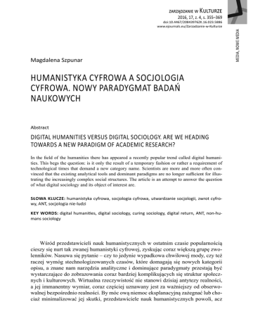 2016, 17, z. 4, s. 355–369 doi:10.4467/20843976ZK.16.023.5886 www.ejournals.eu/Zarzadzanie-w-Kulturze Magdalena Szpunar HUMANISTYKA CYFROWA A SOCJOLOGIA CYFROWA. NOWY PARADYGMAT BADAŃ NAUKOWYCH Abstract DIGITAL HUMANITIES VERSUS DIGITAL SOCIOLOGY. ARE WE HEADING TOWARDS A NEW PARADIGM OF ACADEMIC RESEARCH? In the field of the humanities there has appeared a recently popular trend called digital humanities. This begs the question: is it only the result of a temporary fashion or rather a requirement of technological times that demand a new category name. Scientists are more and more often convinced that the existing analytical tools and dominant paradigms are no longer sufficient for illustrating the increasingly complex social structures. The article is an attempt to answer the question of what digital sociology and its object of interest are. SŁOWA KLUCZE: humanistyka cyfrowa, socjologia cyfrowa, utwardzanie socjologii, zwrot cyfrowy, ANT, socjologia nie-ludzi KEY WORDS: digital humanities, digital sociology, curing sociology, digital return, ANT, non-humans sociology Wśród przedstawicieli nauk humanistycznych w ostatnim czasie popularnością cieszy się nurt tak zwanej humanistyki cyfrowej, zyskując coraz większą grupę zwolenników. Nasuwa się pytanie – czy to jedynie wypadkowa chwilowej mody, czy też raczej wymóg stechnologizowanych czasów, które domagają się nowych kategorii opisu, a znane nam narzędzia analityczne i dominujące paradygmaty przestają być wystarczające do zobrazowania coraz bardziej komplikujących się struktur społecznych i kulturowych. Wirtualna rzeczywistość nie stanowi dzisiaj antytezy realności, a jej immanentny wymiar, coraz częściej uznawany jest za ważniejszy od obserwowalnej bezpośrednio realności. By móc ową niemoc eksplanacyjną zażegnać lub chociaż minimalizować jej skutki, przedstawiciele nauk humanistycznych powoli, acz 355 MEDIA, NOWE MEDIA zarządzanie w Kulturze 356 Magdalena Szpunar MEDIA, NOWE MEDIA sukcesywnie przekonują się, że aparaty poznawcze, którymi się posiłkują, wymagają sięgnięcia do nauk ścisłych, a coraz częściej multi- i transdyscyplinarności. Humanistyka walczy dzisiaj o przetrwanie, o utrzymanie swojego status quo, w świecie zdominowanym przez Weberowską racjonalność i nieustannie replikowane procesy odczarowania świata. Niektórzy autorzy artykułują wręcz tezy o fazie heglowskiego zmierzchu, który jej dotyka. Czyżby zatem i u przedstawicieli nauk społecznych pojawiła się wbrew brzytwie Ockhama potrzeba mnożenia bytów ponad potrzebę, by nie dać się wyprzedzić nieco atrakcyjniejszej i nie bójmy się tego słowa – prorynkowej, bo odzianej w cyfrowe szaty, humanistycznej siostrze? Chyba nie tyle chodzi tutaj o palmę pierwszeństwa w wyścigu o atrakcyjność, ile o sprostanie wymogom ucyfrowionego świata. Jeśli jednostki, a nawet całe grupy społeczne przenoszą sporą część swojej aktywności do przestrzeni wirtualnej, trudno nie oczekiwać, by socjolog pozostawał wobec tego faktu obojętnym, marginalizując rolę internetu w życiu współczesnego człowieka. Digitalny wymiar życia ma charakter totalizujący i zawłaszczający inne – nieusieciowione wymiary życia. Jedno jest pewne – o ile jeszcze kilka lat temu głosy dotyczące humanistyki cyfrowej były postrzegane jako zaklinanie rzeczywistości przez cyfrowych apologetów, o tyle obecnie właściwie nikt nie podważa zasadności istnienia tego paradygmatu w nauce. Coraz częściej zatem i u przedstawicieli nauk społecznych (do niedawna przecież humanistycznych) można zauważyć, iż nie pozostają obojętni wobec faktu „utwardzania” humanistyki, czego wypadkową są chociażby: nurt STS (Science Technology and Society), analiza sieciowa1, SCOT (Social Construction of Technology)2, software studies3 czy ANT4. W literaturze coraz częściej pisze się o technohumanistach (por. Balsamo 2011), którzy w swojej pracy naukowej łączą zainteresowanie humanistyką z fascynacją technologią. Obserwowane zmiany są daleko głębiej idące, przekształcając i sam podmiot socjologicznego badania, gdyż spora część socjologicznego dyskursu poświęcona jest dzisiaj – co wydaje się dla wielu całkowicie 1 Analiza sieciowa (Social Network Analysis), określana czasem mianem socjologii matematycznej, łączy w sobie osiągnięcia socjologii i matematyki, zajmując się badaniem sieci społecznych, dzięki wykorzystaniu teorii grafów czy teorii prawdopodobieństwa. W obrębie analizy sieciowej bada się centralność, gęstość i siłę powiązań, ale także kierunek czy odwzajemnianie powiązań. Szerzej na ten temat: Turner, Maryanski (2004: 604–613). 2 Społeczna konstrukcja technologii (SCOT) to konstruktywistyczna teoria innowacji technologicznych inspirowana socjologią wiedzy. Opiera się na założeniu, że technologie stanowią wytwór praktyki społecznej, a sama technologia nie determinuje ludzkiego działania. Zgodnie z założeniami SCOT zrozumienie technologii jest niemożliwe z pominięciem kontekstu społecznego. 3 Software studies to interdyscyplinarne studia, które ogniskują się na społecznych i kulturowych aspektach funkcjonowania oprogramowania, traktując je jako swoisty artefakt. 4 ANT (Actor-Network Theory) to koncepcja powstała w nurcie badań nad nauką, a za głównego jej inicjatora uznaje się Brunona Latoura. Nierzadko ANT określa się jako socjologię rzeczy. ANT jednocześnie nie jest teorią, a raczej metodą, której cel stanowi „podążanie za aktorem”, a więc rejestrowanie czynności aktora w momencie działania. ANT za przedmiot swojego zainteresowania uznaje procesy tworzenia i osłabiania sieci, nie zaś sieci jako struktury. Dla naszych rozważań dotyczących technologicznie zanurzonej humanistyki cyfrowej ważne jest wskazanie, że dla Latoura wytwory człowieka stanowią o jego człowieczeństwie. ZARZĄDZANIE W KULTURZE 2016, 17, z. 4 