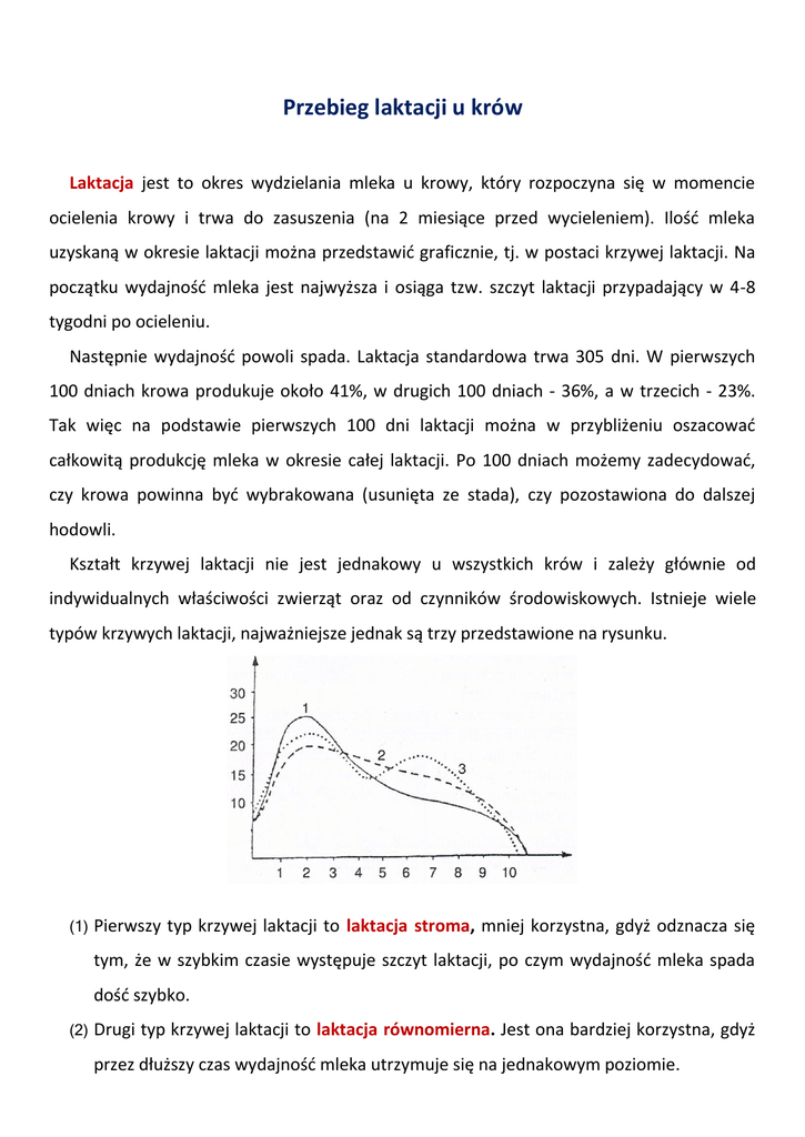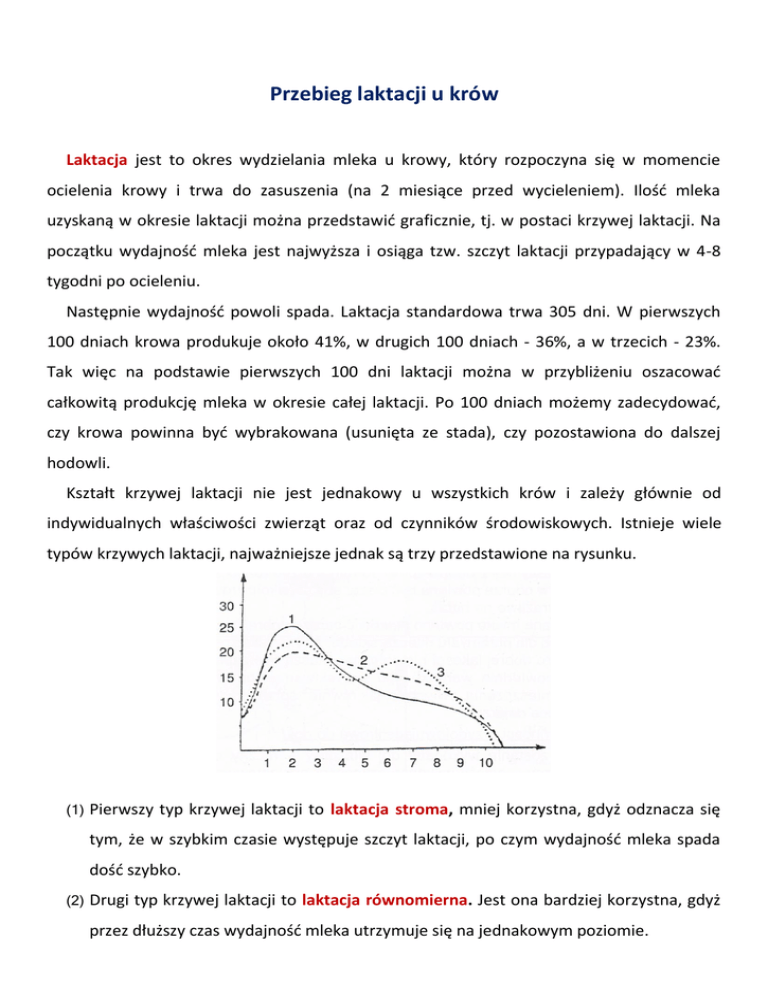 Przebieg laktacji u krów Laktacja jest to okres wydzielania mleka u krowy, który rozpoczyna się w momencie ocielenia krowy i trwa do zasuszenia (na 2 miesiące przed wycieleniem). Ilość mleka uzyskaną w okresie laktacji można przedstawić graficznie, tj. w postaci krzywej laktacji. Na początku wydajność mleka jest najwyższa i osiąga tzw. szczyt laktacji przypadający w 4-8 tygodni po ocieleniu. Następnie wydajność powoli spada. Laktacja standardowa trwa 305 dni. W pierwszych 100 dniach krowa produkuje około 41%, w drugich 100 dniach - 36%, a w trzecich - 23%. Tak więc na podstawie pierwszych 100 dni laktacji można w przybliżeniu oszacować całkowitą produkcję mleka w okresie całej laktacji. Po 100 dniach możemy zadecydować, czy krowa powinna być wybrakowana (usunięta ze stada), czy pozostawiona do dalszej hodowli. Kształt krzywej laktacji nie jest jednakowy u wszystkich krów i zależy głównie od indywidualnych właściwości zwierząt oraz od czynników środowiskowych. Istnieje wiele typów krzywych laktacji, najważniejsze jednak są trzy przedstawione na rysunku. (1) Pierwszy typ krzywej laktacji to laktacja stroma, mniej korzystna, gdyż odznacza się tym, że w szybkim czasie występuje szczyt laktacji, po czym wydajność mleka spada dość szybko. (2) Drugi typ krzywej laktacji to laktacja równomierna. Jest ona bardziej korzystna, gdyż przez dłuższy czas wydajność mleka utrzymuje się na jednakowym poziomie. (3) Trzeci typ krzywej laktacji - dwuwierzchołkowa - występuje u krów ocielonych późną jesienią lub wczesną zimą. Pierwszy szczyt laktacji - fizjologiczny przypada na pierwsze miesiące po wycieleniu. W momencie, gdy wydajność spada (ok. 5 miesięcy po wycieleniu), rozpoczyna się sezon pastwiskowy. Wiadomo, iż pastwisko jest najlepszą paszą dla krów, dzięki czemu wydajność wzrasta, osiągając tzw. drugi szczyt laktacji, który jest niższy od pierwszego, ale przyczynia się do podwyższenia wydajności mleka za całą laktację. Dlatego najlepiej tak ustawiać rozród w stadzie, aby krowy cieliły się w okresie jesienno-zimowym. Przeprowadzenie doju Zasady prawidłowego doju Dój jest czynnością pracochłonną i stanowi 50-60% nakładów pracy w chowie bydła mlecznego. Chcąc uzyskać maksymalną ilość mleka, o dobrej jakości higienicznej, należy odpowiednio przygotować pomieszczenie, w którym będzie odbywał się dój, a także urządzenia dojarskie i krowę. Dój powinien odbywać się zawsze o tej samej porze, gdyż krowy łatwo przyzwyczajają się do określonego rytmu. Punktualność dojenia ma szczególne znaczenie w wypadku krów o wysokiej wydajności, u których może wystąpić samorzutne oddawanie mleka w razie znacznego opóźnienia pory dojenia. Wszelkie raptowne zmiany pory doju, lub opuszczenie któregoś z nich, powodują obniżenie mleczności, a także wpływają ujemnie na zdrowotność wymienia. Na około pół godziny przed rozpoczęciem doju obora powinna być przewietrzona i uporządkowana (zakończone karmienie, usuwanie obornika, ścielenie). Trzeba bowiem pamiętać, że mleko bardzo łatwo wchłania zapachy pochodzące z paszy czy z obornika. Na 15 minut przed rozpoczęciem doju w oborze powinna być cisza, aby uspokoić krowy, które są wrażliwe na hałas. Pozyskane mleko powinno stanowić bardzo dobrej jakości surowiec dla przemysłu mleczarskiego. Aby uzyskać mleko o bardzo dobrej jakości higienicznej, muszą być zapewnione odpowiednie warunki jego pozyskiwania, zarówno czyste pomieszczenia, zwierzęta, jak również sprzęt do doju i czyste ręce dojarza. Czynności przygotowujące krowę do doju Zanim zostanie wykonany dój właściwy - ręczny czy mechaniczny - należy wykonać czynności przygotowujące krowę, które nie powinny trwać dłużej niż 1-2 minuty. Przeddajanie Jest to pierwsza czynność, która polega na zdojeniu z każdej ćwiartki wymienia pierwszych strug mleka w celu sprawdzenia jego barwy i konsystencji. Barwa mleka powinna być biała do kremowej, a konsystencja płynna. Wszelkie zmiany w barwie czy konsystencji mleka świadczą o tym, że krowa ma chore wymię. Przeddajanie ma także na celu usunięcie z kanałów strzykowych mleka, które jest najbardziej zanieczyszczone. Przeddajanie wykonujemy do specjalnego naczynka - przeddajacza z czarną emaliowaną płytką. Jest to bardzo ważna czynność i dlatego wykonywana jest jako pierwsza, gdyż w razie wystąpienia zmian w mleku, świadczących o zapaleniu wymienia, mleko od jednej krowy może wpłynąć na zakażenie całości mleka (zbiorczego). Mleka z przeddajacza nie wolno wylewać ani pod krowę, ani do kanału gnojowego. Należy je zniszczyć poza oborą, a krowę z chorym wymieniem należy wydoić na końcu. Oczyszczanie wymienia Jeśli wymię jest czyste wystarczy przetrzeć je suchą lub specjalnie nasączoną jednorazową ściereczką Jeśli zaś jest mocno zabrudzone, to należy je umyć w ciepłej wodzie z dodatkiem środka myjąco-dezynfekującego. Po umyciu wymię należy wytrzeć do sucha. Zaleca się stosowanie jednorazowych ściereczek, a nawet wycieranie każdego strzyku oddzielnym rogiem ściereczki. Masaż przedudojowy wymienia Wykonuje się go w celu pobudzenia układu nerwowego i wywołania wydzielenia się hormonu oksytocyny, a tym samym odruchu oddawania mleka. Na skutek masażu oraz pobudek nerwowych wywołanych przygotowaniami przeddojowymi (podniety optyczne i akustyczne, a zwłaszcza wywołane widokiem lub odgłosami obsługi, stukiem naczyń udojowych czy pracą pulsatora dojarki) zostaje wydzielony hormon - oksytocyna (hormon tylnego płata przysadki mózgowej). Dostaje się on z krwią do tkanki gruczołowej wymienia, powodując skurcz włókienek mięśniowych oplatających pęcherzyki mlekotwórcze i wydalanie mleka. Należy pamiętać, że oksytocyna działa krótko (4-7 minut) i w tym czasie krowa powinna być wydojona. Masaż wymienia wykonuje się całą dło