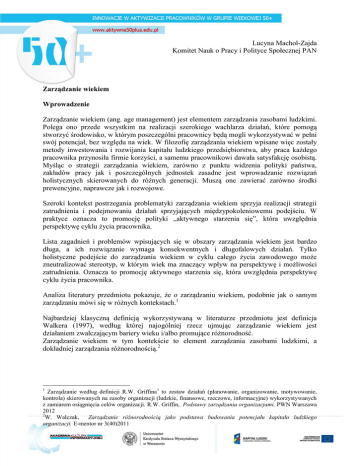 Lucyna Machol-Zajda Komitet Nauk o Pracy i Polityce Społecznej PAN Zarządzanie wiekiem Wprowadzenie Zarządzanie wiekiem (ang. age management) jest elementem zarządzania zasobami ludzkimi. Polega ono przede wszystkim na realizacji szerokiego wachlarza działań, które pomogą stworzyć środowisko, w którym poszczególni pracownicy będą mogli wykorzystywać w pełni swój potencjał, bez względu na wiek. W filozofię zarządzania wiekiem wpisane więc zostały metody inwestowania i rozwijania kapitału ludzkiego przedsiębiorstwa, aby praca każdego pracownika przynosiła firmie korzyści, a samemu pracownikowi dawała satysfakcję osobistą. Myśląc o strategii zarządzania wiekiem, zarówno z punktu widzenia polityki państwa, zakładów pracy jak i poszczególnych jednostek zasadne jest wprowadzanie rozwiązań holistycznych skierowanych do różnych generacji. Muszą one zawierać zarówno środki prewencyjne, naprawcze jak i rozwojowe. Szeroki kontekst postrzegania problematyki zarządzania wiekiem sprzyja realizacji strategii zatrudnienia i podejmowaniu działań sprzyjających międzypokoleniowemu podejściu. W praktyce oznacza to promocję polityki „aktywnego starzenia się”, która uwzględnia perspektywę cyklu życia pracownika. Lista zagadnień i problemów wpisujących się w obszary zarządzania wiekiem jest bardzo długa, a ich rozwiązanie wymaga konsekwentnych i długofalowych działań. Tylko holistyczne podejście do zarządzania wiekiem w cyklu całego życia zawodowego może zneutralizować stereotyp, w którym wiek ma znaczący wpływ na perspektywę i możliwości zatrudnienia. Oznacza to promocję aktywnego starzenia się, która uwzględnia perspektywę cyklu życia pracownika. Analiza literatury przedmiotu pokazuje, że o zarządzaniu wiekiem, podobnie jak o samym zarządzaniu mówi się w różnych kontekstach.1 Najbardziej klasyczną definicją wykorzystywaną w literaturze przedmiotu jest definicja Walkera (1997), według której najogólniej rzecz ujmując zarządzanie wiekiem jest działaniem zwalczającym bariery wieku i/albo promujące różnorodność. Zarządzanie wiekiem w tym kontekście to element zarządzania zasobami ludzkimi, a dokładniej zarządzania różnorodnością.2 1 Zarządzanie według definicji R.W. Griffina 1 to zestaw działań (planowanie, organizowanie, motywowanie, kontrola) skierowanych na zasoby organizacji (ludzkie, finansowe, rzeczowe, informacyjne) wykorzystywanych z zamiarem osiągnięcia celów organizacji. R.W. Griffin, Podstawy zarządzania organizacjami. PWN Warszawa 2012 2 W. Walczak, Zarządzanie różnorodnością jako podstawa budowania potencjału kapitału ludzkiego organizacji. E-mentor nr 3(40)2011 Zrozumienie i branie pod uwagę różnic oraz ich zmienności pozwala wykorzystać kompetencje, potencjał i zdolności tkwiące w pracownikach, a w rezultacie pozwala uzyskać lepsze efekty w zakresie jakości i wyników pracy. Wzrost znaczenia problematyki zarządzania wiekiem Problematyka zarządzania wiekiem zyskuje na znaczeniu zarówno na płaszczyźnie społecznej jak i makro i mikroekonomicznej. Znaczenie to będzie rosło z wielu przyczyn: 3 1. Starzenie się zasobów pracy w Europie Niezaprzeczalne fakty demograficzne, których nie jesteśmy w stanie zmienić będą niosły za sobą istotne skutki społeczne, ekonomiczne i budżetowe. W wyniku spadku płodności we wszystkich krajach UE i starzenia się kohort powojennej generacji Baby Boom następuje zmniejszenie przeciętnego wieku czynnej zawodowo ludności. Proces starzenia się ludności obejmuje aspekty ilościowe, strukturalne, czasowe oraz przestrzenne. Innymi słowy starzenie się ludności oznacza starzenie się zasobów pracy. Rosnąca świadomość zachodzących na rynku pracy zmian i zagrożeń z tym związanych (niedobór pracowników, załamanie się systemów emerytalnych) stała się główną przesłanką pojawienia się koncepcji zarządzania wiekiem. Polityka zatrudnienia musi prowadzić do zwiększenia stopy pracujących, we wszystkich grupach wiekowych. Wobec starzenia się ludności aktywizacja zawodowa osób starszych nabiera jednak szczególnej wagi. Należy stworzyć warunki, możliwości i bodźce dla jak największej aktywności osób starszych. Zarządzanie wiekiem zostało wskazane jako istotny czynnik sprzyjający osiągnięciu założonych w polityce zatrudnienia celów i pomoc w dostosowywaniu się pracodawców do bezprecedensowych zmian w strukturze zasobów pracy. 2. Paradoks wieku i zatrudnienia Paradoks wieku i zatrudnienia polega na nieoczekiwanych skutkach zastosowania dość powszechnej w większości krajów UE polityki rozwiązywania problemów bezrobocia poprzez zwiększanie możliwości wcześniejszego przechodzenia na emeryturę. W warunkach wydłużania przeciętnej długości życia dezaktywizacja pracowników po 50. roku życia okazała się krótkoterminowym, rozwiązaniem palącego problemu bezrobocia, ale społeczno-ekonomiczne koszty tych decyzji we wszystkich krajach niesłychanie wzrosły. Zjawisko wcześniejszego przechodzenia na emeryturę osłabiło rolę systemów emerytalnych, zwiększyło koszty świadczeń – obciążeń składkowych i szerzej podatkowych, zwiększyło prekaryjność zatrudnienia i wykluczyło dużą grupę starszych osób z rynku pracy. Wśród pracodawców zmieniło 3 A.Walker, op.cit. percepcje wieku i utrwaliło wiele mitów na temat ograniczonej zdolności do pracy starszych pracowników. Mity te do dzisiaj utrudniają podejmowanie działań na rzecz dłuższej aktywizacji zawodowej pracowników 50+, choć dla wielu organizacji zbyt wczesne odejście pracowników w tej grupie wiekowej oznaczało utratę doświadczenia i now-how. Społeczne i ekonomiczne koszty polityki dezaktywizacji pracowników związanej z wiekiem jakkolwiek możliwe do przewidzenia nie były w pełni przewidziane ani przez rządy ani przez organizacje. 3. Imperatywy polityki publicznej Po okres