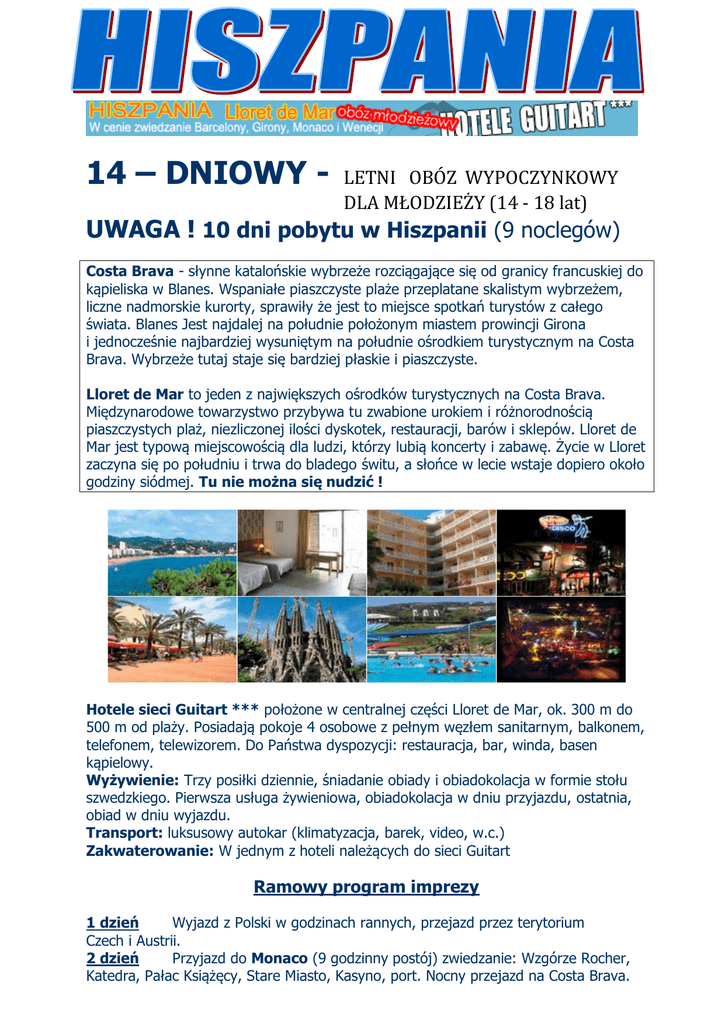 14 – DNIOWY - LETNI OBÓZ WYPOCZYNKOWY DLA MŁODZIEŻY (14 - 18 lat) UWAGA ! 10 dni pobytu w Hiszpanii (9 noclegów) Costa Brava - słynne katalońskie wybrzeże rozciągające się od granicy francuskiej do kąpieliska w Blanes. Wspaniałe piaszczyste plaże przeplatane skalistym wybrzeżem, liczne nadmorskie kurorty, sprawiły że jest to miejsce spotkań turystów z całego świata. Blanes Jest najdalej na południe położonym miastem prowincji Girona i jednocześnie najbardziej wysuniętym na południe ośrodkiem turystycznym na Costa Brava. Wybrzeże tutaj staje się bardziej płaskie i piaszczyste. Lloret de Mar to jeden z największych ośrodków turystycznych na Costa Brava. Międzynarodowe towarzystwo przybywa tu zwabione urokiem i różnorodnością piaszczystych plaż, niezliczonej ilości dyskotek, restauracji, barów i sklepów. Lloret de Mar jest typową miejscowością dla ludzi, którzy lubią koncerty i zabawę. Życie w Lloret zaczyna się po południu i trwa do bladego świtu, a słońce w lecie wstaje dopiero około godziny siódmej. Tu nie można się nudzić ! Hotele sieci Guitart *** położone w centralnej części Lloret de Mar, ok. 300 m do 500 m od plaży. Posiadają pokoje 4 osobowe z pełnym węzłem sanitarnym, balkonem, telefonem, telewizorem. Do Państwa dyspozycji: restauracja, bar, winda, basen kąpielowy. Wyżywienie: Trzy posiłki dziennie, śniadanie obiady i obiadokolacja w formie stołu szwedzkiego. Pierwsza usługa żywieniowa, obiadokolacja w dniu przyjazdu, ostatnia, obiad w dniu wyjazdu. Transport: luksusowy autokar (klimatyzacja, barek, video, w.c.) Zakwaterowanie: W jednym z hoteli należących do sieci Guitart Ramowy program imprezy 1 dzień Wyjazd z Polski w godzinach rannych, przejazd przez terytorium Czech i Austrii. 2 dzień Przyjazd do Monaco (9 godzinny postój) zwiedzanie: Wzgórze Rocher, Katedra, Pałac Książęcy, Stare Miasto, Kasyno, port. Nocny przejazd na Costa Brava. 3 dzień Przyjazd do Lloret de Mar, zakwaterowanie od godziny 14.00 3 -12 dzień Wypoczynek, wodne i słoneczne szaleństwa, wycieczki fakultatywne. W trakcie pobytu wycieczka do Barcelony i Girony 12 dzień Śniadanie wykwaterowanie, złożenie bagaży w wyznaczonym miejscu, czas wolny, wyjazd z Lloret w godzinach popołudniowych, przejazd do Girony (zwiedzanie miasta). Przejazd w kierunku Francji. 13 dzień Przyjazd do Wenecji (9 godzinny postój) zwiedzanie miasta zobaczymy: Plac Św. Marka, Dzwonnica, Pałac Dożów, mosty Westchnień i Rialto. Przejazd przez Włochy i Austrię. 14 dzień Przyjazd do Polski w godzinach dopołudniowych. Wycieczki Programowe (w cenie imprezy) Barcelona Całodzienna wycieczka w trakcie której stolicę Katalonii i światowej kultury zarazem: zwiedzimy Park Güel, zobaczymy słynną Sagrada Familia, Wzgórze Montjuic, stadion F.C. Barcelona Camp Nou (dla chętnych bilet wstępu)oraz dzielnicę gotycką Bario Gotico, pospacerujemy po najpiękniejszej ulicy świata - Ramblas, a wieczorem udamy się na Seans Grających Fontann - wspaniałe i niezapomniane widowisko. W Hotelu będziemy już po północy. Girona Girona, cudowne miasto z zabudową jeszcze z czasów rzymskich, łaźniami arabskimi, dawną żydowską dzielnicą, gotycką katedrą. Wycieczki fakultatywne: Water World (ok. 25 euro) Szalona kraina wodnych zabaw, zjeżdżalni, basenów.. nie tylko dla najmłodszych. Wieczór Hiszpański (ok. 35 euro) Wspaniały, szalony wieczór z regionalną kolacją i miejscowym winem, pokazami Flamenco, i zabawą przy hiszpańskich rytmach. Montserrat (ok. 38 euro) na wysokości 721 m wzniesiono klasztor w którym znajduje się figura Czarnej Madonny - patronki Katalonii. Pielgrzymi od tysiąca lat przybywają tu by pokłonić się patronce Katalonii. CENA : 1.950,00 PLN CENA OBEJMUJE : - zakwaterowanie (9 noclegów) w pokojach 4 osobowych (telewizor, telefon, WC , łazienka), - całodzienne wyżywienie ; (śniadanie, obiad, kolacja) w formie szwedzkiego bufetu, (pierwszy posiłek w Hiszpanii – obiadokolacja w dniu przyjazdu, ostatni – obiad w dniu wyjazdu ), - transport autokarem na całej trasie, - gorącą herbatę na trasie przejazdu z barku autokarowego, - opiekę pedagogiczną, - całodobową opiekę medyczną (zapewnia Ośrodek), - opiekę ratownika na plaży i przy basenach (zgodnie z regulaminem obozu), - wycieczki autokarowe do BRACELONY, GIRONI, - zwiedzanie MONACO w drodze do Hiszpanii, - zwiedzanie WENECJI w drodze powrotnej do Polski, - opłatę klimatyczną, - korzystanie ze sprzętu sportowo - rekreacyjnego w ośrodku oraz leżaków przy basenie, - ubezpieczenie NNW i KL poza granicami kraju. CENA NIE OBEJMUJE : - napojów do posiłków obiadowych i kolacji, serwowana jest woda do picia, - płatnych imprez fakultatywnych organizowanych przez Hotel i na życzenie uczestników, - dyskotek - dodatkowo płatnych dla osób, które ukończyły 16 lat (ok.5 EUR wstęp) UWAGA ! – na dodatkowe ciepłe posiłki na trasie przejazdu należy posiadać ok.20/30 EUR i 20/30,00 PLN. UCZESTNICY : - ilość uczestników w jednym turnusie: max 45 osób, - wszystkich obowiązują „Ogólne warunki uczestnictwa w imprezach turystycznych organizowanych przez BTKiZ „STANPOL” TERMINY OBOZU; HCB/001/11 22.07 – 04.08.2011 ORGANIZATOR :BIURO TURYSTYKI KRAJOWEJ I ZAGRANICZNEJ Właściciele BARBARA i STANISŁAW PRZYTUŁA ZEZWOLENIE ; Wpis do Rejestru ORGANIZATORÓW TURYSTYKI i POŚREDNIKÓW TURYSTYCZNYCH Województwa Lubelskiego Nr 036 SIEDZIBA ; 21-010 Łęczna , ul. Stefanii Pawlak 3 tel./fax 81 752 15 75 WPŁATY ; kasa Biura lub w PKO BP 1 Oddział Lublin Nr 13 1020 3147 0000 8102 0052 8323 e-mail: [email protected] www.stanpol.info