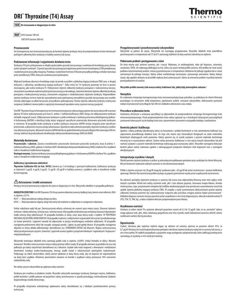 DRI® Thyroxine (T4) Assay Do stosowania w diagnostyce in vitro 0454 (zestaw 100 ml) 10013070 (zestaw 500 ml) Przeznaczenie Przygotowywanie i przechowywanie odczynników Ten homogeniczny test immunoenzymatyczny do kontroli stężenia tyroksyny służy do przeprowadzania testów ilościowych pod kątem całkowitej ilości tyroksyny w ludzkiej surowicy lub osoczu. Odczynniki są gotowe do użycia. Odczynniki nie wymagają przygotowania. Wszystkie składniki testu prawidłowo przechowywane w temperaturze od 2°C do 8°C zachowują stabilność do daty ważności określonej na etykiecie. Podstawowe informacje i wyjaśnienie działania testu Pobieranie próbek i postępowanie z nimi Tyroksyna (T4) jest syntetyzowana w obrębie pęcherzyków gruczołu tarczycowego i uwalniana do krwiobiegu przez złożony system sprzężeń zwrotnych1. Czynność gruczołu tarczycowego jest regulowana przez hormon tyreotropowy (TSH) produkowany i wydzielany przez przysadkę mózgową. Produkcja i wydzielanie hormonu TSH przez przysadkę przebiega w drodze stymulacji przez tyreoliberynę (TRH), która jest uwalniana przez podwzgórze. Większość tyroksyny obecnej w krwiobiegu wiąże się przede wszystkim z globuliną wiążącą tyroksynę (TBG) oraz, w drugiej kolejności, z albuminą i prealbuminą wiążącą tyroksynę2,3. Tylko mniej niż 1% tyroksyny pozostaje we krwi w postaci niezwiązanej, jako wolna tyroksyna T4. Podwyższone stężenie całkowitej tyroksyny powiązano z nadczynnością tarczycy, schorzeniem wywołanym nadmierną ilością hormonu tarczycy w krwiobiegu, natomiast obniżone stężenie całkowitej tyroksyny powiązano z niedoczynnością tarczycy, schorzeniem związanym z niedostatecznym stężeniem tyroksyny. Nieprawidłowe stężenie tyroksyny we krwi może być spowodowane przez podstawową niewydolność gruczołu tarczycowego oraz wszelkie choroby wpływające na układ tarczycowo-przysadkowo-podwzgórzowy. Pomiar stężenia całkowitej tyroksyny (wolnej oraz związanej z białkiem) stanowi jeden z najczęściej stosowanych sposobów oceny czynności tarczycy pacjenta4. Test DRI® Thyroxine Assay to homogeniczny test immunoenzymatyczny wykorzystujący gotowe do użycia odczynniki w postaci płynnej. W teście wykorzystywany jest kwas 8- anilino-1-naftalenosulfonowy (ANS) służący do oddysocjowania tyroksyny od białek wiążących osocze. Oddysocjowana tyroksyna w próbce konkuruje z tyroksyną oznaczoną dehydrogenazą glukozo6-fosforanową (G6PDH) o określoną liczbę miejsc wiążących specyficzne przeciwciała skierowane przeciwko tyroksynie w roztworze. W przypadku braku tyroksyny w próbce tyroksyna oznaczona G6PDH zostaje związana przez specyficzne przeciwciało, a aktywność enzymu zostaje zahamowana. Zjawisko to rodzi zależność pomiędzy stężeniem tyroksyny w próbce oraz aktywnością enzymu. Aktywność enzymu G6PDH określa się spektrofotometrycznie przy długości fali wynoszącej 340 nm, mierząc zdolność do przekształcania dinukleotydu nikotynoamidoadeninowego (NAD) do NADH. Materiały dostarczone Przeciwciało / substrat. Zawiera monoklonalne przeciwciało skierowane przeciwko tyroksynie, kwas 8-anilino-1naftalenosulfonowy (ANS), glukozo-6-fosforan (G6P) i dinukleotyd nikotynoamidoadeninowy (NAD) w buforze Tris z azydkiem sodu w charakterze środka konserwującego. Koniugat enzymu. Zawiera tyroksynę oznaczoną dehydrogenazą glukozo-6-fosforanową (G6PDH) w buforze Tris z azydkiem sodu w charakterze środka konserwującego. Kalibratory (sprzedawane oddzielnie) Thyroxine Calibrator Kit (nr kat. 0476): Zawiera po 2 ml każdego z ujemnych kalibratorów, kalibratory tyroksyny w stężeniach 2 µg/dl, 4 µg/dl, 8 µg/dl, 12 µg/dl i 20 µg/dl w ludzkiej surowicy z azydkiem sodu w charakterze środka konserwującego. Ostrzeżenia i środki ostrożności Niniejszy test jest przeznaczony wyłącznie do użycia w diagnostyce in vitro. Odczynniki szkodliwe w przypadku połknięcia. NIEBEZPIECZEŃSTWO: Test DRI Thyroxine (T4) Assay zawiera albuminę surowicy bydlęcej (ang. bovine serum albumin, BSA) w stężeniu ≤0,1%. H317 — Może powodować reakcję alergiczną skóry. H334 — Może powodować objawy alergii lub astmy lub trudności w oddychaniu w następstwie wdychania. Unikać wdychania mgły lub par. Zanieczyszczonej odzieży ochronnej nie wynosić poza miejsce pracy. Stosować rękawice ochronne / odzież ochronną / ochronę oczu / ochronę twarzy. W przypadku niedostatecznej wentylacji stosować indywidualne środki ochrony dróg oddechowych. W przypadku kontaktu ze skórą: umyć dużą ilością wody z mydłem. W PRZYPADKU DOSTANIA SIĘ DO DRÓG ODDECHOWYCH: W przypadku trudności z oddychaniem wyprowadzić lub wynieść poszkodowanego na świeże powietrze i zapewnić warunki do odpoczynku w pozycji umożliwiającej swobodne oddychanie. W przypadku wystąpienia podrażnienia skóry lub wysypki: zasięgnąć porady / zgłosić się pod opiekę lekarza. W przypadku wystąpienia objawów ze strony układu oddechowego: skontaktować się z OŚRODKIEM ZATRUĆ lub lekarzem. Wyprać zanieczyszczoną odzież przed ponownym użyciem. Zawartość / pojemnik usuwać zgodnie z przepisami lokalnymi / regionalnymi / krajowymi / międzynarodowymi. Odczynniki stanowiące składniki testu zawierają azydek sodu w stężeniu ≤0,09%. Unikać kontaktu ze skórą i błonami śluzowymi. Wszelkie zanieczyszczone miejsca należy przemyć obficie wodą. W przypadku dostania się produktu do oczu lub połknięcia go należy natychmiast skontaktować się z lekarzem. Azydek sodu może reagować z ołowianymi i miedzianymi elementami instalacji wodno-kanalizacyjnej, tworząc azydki metali o właściwościach potencjalnie wybuchowych. Pozbywając się takich odczynników, należy zawsze spłukiwać je dużą ilością wody, aby nie dopuścić do nagromadzenia się dużej ilości azydków. Metalowe powierzchnie narażone na kontakt z azydkami należy przemywać 10% ro