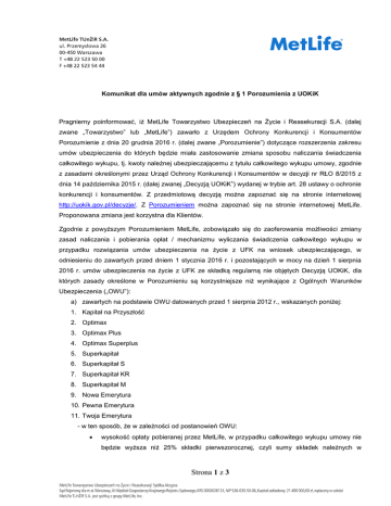 Komunikat dla umów aktywnych zgodnie z § 1 Porozumienia z UOKiK Pragniemy poinformować, iż MetLife Towarzystwo Ubezpieczeń na Życie i Reasekuracji S.A. (dalej zwane „Towarzystwo” lub „MetLife”) zawarło z Urzędem Ochrony Konkurencji i Konsumentów Porozumienie z dnia 20 grudnia 2016 r. (dalej zwane „Porozumienie”) dotyczące rozszerzenia zakresu umów ubezpieczenia do których będzie miała zastosowanie zmiana sposobu naliczania świadczenia całkowitego wykupu, tj. kwoty należnej ubezpieczającemu z tytułu całkowitego wykupu umowy, zgodnie z zasadami określonymi przez Urząd Ochrony Konkurencji i Konsumentów w decyzji nr RŁO 8/2015 z dnia 14 października 2015 r. (dalej zwanej „Decyzją UOKiK”) wydanej w trybie art. 28 ustawy o ochronie konkurencji i konsumentów. Z przedmiotową decyzją można zapoznać się na stronie internetowej http://uokik.gov.pl/decyzje/. Z Porozumieniem można zapoznać się na stronie internetowej MetLife. Proponowana zmiana jest korzystna dla Klientów. Zgodnie z powyższym Porozumieniem MetLife, zobowiązało się do zaoferowania możliwości zmiany zasad naliczania i pobierania opłat / mechanizmu wyliczania świadczenia całkowitego wykupu w przypadku rozwiązania umów ubezpieczenia na życie z UFK na wniosek ubezpieczającego, w odniesieniu do zawartych przed dniem 1 stycznia 2016 r. i pozostających w mocy na dzień 1 sierpnia 2016 r. umów ubezpieczenia na życie z UFK ze składką regularną nie objętych Decyzją UOKiK, dla których zasady określone w Porozumieniu są korzystniejsze niż wynikające z Ogólnych Warunków Ubezpieczenia („OWU”): a) zawartych na podstawie OWU datowanych przed 1 sierpnia 2012 r., wskazanych poniżej: 1. Kapitał na Przyszłość 2. Optimax 3. Optimax Plus 4. Optimax Superplus 5. Superkapitał 6. Superkapitał S 7. Superkapitał KR 8. Superkapitał M 9. Nowa Emerytura 10. Pewna Emerytura 11. Twoja Emerytura - w ten sposób, że w zależności od postanowień OWU: wysokość opłaty pobieranej przez MetLife, w przypadku całkowitego wykupu umowy nie będzie wyższa niż 25% składki pierwszorocznej, czyli sumy składek należnych w Strona 1 z 3 pierwszym roku polisowym, jednakże nie więcej niż 5.000 zł (słownie: pięć tysięcy złotych) lub mechanizm wyliczenia świadczenia całkowitego wykupu spowoduje pomniejszenie świadczenia całkowitego wykupu o 25% składki pierwszorocznej, czyli sumy składek należnych w pierwszym roku polisowym, jednakże nie więcej niż o 5.000 zł (słownie: pięć tysięcy złotych), chyba że OWU tych umów przewidują rozwiązanie korzystniejsze; b) zawartych na podstawie OWU wskazanych poniżej: 1. Plan Inwestycyjny Cassiopeia Indywidualne ubezpieczenie na życie z ubezpieczeniowym funduszem kapitałowym typ "GN", 2. Plan Inwestycyjny Cassiopeia Plus Indywidualne ubezpieczenie na życie z ubezpieczeniowym funduszem kapitałowym typ "GN" oraz ubezpieczeniem od następstw NW - w ten sposób, że mechanizm wyliczenia świadczenia całkowitego wykupu spowoduje pomniejszenie świadczenia całkowitego wykupu o 25% składki pierwszorocznej, czyli sumy składek należnych w pierwszym roku polisowym, jednakże nie więcej niż o 5.000 zł (słownie: pięć tysięcy złotych), chyba że OWU tych umów przewidują rozwiązanie korzystniejsze. W celu wykonania Porozumienia MetLife w ciągu 4 miesięcy od dnia 1 stycznia 2017 r. wyśle listem zwykłym każdemu ubezpieczającemu posiadającemu pozostającą w mocy na dzień zawarcia Porozumienia tj 20 grudnia 2016 r. umowę ubezpieczenia na życie z UFK zawartą na podstawie wzorca wskazanego powyżej, w której, w zależności od postanowień OWU, opłaty pobierane w przypadku całkowitego wykupu umowy, wynikające z Porozumienia, będą korzystniejsze niż wynikające z OWU lub mechanizm wyliczania świadczenia całkowitego wykupu wynikający z Porozumienia będzie korzystniejszy niż wynikający z OWU: a) komunikat zawierający informacje: - o wynikającej z treści Porozumienia możliwości zmiany wysokości opłat pobieranych w przypadku całkowitego wykupu umowy / mechanizmu wyliczania świadczenia całkowitego wykupu; - o bezterminowej możliwości podpisania aneksu do umowy, który zmienia treść umowy poprzez zmianę wysokości opłat pobieranych w przypadku całkowitego wykupu umowy / mechanizmu wyliczania świadczenia całkowitego wykupu; - o terminie, od którego nastąpi zmiana wysokości opłat pobieranych w przypadku całkowitego wykupu umowy / mechanizmu wyliczania świadczenia całkowitego wykupu; Strona 2 z 3 - o tym, że akceptacja aneksu do umowy nie wyłącza ani nie ogranicza uprawnień ubezpieczającego do dochodzenia dalej idących roszczeń dotyczących całkowitego wykupu umowy na drodze cywilnoprawnej. b) ofertę zawarcia aneksu do umowy, który zmienia treść umowy ubezpieczenia na życie z UFK poprzez zmianę wysokości opłat pobieranych w przypadku całkowitego wykupu umowy / mechanizmu wyliczania świadczenia całkowitego wykupu. Akceptacja aneksu, o którym mowa powyżej nie wyłącza ani nie ogranicza uprawnień ubezpieczającego do dochodzenia dalej idących roszczeń dotyczących całkowitego wykupu umowy na drodze cywilnoprawnej. Do czasu wysyłki aneksów, o których mowa powyżej, a także po ich wysłaniu w przypadku braku akceptacji aneksu, w przypadku wnioskowania o całkowity wykup umowy przez ubezpieczającego, będącego stroną umowy ubezpieczenia na życie z UFK, zawartej na podstawie wzorca, o którym mowa powyżej, oraz w której, w zależności od postanowień OWU, opłaty pobierane w przypadku całkowitego wykupu umowy, wynikające z Porozumienia, będą korzystniejsze niż wynikające z OWU lub mechanizm wyliczania świadczenia całkowitego wykupu wynikający z Porozumienia będzie korzystniejszy niż wynikający z OWU, MetLife w nagrywanej, telefonicznej rozmowie poinformuje ubezpieczającego o możliwości zawarcia aneksu do wypowiadanej umowy ubezpieczenia,