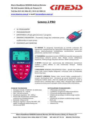 Biuro Handlowe KINESIS Andrzej Boruta 38-440 Iwonicz Zdrój, ul. Penara 23 Tel/fax 013-43-506-45 / 013-42-500-22 www.kinesis.com.pl e-mail: [email protected] Genesy 2 PRO 50 PROGRAMÓW PROGRAMOWANY JONOFOREZA (Prądy galwaniczne): 1 program. ZMIENNE PARAMETRY: Parametry mogą być zmieniane przez użytkownika w czasie pracy. PODŚWIETLANY MONITOR 23 REHAB: Te programy stymulacyjne są szeroko wskazane dla regeneracji czynnościowej po operacjach chirurgicznych stawów i po okresie unieruchomienia (rehabilitacja czynnościowa, porażenie połowiczne, spastyczność i urologia). 17 PAIN(BÓL): stymulacja nerwów (TENS) jest szeroko stosowana do eliminowania różnych postaci bólu. Dzięki swoim delikatnym impulsom, TENS pomaga odzyskać zdrowie i dobre samopoczucie. 3 SPORT: Genesy2 jest opracowany aby selektywnie stymulować szybkie i wolne włókna w celu trenowania różnych funkcji mięśniowych. 3 WELLNESS: DOMOWA PIELĘGNACJA CIAŁA – sposób aby zadbać o swoje ciało, stracić zbędne kilogramy i utrzymać ciało w doskonałej formie fizycznej. 3 BEAUTY (URODA): Piękne ciało wyraża dobre samopoczucie i naszym obowiązkiem jest chronienie go przed działaniem czasu i siedzącym trybem życia. Dziś ten aspekt jest uważany za ważny w naszym życiu i możemy dbać o nasze ciało i utrzymać jego witalność za pomocą estetycznych zabiegów, które oferuje elektrostymulacja. FUNKCJE TECHNICZNE o Dostępne kanały: 2 KANAŁY (4 elektrody) o Częstotliwość: 0 – 120 Hz o Moc: 100 mA na kanał o Amplituda impulsów 50 – 400 µs o Postać fali: Kwadratowa, dwufazowa symetryczna skompensowana o Zasilanie: 4 Baterie AA o Atestacja: Zgodny z normą ISO 9001, EN 46001 urządzenia elektromedyczne. Atestowany MDD WYPOSAŻENIE STANDARDOWE : o 1 Pokrowiec przenośny o 1 GENESY2 urządzenie elektrostymulatora o 2 Przewody podłączenia elektrod o 4 Elektrody przylepne wielokrotnego użytku (5x5 cm) o 4 Elektrody przylepne wielokrotnego użytku (5x9 cm) o 1 Instrukcja obsługi o 4 Baterie AA Biuro Handlowe KINESIS Andrzej Boruta 38-440 Iwonicz Zdrój, ul. Penara 23 Bank: PBS 10 8642 1041 2006 4006 9177 0002 NIP: 684-107-94-34 REGON:370192926 Biuro Handlowe KINESIS Andrzej Boruta 38-440 Iwonicz Zdrój, ul. Penara 23 Tel/fax 013-43-506-45 / 013-42-500-22 www.kinesis.com.pl e-mail: [email protected] LISTA PROGRAMÓW: PROGRAMY – PAIN (Ból) Tens - Znieczulający Tens - Uśmierzający Tens - Impuls Tens – znieczulający ostre zapalenie Tens – znieczulający chroniczne zapalenie Zapalenie chrząstki rzepki (kolano) Bóle szyjne Kręcz szyi Dolne bóle krzyża Zapalenie nadkłykcia Zapalenie okołostawowe barkowo-ramienne (ramię) Zespół cieśni nadgarstka Nerwoból szyjno-barkowy Anty-stres Nudności Choroba zwyrodnieniowa biodra Ból menstruacyjny PROGRAMY REHAB PROGRAMY JONOFOREZY Jonoforeza PROGRAMY URODA Unaczynianie Osuszanie Lipoliza PROGRAMY WELLNESS Ujędrnianie Napinanie Zapobieganie skurczom PROGRAMY SPORT Siła Maksimum Siła Odporność Przyrost masy Demo Krwiak Przykurcz mięśni Leczenie napięcia mięśni, kończyny górne 1 Leczenie napięcia mięśni, kończyny górne 2 Mobilizacja, kończyny górne Umięśnienie, kończyny górne Leczenie napięcia mięśni, kończyny dolne 1 Leczenie napięcia mięśni, kończyny dolne 2 Mobilizacja, kończyny dolne Umięśnienie kończyny dolne Leczenie napięcia mięśni, ramiona Mobilizacja, ramiona Umięśnienie ramiona Leczenie napięcia mięśni, kostka Mobilizacja, kostka Umięśnienie, kostka Porażenie połowiczne Spastyczność Wzmocnienie mięśni, stopa (płaskostopie) Niewygoda, Różnorodny Niewygoda, Pęcherz Niewygoda, spowodowana stresem Biuro Handlowe KINESIS Andrzej Boruta 38-440 Iwonicz Zdrój, ul. Penara 23 Bank: PBS 10 8642 1041 2006 4006 9177 0002 NIP: 684-107-94-34 REGON:370192926
