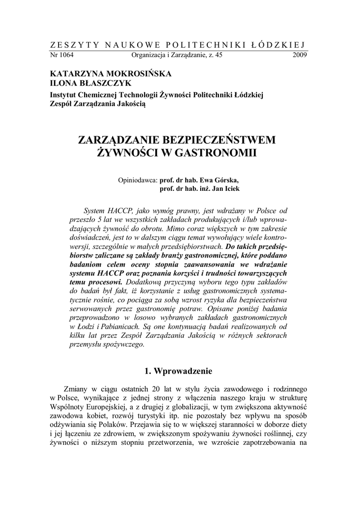 ZESZYTY NAUKOWE POLITECHNIKI ŁÓDZKIEJ Nr 1064 Organizacja i Zarządzanie, z. 45 2009 KATARZYNA MOKROSIŃSKA ILONA BŁASZCZYK Instytut Chemicznej Technologii Żywności Politechniki Łódzkiej Zespół Zarządzania Jakością ZARZĄDZANIE BEZPIECZEŃSTWEM ŻYWNOŚCI W GASTRONOMII Opiniodawca: prof. dr hab. Ewa Górska, prof. dr hab. inż. Jan Iciek System HACCP, jako wymóg prawny, jest wdrażany w Polsce od przeszło 5 lat we wszystkich zakładach produkujących i/lub wprowadzających żywność do obrotu. Mimo coraz większych w tym zakresie doświadczeń, jest to w dalszym ciągu temat wywołujący wiele kontrowersji, szczególnie w małych przedsiębiorstwach. Do takich przedsiębiorstw zaliczane są zakłady branży gastronomicznej, które poddano badaniom celem oceny stopnia zaawansowania we wdrażanie systemu HACCP oraz poznania korzyści i trudności towarzyszących temu procesowi. Dodatkową przyczyną wyboru tego typu zakładów do badań był fakt, iż korzystanie z usług gastronomicznych systematycznie rośnie, co pociąga za sobą wzrost ryzyka dla bezpieczeństwa serwowanych przez gastronomię potraw. Opisane poniżej badania przeprowadzono w losowo wybranych zakładach gastronomicznych w Łodzi i Pabianicach. Są one kontynuacją badań realizowanych od kilku lat przez Zespół Zarządzania Jakością w różnych sektorach przemysłu spożywczego. 1. Wprowadzenie Zmiany w ciągu ostatnich 20 lat w stylu życia zawodowego i rodzinnego w Polsce, wynikające z jednej strony z włączenia naszego kraju w strukturę Wspólnoty Europejskiej, a z drugiej z globalizacji, w tym zwiększona aktywność zawodowa kobiet, rozwój turystyki itp. nie pozostały bez wpływu na sposób odżywiania się Polaków. Przejawia się to w większej staranności w doborze diety i jej łączeniu ze zdrowiem, w zwiększonym spożywaniu żywności roślinnej, czy żywności o niższym stopniu przetworzenia, we wzroście zapotrzebowania na 142 K. Mokrosińska, I. Błaszczyk produkty gotowe, czy na coraz bardziej różnorodne produkty sięgające do tradycji kulinarnych różnych Regionów Świata (kuchnia chińska, francuska, włoska, meksykańska, inne), co dzięki wzrostowi przepływu towarów, ludzi oraz informacji jest coraz łatwiej dostępne [16]. Wymienione powyżej zmiany pociągnęły za sobą także konieczność odżywiania się poza domem. Jak wynika z badań Polacy w dalszym ciągu jadają przede wszystkim w domu, ale systematycznie wzrasta liczba osób spożywających posiłki [13,15], czy organizujących imprezy rodzinne w restauracjach, pubach itp., co istotnie wpłynęło na rozwój sektora gastronomicznego. Z danych GUS wynika, iż liczba placówek gastronomicznych w Polsce w latach 1995-2005 wzrosła z 60,8 do 92 tysięcy, czyli o ponad 50%. Natomiast w latach 2005-2008 ich liczba zmalała do 81,7 tysięcy [8,9], na co miało wpływ wiele czynników. Spośród znaczących wymienić należy brak finansów, ale także w wielu przypadkach brak determinacji właścicieli placówek gastronomicznych w ich dostosowywaniu do obecnie obowiązujących wymagań prawnych w zakresie dobrej praktyki produkcyjnej (Good Manufacturing Practice GMP), jako podstawy gwarantowania bezpieczeństwa serwowanych posiłków. Jednak systematyczny wzrost egzekwowania wymagań prawnych ze strony Kontroli Urzędowych w tym zakresie oraz zaistniały kryzys gospodarczy w roku 2008, który niewątpliwie przełożył się na korzystanie z usług gastronomicznych, zaowocowały zamykaniem, zwłaszcza małych i średnich zakładów gastronomicznych. W chwili obecnej proces ten został wyhamowany, a aktualne dane pokazują, iż częstotliwość korzystania przez Polaków z usług gastronomicznych w pierwszym kwartale 2009 roku, w porównaniu z analogicznym okresem roku 2008 jest podobna, a przewidywane prognozy dla polskiej gastronomii na najbliższe lata są dobre [8]. Mając zatem na uwadze wzrost liczby osób korzystających z usług gastronomicznych, a tym samym wzrost liczby zakładów gastronomicznych, powinien być jednocześnie położony zwiększony nacisk na zapewnianie bezpieczeństwa serwowanych w tych zakładach potraw. Branża gastronomiczna jest bowiem branżą szczególną ze względu na wielkość zakładów (przewaga małych i mikrozakładów) oraz odmienny charakter produkcji w porównaniu z zakładami przemysłu spożywczego, z uwagi na ogromną różnorodność obrabianych surowców i produkowanych potraw, wahania w wielkości produkcji, przewagę operacji wykonywanych ręcznie itp. Odmienność tej branży powoduje, iż jest narażona na zwiększone ryzyko wystąpienia zagrożeń podczas realizacji łańcucha produkcyjnego. Potwierdzają ten fakt statystyki, wykazujące, iż mimo systematycznego podnoszenia standardów higienicznych, sytuacja w zakresie zatruć i zakażeń pokarmowych w odniesieniu do placówek żywienia zbiorowego, jest wciąż niezadowalająca [17]. Wymagania prawne w zakresie bezpieczeństwa żywności (tj. Rozporządzenie WE 852/2004 Parlamentu Europejskiego i Rady z 29.04.2004 „W sprawie higieny środków spożywczych” i Ustawa z 25.08.2006 „O bezpieczeństwie żywności i żywienia”, jako podstawa prawna do wdrożenia zasad GMP i systemu HACCP) wprawdzie nie wyróżniają w jakiś szczególny sposób sektora gastronomicznego i są dla tego sektora takie same, jak dla pozostałych sektorów branży spożywczej Zarządzanie bezpieczeństwem żywności w gastronomii 143 [6, 10, 11, 12], niemniej jednak specyfika tego sektora, o czym wspomniano wcześniej, wymaga szczególnie dużej staranności w przestrzeganiu zasad niezbędnych dla tegoż bezpieczeństwa, ujętych w ramach Dobrej Praktyki Produkcyjnej (GMP – Good Manufacturing Practice). Zasady GMP dostosowane do potrzeb branży gastronomicznej noszą nazwę Dobrej Praktyki Cateringowej (GCP – Good Catering Practice) [14] i obejmują wymagania dla infrastruktury, środowiska produkcji oraz procesu realizacji prod