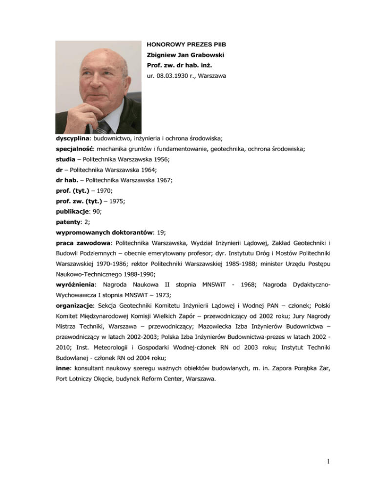 HONOROWY PREZES PIIB Zbigniew Jan Grabowski Prof. zw. dr hab. inż. ur. 08.03.1930 r., Warszawa dyscyplina: budownictwo, inżynieria i ochrona środowiska; specjalność: mechanika gruntów i fundamentowanie, geotechnika, ochrona środowiska; studia – Politechnika Warszawska 1956; dr – Politechnika Warszawska 1964; dr hab. – Politechnika Warszawska 1967; prof. (tyt.) – 1970; prof. zw. (tyt.) – 1975; publikacje: 90; patenty: 2; wypromowanych doktorantów: 19; praca zawodowa: Politechnika Warszawska, Wydział Inżynierii Lądowej, Zakład Geotechniki i Budowli Podziemnych – obecnie emerytowany profesor; dyr. Instytutu Dróg i Mostów Politechniki Warszawskiej 1970-1986; rektor Politechniki Warszawskiej 1985-1988; minister Urzędu Postępu Naukowo-Technicznego 1988-1990; wyróżnienia: Nagroda Naukowa II stopnia MNSWiT - 1968; Nagroda Dydaktyczno- Wychowawcza I stopnia MNSWiT – 1973; organizacje: Sekcja Geotechniki Komitetu Inżynierii Lądowej i Wodnej PAN – członek; Polski Komitet Międzynarodowej Komisji Wielkich Zapór – przewodniczący od 2002 roku; Jury Nagrody Mistrza Techniki, Warszawa – przewodniczący; Mazowiecka Izba Inżynierów Budownictwa – przewodniczący w latach 2002-2003; Polska Izba Inżynierów Budownictwa-prezes w latach 2002 2010; Inst. Meteorologii i Gospodarki Wodnej-członek RN od 2003 roku; Instytut Techniki Budowlanej - członek RN od 2004 roku; inne: konsultant naukowy szeregu ważnych obiektów budowlanych, m. in. Zapora Porąbka Żar, Port Lotniczy Okęcie, budynek Reform Center, Warszawa. 1