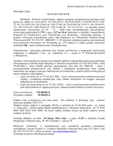 Brześć Kujawski, 25 stycznia 2016 r. BM 6840.5.2016 OGŁOSZENIE Burmistrz Brześcia Kujawskiego ogłasza szesnasty nieograniczony przetarg ustny (pierwszy odbył się 15-03-2013r. II-17-05-2013r., III-19-07-2013r. VI-24-09-2013r. V-0312-13r. VI-18-02-14r. VII-25-04-14r. VIII-27-06-14r. IX-02-09-14r. X-07-11-14r. XI-09-0115r. XII-12-03-15r. XIII-19-06-15r. XIV-31-08-15r. XV-18-12-15r.) na sprzedaż prawa użytkowania wieczystego do 05 – 12 – 2089 roku niezabudowanej nieruchomości oznaczonej geodezyjnie nr 27/9 o pow. 3,27 ha 10 m2 położonej w obrębie 1 miasta Brześć Kujawski ul. Przemysłowa, pow. Włocławski, woj. Kujawsko – Pomorskie opisanej w księdze wieczystej prowadzonej przez Sąd Rejonowy we Włocławku Wydział Ksiąg Wieczystych KW Nr WL1W / 00084492 / 2. W rejestrze ewidencji gruntów prowadzonym przez Starostwo Powiatowe we Włocławku dz. 27/9 stanowi w całości grunty oznaczone symbolem Bp – teren zurbanizowany niezabudowany. Nieruchomość korzystnie położona przy drodze powiatowej o urządzonej nawierzchni asfaltowej, w odległości 7 km od autostrady A-1 – węzeł nr 15 Włocławek-Zachód w Pikutkowie. Zgodnie z obowiązującym miejscowym planem ogólnym zagospodarowania przestrzennego zatwierdzonym uchwałą Rady Miejskiej w Brześciu Kujawskim Nr XXVIII/179/05 z dnia 19-08-2005 r. teren działki głównie przeznaczony jest pod B-3 PBS-ZP – teren z przeznaczeniem podstawowym pod obiekty i urządzenia produkcyjne, bazy, składy materiałów nie mogące znacząco oddziaływać na środowisko z pasem zieleni izolacyjnej od strony zabudowy mieszkalnej, – część od strony dz. nr 27/10: B-2 PBS – teren z przeznaczeniem podstawowym pod obiekty i urządzenia produkcyjne, bazy, składy materiałów nie mogące znacząco oddziaływać na środowisko, – część od strony drogi dz. nr 37: B-1 ZP/Kx – teren z przeznaczeniem podstawowym pod zieleń parkową z ciągiem pieszym z dopuszczeniem budowy ścieżki rowerowej. Cena wywoławcza : Wysokość wadium : 310 000,00 zł 30 000,00 zł Podana cena wywoławcza jest ceną netto. Do ustalonej w przetargu ceny zostanie doliczony podatek VAT 23 %. Wadium należy wpłacić w pieniądzu (PLN) w terminie do 23-02-2016 roku na konto w Kujawsko – Dobrzyńskim Banku Spółdzielczym w Brześciu Kujawskim Nr 78 9550 0003 2003 0022 6341 0005. Za dzień wpłaty wadium uważa się dzień wpływu kwoty wadium na konto. Przetarg odbędzie się dnia 26 lutego 2016 roku o godz. 11.30 w siedzibie Urzędu Miejskiego w Brześciu Kuj. Pl. Wł. Łokietka 1, sala nr 14. Bliższych informacji o nieruchomości oraz warunkach sprzedaży i procedurze przetargowej można uzyskać w Urzędzie Miejskim w Brześciu Kuj. pok. Nr 5 lub 8 oraz tel. (54)-231-63-10 a także na stronie www.brzesckujawski.pl . Zastrzega się prawo odwołania przetargu. REGULAMIN PRZETARGU USTNEGO NIEOGRANICZONEGO NA SPRZEDAŻ PRAWA UŻYTKOWANIA WIECZYSTEGO NIERUCHOMOŚCI NIEZABUDOWANEJ W BRZEŚCIU KUJ. o.1 DZIAŁKA Nr 27/9 1. Przetarg odbywa się w formie ustnej. 2. W przetargu mogą brać udział osoby, które wpłacą wadium w pieniądzu (PLN) w terminie do dnia 23-02-2016 r. w wysokości 30 000,00 zł na konto w Kujawsko –Dobrzyńskim Banku Spółdzielczym w Brześciu Kujawskim Nr 78 9550 0003 2003 0022 6341 0005. Dowód wpłaty wadium winien wskazywać jednoznacznie, kto wpłacił wadium i tym samym uprawniony jest do udziału w przetargu (np. małżonkowie). Za dzień wpłaty wadium uważa się dzień wpływu kwoty wadium na konto. Dowód wniesienia wadium podlega przedłożeniu komisji przetargowej przed otwarciem przetargu. 3. Uczestnicy biorą udział w przetargu osobiście lub przez pełnomocnika. Pełnomocnictwo wymaga formy pisemnej. Małżonkowie biorą udział w przetargu osobiście lub okazując pełnomocnictwo współmałżonka. 4. Postąpienie nie może wynosić mniej niż 1 % ceny wywoławczej z zaokrągleniem w górę do pełnych dziesiątek złotych tj.3 100,00 zł 5. Przetarg wygrywa osoba, której zaoferowana cena po trzykrotnym wywołaniu nie została przebita. Do ustalonej w przetargu ceny zostanie doliczony podatek VAT 23 %. 6. Wadium wpłacone przez uczestnika, który wygrał przetarg zalicza się na poczet ceny nabycia nieruchomości, natomiast pozostałym uczestnikom zwraca się niezwłocznie po zakończeniu przetargu, jednak nie później niż przed upływem 3 dni od dnia zamknięcia lub odwołania przetargu. 7. Wadium ulega przepadkowi w razie uchylenia się uczestnika, który wygrał przetarg od zawarcia umowy. 8. Nabywca nieruchomości będzie zobowiązany wnosić opłatę roczną na konto Starostwa Powiatowego we Włocławku (w roku 2015 opłata roczna w wysokości 2 506,22 zł). Opłatę roczną wnosi się przez cały okres użytkowania wieczystego w terminie do 31 marca każdego roku, z góry za dany rok. Wysokość opłaty rocznej z tytułu użytkowania wieczystego nieruchomości może być aktualizowana nie częściej niż raz w roku. 9. Termin uiszczenia ceny sprzedaży pomniejszonej o wpłacone wadium upływa w ciągu 21 dni od dnia przeprowadzonego przetargu na konto w Kujawsko– Dobrzyńskim Banku Spółdzielczym w Brześciu Kujawskim Nr 62 9550 0003 2003 0022 6341 0002. 10. Nieruchomość zbywana jest wg. danych ewidencyjnych i w razie potrzeby wznowienia granic obowiązek ten spoczywa na nabywcy. 11. W/w nieruchomość jest przedmiotem dzierżawy na czas określony do dnia 30-09-2016 r. W związku z tym jej wydanie nastąpi po upływie dzierżawy, jednak nie później niż do dnia 01-10-2016 r. 12. Nabywca wyznacza Kancelarię Notarialną oraz ponosi koszty Aktu Notarialnego. 13. Zastrzega się prawo odwołania przetargu. Zatwierdził Burmistrz Brześcia Kujawskiego