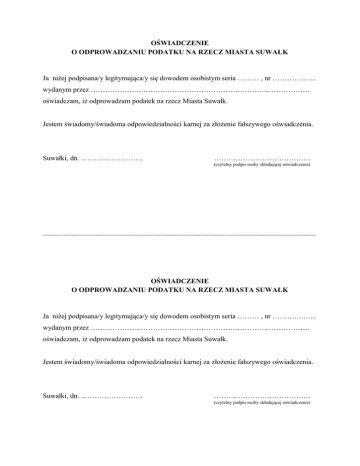 OŚWIADCZENIE O ODPROWADZANIU PODATKU NA RZECZ MIASTA SUWAŁK Ja niżej podpisana/y legitymująca/y się dowodem osobistym seria ……… , nr ………….…... wydanym przez ……………….……………………………………………………………… oświadczam, iż odprowadzam podatek na rzecz Miasta Suwałk. Jestem świadomy/świadoma odpowiedzialności karnej za złożenie fałszywego oświadczenia. Suwałki, dn. ..…………………… …………………………………. (czytelny podpis osoby składającej oświadczenie) -------------------------------------------------------------------------------------------------------------------------------------------------------------------------- OŚWIADCZENIE O ODPROWADZANIU PODATKU NA RZECZ MIASTA SUWAŁK Ja niżej podpisana/y legitymująca/y się dowodem osobistym seria ……… , nr ………….…... wydanym przez ……………….……………………………………………………………… oświadczam, iż odprowadzam podatek na rzecz Miasta Suwałk. Jestem świadomy/świadoma odpowiedzialności karnej za złożenie fałszywego oświadczenia. Suwałki, dn. ..…………………… …………………………………. (czytelny podpis osoby składającej oświadczenie)