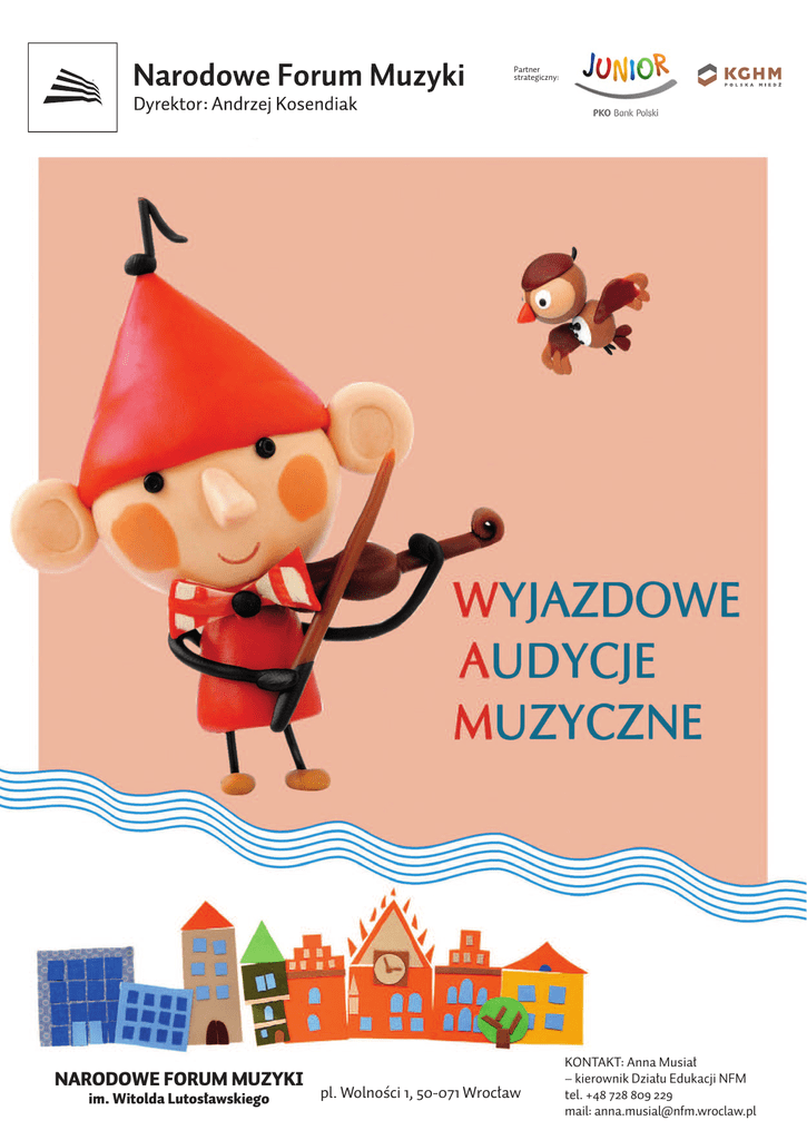 Partner strategiczny: W SEZONIE ARTYSTYCZNYM 2011/2012 NARODOWE FORUM MUZYKI im. Witolda Lutosławskiego pl. Wolności 1, 50-071 Wrocław KONTAKT: Anna Musiał – kierownik Działu Edukacji NFM tel. +48 728 809 229 mail: [email protected] Wrzesień „Rymowanki, wierszowanki – spotkanie z poezją” wykonawcy, instrument: aktor, akordeon, klarnet To koncert, podczas którego pragniemy przybliżyć dzieciom wiersze napisane z myślą o najmłodszych słuchaczach. Utwory znanych i cenionych poetów: J. Tuwima i J. Brzechwy zabiorą słuchaczy w krainę fantazji i wyobraźni. Ich wiersze są szczególnie lubiane przez dzieci, ale chcielibyśmy zaprezentować dzieciom także twórczość innych autorów, których poezja bawi, uczy i odkrywa piękno otaczającego świata. Podczas koncertu nie zabraknie oczywiście muzyki. Znakomity duet – akordeon i klarnet – podkreśli charakter i nastrój prezentowanych wierszy. Zapraszamy dzieci do wspólnej słowno-muzycznej zabawy, pełnej niezwykłych wydarzeń i humoru! Październik „Opowieść o harfie haczykowej” instrumenty: harfa haczykowa, skrzypce, wiolonczela Podczas październikowego koncertu dzięki naszej wyobraźni przeniesiemy się do Irlandii i Wielkiej Brytanii. Kraje te charakteryzują się bogatą historią i tradycją. Tam znalazła swój dom i zdobyła ogromną popularność harfa haczykowa, której dzieje poznamy podczas spotkania. Dowiemy się, jak powstał pomysł, by ją tak nazwać, a także jak daleko sięga jej tradycja. Będziemy odkrywać tajemnice tego instrumentu i poznawać jego walory brzmieniowe. Przyjrzymy się także z bliska budowie harfy i spróbujemy stwierdzić, co przypomina swym kształtem. Listopad „Muzyka bliska memu sercu” instrumenty: pianino elektryczne, skrzypce, altówka, wiolonczela Listopad to miesiąc, w którym nasze myśli szczególnie krążą wokół tego, co polskie. Początek XX wieku kojarzy nam się z odzyskaniem upragnionej wolności, dlatego chcielibyśmy rozpocząć naszą muzyczną wędrówkę od początków minionego stulecia. „Muzyka bliska memu sercu” to koncert poświęcony polskim kompozytorom XX wieku. To czas, kiedy w Warszawie powstała pierwsza polska filharmonia, w której rozbrzmiewała muzyka rodzimych kompozytorów. To także czas, kiedy w kraju rodzi się kino, które po trudach I wojny dostarcza ludziom upragnionej rozrywki. Pojawiają się pierwsze gwiazdy ekranu, które śpiewają piosenki do dziś chętnie słuchane przez wszystkie pokolenia. Nasza muzyczna podróż nie zakończy się jedynie na czasach międzywojennych. Ze względu na wspaniały dorobek polskich kompozytorów m.in. w muzyce filmowej podczas koncertu nie może też zabraknąć pięknej muzyki Wojciecha Kilara. Poprzez ten koncert pragniemy rozbudzać w sercach młodych słuchaczy szacunek oraz sympatię do tego, co stanowi część polskiej kultury. Grudzień „Baletowe pas de deux” wykonawcy, instrumenty: para taneczna Wrocławskiej Akademii Baletu, flet, wiolonczela, pianino elektryczne Najpiękniejszy utwór, który mógłby się pojawić w programie grudniowego koncertu, to balet Piotra Czajkowskiego Dziadek do orzechów. Muzyka ta doskonale oddaje nastrój zbliżających się świąt. A gdy dodamy do niej taniec klasyczny, to spotkanie to z pewnością spodoba się wszystkim młodym słuchaczom. Koncert będzie rodzajem przewodnika po historii baletu. Mali melomani poznają ćwiczenia, jakie wykonują tancerze rozgrzewający się przed wyjściem na scenę, dowiedzą się, jakie nosi się kostiumy i kiedy wkłada baletki, a kiedy puenty. Wreszcie będą podziwiać parę tancerzy w klasycznym pokazie pas de deux, czyli popisie pierwszego najważniejszego w balecie tancerza i primabaleriny. Ten taniec będzie kulminacją naszego świątecznego koncertu. Styczeń „Na królewskim balu” wykonawcy, instrumenty: para taneczna Baletu Dworskiego „Cracovia Danza”, pianino elektryczne, flet, instrumenty perkusyjne Jak co roku na koncercie styczniowym nie może zabraknąć tańca, który uwrażliwia dzieci na ruch, technikę taneczną i precyzję wykonawczą. Tym razem zabierzemy młodych słuchaczy w XVI wiek, by zobaczyć, jak wówczas bawiono się na królewskim balu. Młodzi słuchacze będą mieli okazję obserwować autentyczne dworskie tańce renesansowe, których kroki i figury zostały dokładnie zapisane w pierwszych drukowanych podręcznikach tanecznych z XVI wieku. Ówczesne tańce były bardzo zróżnicowane, od powolnych i statycznych, po żwawe i skoczne. Niektóre tańczono w parach, a inne w większym gronie – w linii lub w okręgu. Podczas koncertu pojawi się także postać Stańczyka, nadwornego błazna, który z pewnością wprowadzi odrobinę humoru do naszego spotkania. Gościć będziemy tancerzy z Baletu Dworskiego „Cracovia Danza” jedynego w Polsce profesjonalnego zespołu tańców historycznych. Luty „Moc musicalowych piosenek” głosy wokalne, instrumenty: mezzosopran, tenor, wiolonczela, pianino elektryczne, instrumenty perkusyjne Przepiękne piosenki z filmu Kraina lodu, tak dobrze znane wszystkim dzieciom, stały się inspiracją, by przedstawić małym melomanom temat związany z jednym z gatunków filmowych – musicalem. Na koncercie omówimy poszczególne muzyczne elementy tego popularnego gatunku, czyli: piosenki solowe, duety, dialogi mówione, muzykę i taniec. Podczas lekcji prześledzimy dynamiczny rozwój musicalu od jego początków do czasów dzisiejszych. Opierając się na najciekawszych przykładach, przedstawimy dzieciom muzykę pochodzącą zarówno z filmów, jak i bajek, prezentując musicalowy humor, nastroje, charaktery oraz sercowe perypetie bohaterów. Marzec „Pojechali chłopcy” wykonawcy, instrumenty: para taneczna Akademickiego Zespołu Pieśni i Tańca Jedliniok, wakat, akordeon, skrzypce Marzec to czas, kiedy odczuwalne jest już bliskie nadejście wiosny. Dlatego postanowiliśmy zaprosić dzieci na koncert pełen 