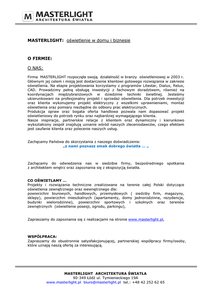 MASTERLIGHT: oświetlenie w domu i biznesie O FIRMIE: O NAS: Firma MASTERLIGHT rozpoczęła swoją działalność w branży oświetleniowej w 2003 r. r Głównym jej celem i misją jest dostarczenie klientowi gotowego rozwiązania w zakresie oświetlenia. Na etapie projektowania korzystamy z programów Litestar, Dialux, Relux, CAD. Prowadzimy pełną obsługę inwestycji z fachowym doradztwem, również na koordynacjach międzybranżowych anżowych w dziedzinie techniki świetlnej. Jesteśmy ukierunkowani na profesjonalny projekt i sprzedaż oświetlenia. Dla potrzeb inwestycji oraz klienta wykonujemy projekt elektryczny z wszelkimi uprawnieniami, montaż oświetlenia oraz pomiary niezbędne do odbioru odb prac elektrycznych. Produkcja opraw oraz bogata oferta handlowa pozwala nam dopasować projekt oświetleniowy do potrzeb rynku oraz najbardziej wymagającego klienta. Nasze inspiracje, partnerskie artnerskie relacje z klientem oraz dynamiczny i kierunkowo wykształcony zespół znajdują uznanie wśród naszych zleceniodawców, czego efektem jest zaufanie klienta oraz polecenie naszych usług. Zachęcamy Państwa do skorzystania z naszego doświadczenia: „z z nami poznasz smak dobrego światła … „ Zachęcamy do odwiedzenia wiedzenia nas w siedzibie firmy, bezpośredniego ezpośredniego z architektem wnętrz oraz zapoznania się z ekspozycją światła. spotkania CO OŚWIETLAMY … Projekty i rozwiązania techniczne zrealizowane na terenie całej Polski dotyczące oświetlenia zewnętrznego oraz wewnętrznego dla: dl powierzchni ierzchni biurowych, handlowych, przemysłowych ( siedziby firm, magazyny, sklepy), powierzchni mieszkalnych (apartamenty, domy jednorodzinne, rezydencje, budynki wielorodzinne), powierzchni sportowych i szkolnych oraz terenów zewnętrznych (oświetlenie oświetlenie posesji, ogrodu, parkingu), Zapraszamy do zapoznania się z realizacjami na stronie www.masterlight.pl, www.masterlight.pl WSPÓŁPRACA: Zapraszamy do obustronnie satysfakcjonującej, satysfakcjonującej, partnerskiej współpracy firmy/osoby, które uznają naszą ofertę za interesującą. MASTERLIGHT ARCHITEKTURA ŚWIATŁA 90 90-349 Łódź ul. Tymienieckiego 19A www.masterlight.pl [email protected] tel.: +48 42 252 62 65 OFERTA: PROJEKTOWANIE OŚWIETLENIA KONCEPCJA CEPCJA OŚWIETLENIA: Przygotowujemy koncepcję oświetlenia oraz wizualizację wraz z kalkulacją kosztów. Cechuje nas twórcze podejście do projektowania oświetlenia z wykorzystaniem najnowszych technologii, zastosowanie inteligentnego sterowania i zarządzania zarządz systemami oświetleniowymi. Sporządzamy kosztorys uwzględniając: projekt elektryczny i oświetleniowy, oświetleniowy oprawy oświetleniowe i źródła światła wraz z niezbędnym osprzętem elektrycznym, montaż opraw oświetleniowych wietleniowych oraz pomiary oświetleniowe i elektryczne. Przygotowujemy porównywanie kosztów zużycia energii dla oświetlenia, co pozwala klientowi wybrać najbardziej iej optymalne rozwiązanie. Oferujemy techniczną pomoc w konsultacjach projektów z branżystami, Inwestorami Inwest oraz Klientami końcowymi, również podczas koordynacji międzybranżowych. PROJEKT OŚWIETLENIA Z PRZELICZENIEM NATĘŻENIA ŚWIATŁ ŚWIA ŁA: Do każdego projektu dołączamy karty katalogowe użytych opraw oświetleniowych, deklaracje zgodności/certyfikaty CE oraz przeliczenia natężenia oświetlenia. PROJEKT ELEKTRYCZNY:: Wykonujemy projekt elektryczny z wszystkimi niezbędnymi uzgodnieniami POMIARY NATĘŻENIA OŚWIETLENIOWA: OŚWIETLENIOWA Wykonujemy pomiary natężenia oświetlenia techniczną. wraz z niezbędną dokumentacją SPRZEDAŻ OŚWIETLENIA PRZYGOTOWANIE KOMPLETNEJ OFERTY NA PRODUKTY OŚWIETLENIOWE: OŚWIETLENIOWE Naszym celem jest sprzedaż produktów oświetleniowych wraz z niezbędnymi akcesoriami potrzebnymi do uruchomienia systemu. systemu W naszej ofercie znajdziecie Państwo: oprawy prawy oświetleniowe, źródła światła, LED, systemy sterowania, osprzęt oświetleniowy. oświetleniowy Pełna baza producentów na stronie www.masterlight.pl w zakładce: Produkty Bezpośrednia współpraca z producentami opraw oświetleniowych w Polsce jak i za granicą powoduje, iż gama oferowanych produktów jest niezwykle bogata i może być idealnie dopasowana do Państwa potrzeb. potrzeb Wykonujemy y również oświetlenie „ pod wymiar” z aluminium, Barrisol sol, PCV, szkło, itp. – MANUFAKTURA ŚWIATŁA. ŚWIATŁA Niestandardowe wymiary oraz niespotykane kształty wykonujemy według wizji architekta lub życzenia klienta. Elastyczność we współpracy, profesjonalna pomoc na każdym etapie inwestycji wynika z umiejętności zrozumienia przez nas potrzeb klienta - słuchamy klienta. MASTERLIGHT ARCHITEKTURA ŚWIATŁA 90 90-349 Łódź ul. Tymienieckiego 19A www.masterlight.pl [email protected] tel.: +48 42 252 62 65 MONTAŻ I SERWIS OŚWIETLENIA ONTAŻ OPRAW OŚWIETLENIOWYCH ORAZ WYMAGANEGO WYKONUJEMY MONTAŻ OKABLOWANIA. Posiadamy wykwalifikowany personel z wszelkimi uprawnieniami SEP :dozór, eksploatacja oraz pomiary. Niezbędne Niezbędne doświadczenie przy montażu oświetlenia, na wszelkich powierzchniach komercyjnych i prywatnych oraz użyteczności publicznej. Współpraca aca z godnymi zaufania i rzetelnymi wykonawcami elektrycznymi pozwala nam obsłużyć każdą inwestycję. ŚWIADCZYMY SERWIS GWARANCYJNY ORAZ POGWARANCYJNY: UTRZYMANIE OŚWIETLENIA W RUCHU – WYMIANA ŹRÓDEŁ ŚWIATŁA ORAZ OSPRZĘTU ELEKTRYCZNEGO. Zajmujemy się również serwisem sprzętu oświetleniowego:: naprawa i konserwacja opraw, aw, okresowe przeglądy, wymiana źródeł światła, osprzętu elektrycznego. elektrycznego Usługi głównie świadczymy w woj. łódzkim i mazowieckim, aczkolwiek mamy w swoim portfolio realizacje na terenie całej całe Polski. Na wykonywane prace posiadamy wymagane ubezpieczenie OC. PRODUKTY BAZA OPRAW OŚWIETLENIOWYCH WŁASNEJ PRODUKCJI ORAZ SZEROKA OFERTA HANDLOWA OŚWIETLENIA TECHNICZNEGO I DEK