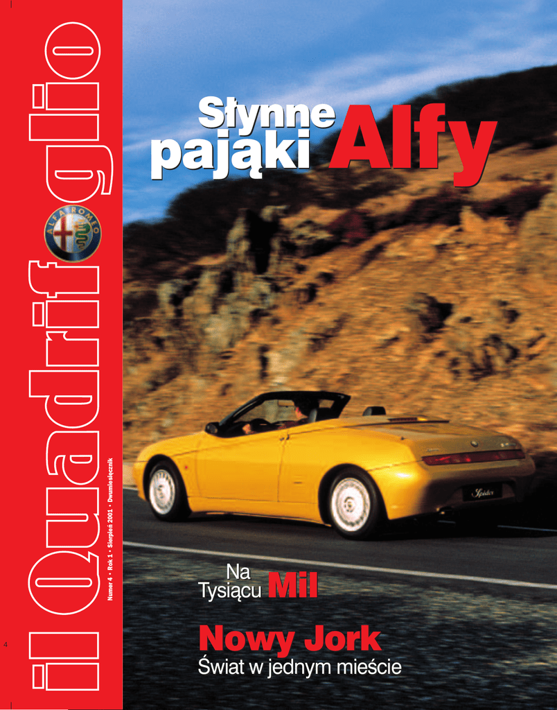 S∏ynne Numer 4 • Rok 1 • Sierpień 2001 • Dwumiesięcznik pajàki 4 Alfy Na Tysiàcu Mil Nowy Jork Âwiat w jednym mieÊcie www.alfaromeo.com.pl Elegancka. Ekonomiczna. Ekstrawagancka. W ka˝dym wydaniu sportowa. Alfa 156 WolnoÊç wyboru. 2 wersje nadwozia – sedan lub Sportwagon. 4 silniki benzynowe oraz 2 turbodiesle JTD. 4 skrzynie biegów. 13 kolorów lakieru, 12 odcieni tapicerki. Distinctive – nowe, wyjàtkowo bogate wyposa˝enie standardowe. 3 Pakiety Sportowe. 254 akcesoria z serii Alfa Linea. ☎ 0-801 117 117 pismo mi∏oÊników Alfa Romeo OD REDAKCJI Ulubiony przez nas wszystkich okres letnich wakacji nieuchronnie zbli˝a si´ do koƒca. Wypocz´ci, z baga˝em goràcych wspomnieƒ, wracamy do naszych codziennych zaj´ç. Byç mo˝e wÊród miejsc, do których trafili Paƒstwo podczas wakacyjnych w´drówek by∏ te˝ Nowy Jork. JeÊli nie, warto przeczytaç reporta˝ z tej najbarwniejszej amerykaƒskiej metropolii. Za rok przecie˝ tak˝e b´dà wakacje. Mi∏oÊnikom samochodowych podró˝y po W∏oszech polecamy natomiast w´drówk´ trasà od Sieny do Rzymu, fascynujàcà o ka˝dej porze roku. Dla firm motoryzacyjnych prze∏om lata i jesieni jest porà, w której pojawiajà si´ nowe modele, podejmowane sà nowe inicjatywy, opracowywane strategie na przysz∏y rok. Alfa Romeo to silna, ekskluzywna marka, która przoduje w poszukiwaniu najefektywniejszych metod usatysfakcjonowania klientów. W walce o ich zdobycie i utrzymanie, zwyci´stwo zale˝y dziÊ przede wszystkim od wysokiego poziom obs∏ugi. Nabywcy Alfy majà bardzo du˝e oczekiwania, dotyczàce zarówno produktu jak i jego serwisu. W tym roku znacznie zwi´kszy si´ sieç salonów sprzeda˝y i serwisów Alfa Romeo w Polsce. Jednak nie liczba punktów obs∏ugi, lecz ich jakoÊç jest najwa˝niejsza. Dlatego k∏adziemy szczególny nacisk na szkolenie pracowników. Profesjonalizm jest bowiem kluczem do umocnienia wi´zi ∏àczàcych mark´ z klientami. Sukces rynkowy Alfy 156 i 147 da∏ impuls umo˝liwiajàcy umocnienie przez mark´ statusu samochodu ekskluzywnego i dynamicznego, kojarzonego nie tylko z pi´knymi i doskona∏ymi pojazdami, ale równie˝ z pewnym stylem ˝ycia. Stylowi temu przed laty najpe∏niej dawa∏ wyraz legendarny model Alfa Romeo Spider. Tak˝e dziÊ Spider oraz model GTV wyznaczajà trendy nie tylko motoryzacyjnej mody. Czytelnikom zainteresowanym historià i koneksjami polsko-w∏oskimi proponujemy artyku∏ o królowej Bonie. Znajdà w nim równie˝ odpowiedê na pytanie, co Bon´ ∏àczy z Alfa Romeo. ˚ycz´ przyjemnej lektury Sprostaç wymaganiom rynku Maciej A. Brzozowski Redaktor Naczelny prenumerata 2001 6 numerów 70 zł edycja polska dwumiesi´cznik ➤ Cena rocznej prenumeraty w Polsce: 70 z∏otych ➤ Prenumerat´ mo˝na zamówiç od pierwszego dost´pnego numeru i rozpoczàç jà w dowolnym miesiàcu. Prenumerata obejmuje 6 OBS¸UGA PRENUMERATY kolejnych numerów 033 813 27 61 SPOSÓB P¸ATNOÂCI OBS¸UGA PRENUMERATY Op∏aty mo˝na dokonaç na poczcie lub w banku na rachunek BPH II O/Bielsko-Bia∏a 10601103-320000066298 z dopiskiem „prenumerata il Quadrifoglio”. SATIZ POLAND Sp. z o.o. Tel. 033 813 27 61 Fax. 033 813 41 76 E-mail: [email protected] Dane osobowe prenumeratorów oraz czytelników, którzy napisali do redakcji il Quadrifoglio sà gromadzone, przetwarzane, wykorzystywane oraz przekazywane dostawcom us∏ug informatycznych, e-mailingowych lub rachunkowoÊci wy∏àcznie w celu realizacji zamówieƒ czytelników. Dane sà przechowywane w siedzibie Satiz Poland Sp. z o.o., ul. 11 Listopada 60/62, 43-300 Bielsko Bia∏a. Wszystkie operacje przetwarzania danych osobowych w celach marketingowych wykonywane sà zgodnie z ustawà z dn. 29.08.1997 r. o ochronie danych osobowych (Dz. U. nr 133, poz. 883) E-mail: [email protected] Czynne w dniach i godzinach: poniedzia∏ek – piàtek 8.00 - 13.00 14.00 - 16.30 SATIZ W NUMERZE WYDARZENIA il Quadrifoglio nr 4 Sierpieƒ 2001 WYDAWCA Satiz Poland ul. 11 Listopada 60/62 43-300 Bielsko-Bia∏a Tel. 033 813 27 61 Fax 033 813 41 76 PREZES Jas Gawroƒski PE¸NOMOCNIK Filippo Gallino REDAKCJA 02-649 Warszawa ul. Pu∏ku Baszta 1/16 Tel./fax 022 844 41 42 e-mail: [email protected] REDAKTOR NACZELNY Maciej A. Brzozowski ZAST¢PCA REDAKTORA NACZELNEGO Francesco Novo STAWIAMY CZO¸A KONKURENCJI ALFA NA OKRUHU 8 12 14 AGATA KONARSKA – ˚YJ¢ W ZGODZIE ZE SOBÑ 18 NAJPI¢KNIEJSZE „PAJÑKI” ALFY 22 NOWY JORK – CA¸Y ÂWIAT W JEDNYM MIEÂCIE 26 NA LEGENDARNEJ MILLE MIGLIA 34 SPORT KA˚DEGO DNIA MA¸E SEKRETY WIELKICH KIEROWCÓW W DRODZE DO RZYMU REDAKTOR PROWADZÑCY Jerzy Kozierkiewicz W¸OSZKA NA POLSKIM TRONIE ZESPÓ¸ Anna Borsukiewicz Dariusz Balcerzyk W MUZEACH OPRACOWANIE GRAFICZNE Dejan Gospodarek PRENUMERATA Tel. 033 813 27 61 Fax 033 813 41 76 REKLAMA 0-33 813 52 55 DRUK Dimograf ul. Legionów 83 43-300 Bielsko-Bia∏a 4 40 46 WIRTUALNE MUZEUM 50 54 56 58 SALONY ALFY ROMEO w Polsce 60 ROZMAITOÂCI KLUBY ALFY ROMEO na Êwiecie WROC¸AWIANIE Z MIA GIULIA 62 64 il Quadrifoglio 3 WYDARZENIA Motoryzacyjna wyprawa poznaƒskich alfistów Mi∏oÊnicy Alfa Romeo zrzeszeni w poznaƒskim klubie Alfisti odbyli motoryzacyjnà wycieczk´ do W∏och. Zacz´li jà od Mediolanu. Odwiedzili Centro Stile Alfa Romeo oraz muzeum Alfa Romeo w Arese. Równie˝ w Turynie pierwszym noÊcià spodoba si´ i paniom. 5 paêdziernika rozpocznà si´ manewry alfistów, prowadzone pod kierownictwem kadry Centrum Szkolenia Wojsk Làdowych im. Stefana Czarnieckiego w Poznaniu. Impreza, organizowana przez Klub Alfa Romeo Poznaƒ, zapowiada si´ bardzo atrakcyjnie. W jej o imprezie udzielajà: Anna Dudziak – tel. 0-61 821 66 61 oraz Ryszard Dudziak – tel. 0-604 644 590. Alfa 166 dla prezesa Targów Claudio Di Stefano, odpowiedzialny za Dyrekcj´ Sprzeda˝y Alfy Romeo na rynek w∏oski (po lewej) wr´czy∏ Alf´ 166 3.0 z automatycznà skrzynià biegów panu Luigi Roth, prezesowi Targów Mediolaƒskich. Targi te, przy prawie 4 i p