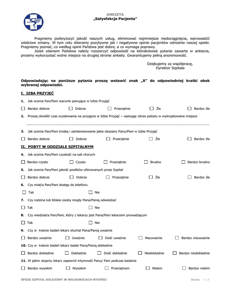ANKIETA „Satysfakcja Pacjenta” Pragniemy podwyższyć jakość naszych usług, eliminować najmniejsze niedociągnięcia, wprowadzić właściwe zmiany. W tym celu zbieramy pozytywne jak i negatywne opinie pacjentów odnośnie naszej opieki. Pragniemy poznać, co według opinii Państwa jest dobre, a co wymaga poprawy. Jeżeli zdaniem Państwa należy rozszerzyć odpowiedź na którekolwiek pytanie zawarte w ankiecie, prosimy wykorzystać wolne miejsce na drugiej stronie ankiety. Gwarantujemy pełną anonimowość. Dziękujemy za współpracę, Dyrektor Szpitala Odpowiadając na poniższe pytania proszę wstawić znak „X” do odpowiedniej kratki obok wybranej odpowiedzi. I. IZBA PRZYJĘĆ 1. Jak ocenia Pan/Pani warunki panujące w Izbie Przyjęć Bardzo dobrze 2. Dobrze Przeciętnie Źle Bardzo źle Proszę określić czas oczekiwania na przyjęcie w Izbie Przyjęć – wpisując okres pobytu w wykropkowane miejsce ................................................................................................................................................................................ 3. Jak ocenia Pan/Pani troskę i zainteresowanie jakie okazano Panu/Pani w Izbie Przyjęć Bardzo dobrze Dobrze Przeciętnie Źle Bardzo źle II. POBYT W ODDZIALE SZPITALNYM 4. Jak ocenia Pan/Pani czystość na sali chorych Bardzo czysto 5. Dobrze Przeciętnie Źle Bardzo źle Czy rodzina lub bliskie osoby mogły Pana/Panią odwiedzać Nie Czy wiedział/a Pan/Pani, który z lekarzy jest Pana/Pani lekarzem prowadzącym Tak 9. Bardzo brudno Nie Tak 8. Brudno Czy miał/a Pan/Pani dostęp do telefonu Tak 7. Przeciętnie Jak ocenia Pan/Pani jakość posiłków oferowanych przez Szpital Bardzo dobrze 6. Czysto Nie Czy w trakcie badań lekarz słuchał Pana/Panią uważnie Bardzo uważnie Uważnie Dość uważnie Nieuważnie Bardzo nieuważnie 10. Czy w trakcie badań lekarz badał Pana/Panią dokładnie Bardzo dokładnie Dokładnie Dość dokładnie Niedokładnie Bardzo niedokładnie 11. W jakim stopniu lekarz zapewnił intymność Panu/ Pani podczas badania Bardzo wysokim Wysokim SPZOZ SZPITAL KOLEJOWY W WILKOWICACH-BYSTREJ Przeciętnym Niskim Bardzo niskim Strona 1z3 ANKIETA „Satysfakcja Pacjenta” 12. Czy lekarz był życzliwy Bardzo życzliwy Życzliwy Raczej życzliwy Nieżyczliwy Bardzo nieżyczliwy 13. W jakim stopniu lekarz potrafił wczuć się w Pana/Pani sytuację Bardzo wysokim Wysokim Przeciętnym Niskim Bardzo niskim Niedostępny Zupełnie niedostępny 14. Czy lekarz był dostępny, gdy Pan/Pani go potrzebował/a Zawsze dostępny Dostępny Zazwyczaj dostępny 15. Czy lekarz wyjaśnił Panu/Pani metody leczenia Tak Nie 16. Jeśli uzyskał Pan/Pani informacje na temat metod leczenia, to czy były one dokładne Bardzo dokładne Dokładne Dość dokładne Niedokładne Bardzo niedokładne 17. Proszę ocenić życzliwość pielęgniarek Bardzo życzliwe Życzliwe Dość życzliwe Nieżyczliwe Bardzo nieżyczliwe 18. Czy takie zabiegi jak wykonywanie zastrzyków, pobieranie krwi, podłączanie kroplówek, pielęgniarki wykonywały profesjonalnie, sprawnie Bardzo sprawnie Sprawnie Dość sprawnie Nieporadnie Bardzo nieporadnie 19. Jak ocenia Pan/Pani dostępność pielęgniarki (tzn.: czy w momencie, gdy była potrzebna pielęgniarka była osiągalna) Zawsze dostępna Dostępna Zazwyczaj dostępna Niedostępna Zupełnie niedostępna 20. W jakim stopniu pielęgniarki zapewniały Panu/Pani intymność podczas zabiegów pielęgnacyjnych Bardzo wysokim Wysokim Przeciętnym Niskim Bardzo niskim 21. Czy w trakcie hospitalizacji miał/a Pan/Pani kontakt z Gabinetem Rehabilitacji (fizykoterapia, hydroterapia, sala gimnastyczna) Tak Nie 22. W jakim stopniu uważa Pan/ Pani za istotne korzystanie z rehabilitacji w swoim stanie zdrowia Bardzo wysokim Wysokim Przeciętnym Niskim Bardzo niskim Nisko Bardzo nisko 23. Jak ocenia Pan/Pani usługi świadczone przez personel Gabinetu Rehabilitacji Bardzo wysoko Wysoko Przeciętnie 24. Proszę ocenić uprzejmość salowych Bardzo uprzejma Uprzejma Raczej uprzejma Nieuprzejma Bardzo nieuprzejma 25. Czy miał/a Pan/Pani poczucie ważności, istotności swojej osoby w trakcie pobytu w szpitalu Tak Nie Trudno powiedzieć 26. Czy w sytuacjach trudnych uzyskał/a Pan/Pani wsparcie psychiczne Tak Nie Trudno powiedzieć 27. Proszę wskazać od kogo uzyskał/a Pan/Pani wsparcie, pomoc psychologiczną w sytuacjach trudnych Lekarza Pielęgniarki SPZOZ SZPITAL KOLEJOWY W WILKOWICACH-BYSTREJ Salowej innego personelu Strona 2z3 ANKIETA „Satysfakcja Pacjenta” 28. Jak Pan/Pani ocenia jakość udzielonego wsparcia Bardzo dobrze Dobrze Dość dobrze Źle Bardzo źle 29. Proszę ocenić sposób załatwienia formalności związanych z wypisem ze szpitala Bardzo prosty Prosty Dość prosty Skomplikowany Bardzo skomplikowany 30. Proszę zaznaczyć oddział, na którym Pan/i przebywał/a O. Wewnętrzny O. Neurologiczny O. Kardiologiczny O. Pulmonologiczny O. Rehabilitacji Ogólnoustrojowej O. Rehabilitacji Neurologicznej Prosimy o wypełnienie poniższej metryczki, zaznaczając symbolem „x” właściwe pole: PŁEĆ: K M WIEK: do 30 lat od 31 do 50 od 51 do 65 powyżej 65 lat podstawowe średnie wyższe WYKSZTAŁCENIE: Prosimy o sprawdzenie, czy ustosunkowała się Pani/Pan do wszystkich pytań w powyższej tabeli. Wypełnioną ANKIETĘ prosimy wrzucić do Skrzynki „Ankieta satysfakcji pacjenta”, która znajduje się na każdym piętrze oraz na parterze. Dziękujemy za udział w naszym badaniu. SPZOZ SZPITAL KOLEJOWY W WILKOWICACH-BYSTREJ Strona 3z3