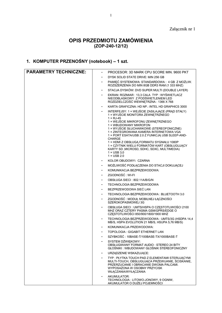 1 Załącznik nr 1 OPIS PRZEDMIOTU ZAMÓWIENIA (ZOP-240-12/12) 1. KOMPUTER PRZENOŚNY (notebook) – 1 szt. PARAMETRY TECHNICZNE: - PROCESOR: 3D MARK CPU SCORE MIN. 9600 PKT - STACJA DYSKÓW: DVD SUPER MULTI (DOUBLE LAYER) - KARTA GRAFICZNA: HD NP.: INTEL HD GRAPHICS 3000 - KOLOR OBUDOWY: CZARNA - OBSŁUGA SIECI : UMTS/HSPA O CZĘSTOTLIWOŚCI 2100 MHZ ORAZ CZTERY PASMA GSM/GPRS/EDGE O CZĘSTOTLIWOŚCI 850/900/1800/1900 MHZ - TECHNOLOGIA BEZPRZEWODOWA : UMTS/3G (HSDPA 14,4 MB/S, HSPA EVOLUTION 21 MB/S, HSUPA 5,76 MB/S) - KOMUNIKACJA PRZEWODOWA: - URZĄDZENIE WSKAZUJĄCE: - AKUMULATOR: TECHNOLOGIA : LITOWO-JONOWY, 9 OGNIW, AKUMULATOR O DUŻEJ POJEMNOŚCI DYSK SOLID STATE DRIVE: MIN 256 GB PAMIĘĆ SYSTEMOWA: STANDARDOWA : 4 GB Z MOŻLIW. ROZSZERZENIA DO MIN 8GB DDR3 RAM (1 333 MHZ) EKRAN: ROZMIAR : 13,3 CALA TYP : WYŚWIETLACZ NIEODBLASKOWY Z PODŚWIETLENIEM LED ROZDZIELCZOŚĆ WEWNĘTRZNA : 1366 X 768 INTERFEJSY: 1 × WEJŚCIE ZASILAJĄCE (PRĄD STAŁY) 1 × WYJŚCIE MONITORA ZEWNĘTRZNEGO 1 × RJ-45 1 × WEJŚCIE MIKROFONU ZEWNĘTRZNEGO 1 × WBUDOWANY MIKROFON 1 × WYJŚCIE SŁUCHAWKOWE (STEREOFONICZNE) 1 × ZINTEGROWANA KAMERA INTERNETOWA VGA 1 × PORT ESATA/USB 2.0 Z FUNKCJĄ USB SLEEP-ANDCHARGE 1 × HDMI Z OBSŁUGĄ FORMATU SYGNAŁU 1080P 1 × CZYTNIK WIELU FORMATÓW KART (OBSŁUGUJĄCY KARTY SD ,MICROSD, SDHC, SDXC, MULTIMEDIA) 1 × USB 3,0 1 × USB 2.0 MOŻLIWOŚĆ PODŁĄCZENIA DO STACJI DOKUJĄCEJ KOMUNIKACJA BEZPRZEWODOWA: ZGODNOŚĆ : WI-FI OBSŁUGA SIECI : 802.11A/B/G/N TECHNOLOGIA BEZPRZEWODOWA BEZPRZEWODOWA SIEĆ LAN TECHNOLOGIA BEZPRZEWODOWA : BLUETOOTH 3.0 ZGODNOŚĆ : MODUŁ MOBILNEJ ŁĄCZNOŚCI SZEROKOPASMOWEJ 3G TOPOLOGIA : GIGABIT ETHERNET LAN SZYBKOŚĆ : 10BASE-T/100BASE-TX/1000BASE-T SYSTEM DŹWIĘKOWY: OBSŁUGIWANY FORMAT AUDIO : STEREO 24 BITY GŁOŚNIKI : WBUDOWANY GŁOŚNIK STEREOFONICZNY TYP : PŁYTKA TOUCH PAD Z ELEMENTAMI STERUJĄCYMI MULTI-TOUCH, OBSŁUGUJĄCA PRZEWIJANIE, ŚCISKANIE, PRZERZUCANIE I OBRACANIE DWOMA PALCAMI. WYPOSAŻONA W OSOBNY PRZYCISK WŁĄCZANIA/WYŁĄCZANIA 2 MAKSYMALNY CZAS PRACY : DO MIN 8H - URZĄDZENIA W PAKIECIE: ZASILACZ PRĄDU PRZEMIENNEGO - FUNKCJE ZABEZPIECZEŃ: HASŁO DYSKU TWARDEGO NA ŻĄDANIE HASŁO NADZORCY GNIAZDO NA BLOKADĘ KABLOWĄ HASŁO UŻYTKOWNIKA ZAINSTALOWANY SYSTEM OPERACYJNY W POLSKIEJ WERSJI JĘZYKOWEJ, NP. SYSTEM WINDOWS 7 PROFESSIONAL KOMPATYBILNY I OBSŁUGUJACY ACTIVE DIRECTORY WYKORZYSTUJĄCY NAJNOWSZE STANDARDY BEZPIECZEŃSTWA (NP.:EFS,) - DODATKOWO POWINIEN POSIADAĆ: WYPOSAŻENIE DODATKOWE GWARANCJA - FIREWALL SYSTEMOWY PRZYWRACANIE SYSTEMU WBUDOWANE OPROGRAMOWANIE CHRONIACE PRZED PROGRAMAMI SZPIEGUJACYMI ZGODNOŚC Z NAJNOWSZYM OPROGRAMOWANIEM BIUROWYM TRYB AERO WYSZUKIWARKA PLIKÓW OBSŁUGA PULPITU ZDALNEGO ZOPTYMALIZOWANA OBSŁUGA KOMPUTERÓW TYPU TABLET KOPIA ZAPASOWA W TLE INTERFEJS W JĘZYKU POLSKM FUNKCJONALNOŚĆ OFERUJACA ŁATWY TRANSER PLIKÓW NA NOWY SYSTEM OPERACYJNY ROZPOZNAWANIE BIEŻĄCEJ LOKACJI UŻYTKOWNIKA NA POTRZEBY DRUKOWANIA DOKUMENTÓW CERTYFIKAT CE PAKIET BIUROWY W JĘZYKU POLSKIM ZAWIERAJACY, NP.: MICROSOFT OFFICE 2010 PL PKC DLA UŻYTKOWNIKÓW DOMOWYCH I MAŁYCH FIRM APLIKACJA DO TWORZENIA PREZENTACJI - ARKUSZ KALKULACYJNY - APLIKACJA DO TWORZENIA DOKUMENTÓW (EDYTOR TEKSTU.) APLIKACJA DO ODBIORU POCZTY INTERNETOWEJ KOMPATYBILNA Z OPROGRAMOWANIEM ANTYWIRUSOWYM MCAFEE MOŻLIWOŚC DOSTĘPU DO PLIKÓW ON-LINE WSPÓŁPRACA Z TECHNOLOGIĄ SHARE POINT SERVICES WAŻNOŚC LICENCJI : DOŻYWOTNIA TYP LICENCJI : RZĄDOWA LUB KOMERCYJNA TORBA NA POWYŻSZY NOTEBOOK MIN.24 M-CE USŁUGI GWARANCYJNE (DOOR TO DOOR) REALIZUJE DOSTAWCA SPRZĘTU (WYKONAWCA ZAMÓWIENIA) DODATKOWE WYMAGANIA Powyższe parametry spełnia np. TOSHIBA PORTEGE R830-130 3 2. STACJA DOKUJĄCA DO POWYŻSZEGO NOTEBOOKA (określonego w pkt. 1) – 1 szt. PARAMETRY TECHNICZNE: - TYP ROZWIĄZANIA DOKUJĄCEGO: STACJA DOKUJĄCA POŁĄCZENIE Z NOTEBOOKIEM (TYP ZŁĄCZA): ZŁĄCZE STACJI DOKUJĄCEJ / REPLIKATORA PORTÓW ZŁĄCZA ZEWNĘTRZNE: GWARANCJA - ZŁĄCZE D-SUB 1 SZT. ZŁĄCZE AUDIO (WEJŚCIE)1 SZT. ZŁĄCZE AUDIO (WYJŚCIE)1 SZT. ZŁĄCZE USB 2.0 (STANDARD) 4 SZT. ZŁĄCZE RJ-45 1 SZT. ZŁĄCZE RS-232 (SERIAL)1 SZT. ZŁĄCZE ZASILANIA 1 SZT. WYPOSAŻENIE DODATKOWE: ZASILACZ KABEL HDMI 1.4 MIN: 2M PRZEWÓD D-SUB min.2 m MIN 12 M-CY Powyższe parametry spełnia np. TOSHIBA HI-SPEED PORT REPLICATOR PORTEGE R700/R830 3. KOMPUTER PRZENOŚNY (NOTEBOOK) – 1 szt. PARAMETRY TECHNICZNE: - ZAINSTALOWANY SYSTEM OPERACYJNY NP. WINDOWS 7 PROFESSIONAL (WSPÓŁPRACA Z AD) - PROCESOR PROCESOR NP.INTEL COR I3-2350M (2,30 GHZ, 3 MB PAMIĘCI PODRĘCZNEJ L3) - PAMIĘĆ STANDARDOWA 4 GB PAMIĘCI DDR3 SDRAM 1333 MHZ - WEWNĘTRZNY DYSK TWARDY DYSK SATA II 320 GB - TECHNOLOGIE BEZPRZEWODOWE - NAPĘDY OPTYCZNE DVD+/-RW SUPERMULTI DL - WBUDOWANE GŁOŚNIKI STEREO, - WEJŚCIE MIKROFONU STEREO, - CZYTNIK KART PAMIĘCI EKRAN EKRAN LED HD 17,3"; 1600X900, Z POWŁOKĄ ANTYREFLEKSYJNĄ KARTA SIECIOWA 802.11B/G/N WIFI ORAZ BLUETOOTH 3.0 HS COMBO KARTA GRAFIKI KARTA GRAFICZNA NP. AMD RADEON HD 6490M Z 1 GB WYDZIELONEJ PAMIĘCI KARTY GRAFICZNEJ GDDR5 , WYJŚCIE SŁUCHAWEK STEREO/WYJŚCIE SYGNAŁOWE AUDIO (LINE OUT), WBUDOWANY MIKROFON GNIAZDA ROZSZERZEŃ 1 GNIAZDO KART EXPRESS CARD/34; ZEWNĘTRZNE PORTY WEJŚCIA/WYJŚCIA: 4 WYPOSAŻENIE DODATKOWE GWARANCJA - PORTY USB 2.0 MIN. X 2 - 1 GNIAZDO ZASILANIA; - INTERFEJS SIECIOWY KARTA SIECIOWA: ETHERNET (10/100/1000) - KLAWIATURA ODPORNA NA ZALANIE 1 PORT USB 3.0; 1 PORT VGA; 1 PORT HDMI; 1 WEJŚCIE MIKROFONU STEREO; 1 WYJŚCIE SŁUCHAWEK STEREO/WYJŚCIE SYGNAŁOWE AUDIO; 1 ZŁĄCZE RJ-11 (WYBRANE MODELE); 1 ZŁĄCZE RJ-45 GNIAZDA PAMIĘCI MIN. 2 GNIAZDA SODIMM ROZSZERZENIE PAMIĘCI MOŻLIWOŚĆ ROZBUDOWY DO 8 GB CZAS PRACY AKUMULATORA DO MIN. 6 GODZ. (8OGNIWOWY AKUMULATOR PODSTAWOWY) URZĄDZENIE WSKAZUJĄCE TABLICZKA DOTYKOWA Z PRZEWIJANIEM I OBSŁUGĄ GESTÓW WBUDOWANY APARAT FOTOGRAFICZNY KAMERA INTERNETOWA 720P HD PAKIET BIUROWY W JĘZYKU POLSKIM ZAWIERAJACY, NP.: MICROSOFT OFFICE 2010 PL PKC DLA UŻYTKOWNIKÓ