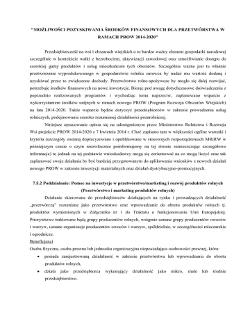"MOŻLIWOŚCI POZYSKIWANIA ŚRODKÓW FINANSOWYCH DLA PRZETWÓRSTWA W RAMACH PROW 2014-2020" Przedsiębiorczość na wsi i obszarach wiejskich o to bardzo ważny element gospodarki narodowej szczególnie w kontekście walki z bezrobociem, aktywizacji zawodowej oraz umożliwianie dostępu do szerokiej gamy produktów i usług mieszkańcom tych obszarów. Szczególnie ważne jest tu właśnie przetworzenie wyprodukowanego w gospodarstwie rolnika surowca by nadać mu wartość dodaną i uzyskiwać przez to zwiększone dochody. Przetwórstwo rolno-spożywcze by mogło się dalej rozwijać, potrzebuje środków finansowych na nowe inwestycje. Biorąc pod uwagę dotychczasowe doświadczenia z poprzednio realizowanych programów i wychodząc temu naprzeciw, zaplanowano wsparcie z wykorzystaniem środków unijnych w ramach nowego PROW (Program Rozwoju Obszarów Wiejskich) na lata 2014-2020. Także wsparcie będzie dotyczyć przedsiębiorców w zakresie prowadzenia usług rolniczych, podejmowania szeroko rozumianej działalności pozarolniczej. Niniejsze opracowanie opiera się na udostępnionym przez Ministerstwo Rolnictwa i Rozwoju Wsi projekcie PROW 2014-2020 z 7 kwietnia 2014 r. Choć zapisano tam w większości ogólne warunki i kryteria (szczegóły zostaną doprecyzowane i opublikowane w stosownych rozporządzeniach MRiRW w późniejszym czasie o czym niezwłocznie poinformujemy na tej stronie zamieszczając szczegółowe informacje) to jednak na tej podstawie wnioskodawcy mogą się zorientować na co mogą liczyć oraz tak zaplanować swoje działania by być bardziej przygotowanym do aplikowania wniosków z nowych działań nowego PROW w zakresie inwestycji materialnych oraz działań dystrybucyjno-promocyjnych. 7.5.2 Poddziałanie: Pomoc na inwestycje w przetwórstwo/marketing i rozwój produktów rolnych (Przetwórstwo i marketing produktów rolnych) Działanie skierowane do przedsiębiorców działających na rynku i prowadzących działalność „przetwórczą” rozumiane jako przetwórstwo oraz wprowadzanie do obrotu produktów rolnych tj. produktów wymienionych w Załączniku nr 1 do Traktatu o funkcjonowaniu Unii Europejskiej. Priorytetowo traktowane będą grupy producentów rolnych, wstępnie uznane grupy producentów owoców i warzyw, uznane organizacje producentów owoców i warzyw, spółdzielnie, w szczególności mleczarskie i ogrodnicze. Beneficjenci Osoba fizyczna, osoba prawna lub jednostka organizacyjna nieposiadająca osobowości prawnej, która: posiada zarejestrowaną działalność w zakresie przetwórstwa lub wprowadzania do obrotu produktów rolnych, działa jako przedsiębiorca przedsiębiorstwo. wykonujący działalność jako mikro, małe lub średnie Rolnik, domownik, małżonek rolnika podlegający ubezpieczeniu społecznemu rolników z mocy ustawy w pełnym zakresie – dotyczy podmiotów składających wnioski w naborze tematycznym dotyczącym wsparcia rozpoczynania działalności gospodarczej w zakresie przetwórstwa produktów rolnych. Koszty kwalifikowalne obejmują: koszty budowy (nie dotyczy budowy nowych obiektów w sektorach przetwórstwa i wprowadzania do obrotu: mleka i wyrobów mlecznych, mięsa, owoców i warzyw, zbóż, przedfsiębiorców, natomiast może to zrobić rolnik rozpoczynający działalność w zakresie przetwórstwa), modernizacji lub przebudowy budynków produkcyjnych lub magazynowych i budowli stanowiących infrastrukturę zakładów przetwórstwa, niezbędną do wdrożenia inwestycji w zakresie zakupu maszyn i urządzeń lub infrastruktury służącej ochronie środowiska, koszty zakupu (wraz z instalacją) lub leasingu zakończonego przeniesieniem prawa własności: maszyn lub urządzeń do przetwarzania, magazynowania lub przygotowania produktów do sprzedaży, aparatury pomiarowej, kontrolnej oraz sprzętu do sterowania procesem produkcji lub magazynowania, urządzeń służących poprawie ochrony środowiska, oprogramowania służącego zarządzaniu przedsiębiorstwem oraz sterowaniu procesem produkcji i magazynowania, wdrożenia procedury certyfikowanych systemów zarządzania jakością, opłaty za patenty i licencje, koszty ogólne tj.: przygotowanie dokumentacji technicznej projektu, przygotowanie biznesplanu, nadzoru urbanistycznego, architektonicznego, budowlanego lub konserwatorskiego. Warunki kwalifikowalności Wspierane będą operacje przez wnioskodawców zaopatrujących się w co najmniej 50% surowców do produkcji na podstawie umów długoterminowych a wzrost sprzedaży w wyniku operacji możliwy jest tylko pod warunkiem udokumentowania bazy surowcowej oraz wykazania możliwości zbytu planowanej produkcji. Warunek ten nie dotyczy rolników w naborach tematycznych. Operacje nie mogą dotyczyć sprzedaży detalicznej – warunek ten nie dotyczy podmiotów składających wnioski w naborze tematycznym dotyczącym wsparcia rozpoczynania działalności gospodarczej w zakresie przetwórstwa produktów rolnych. Szczególne preferencje będą dotyczyły: ochrony środowiska, innowacyjności, przeciwdziałania zmianom klimatu, wnioskodawców, którzy posiadają określony poziom umów zawartych bezpośrednio z producentami rolnymi, inwestycje w gminach należących do powiatów o najwyższym poziomie bezrobocia w kraju, młodych rolników tj. rolników poniżej 40. roku życia, podlegających ubezpieczeniu społecznemu rolników z mocy ustawy w pełnym zakresie – dotyczy podmiotów składających wnioski w naborze tematycznym, dotyczącym wsparcia rozpoczynania działalności gospodarczej w zakresie przetwórstwa produktów rolnych. Kwoty i wielkość wsparcia Poziom pomocy wynosi maksymalnie 50% kosztów inwestycji kwalifikującej się do wsparcia. Maksymalna wysokość pomocy przyznana jednemu beneficjentowi wynosi 3 000 000 zł, a w przypadków związków grup producentów rolnych lub zrzeszeń organizacji producentów, wynosi 15 000 000 zł. Minimalna wysokość wynosi 100 000 zł. W przypadku operacji realizowanyc