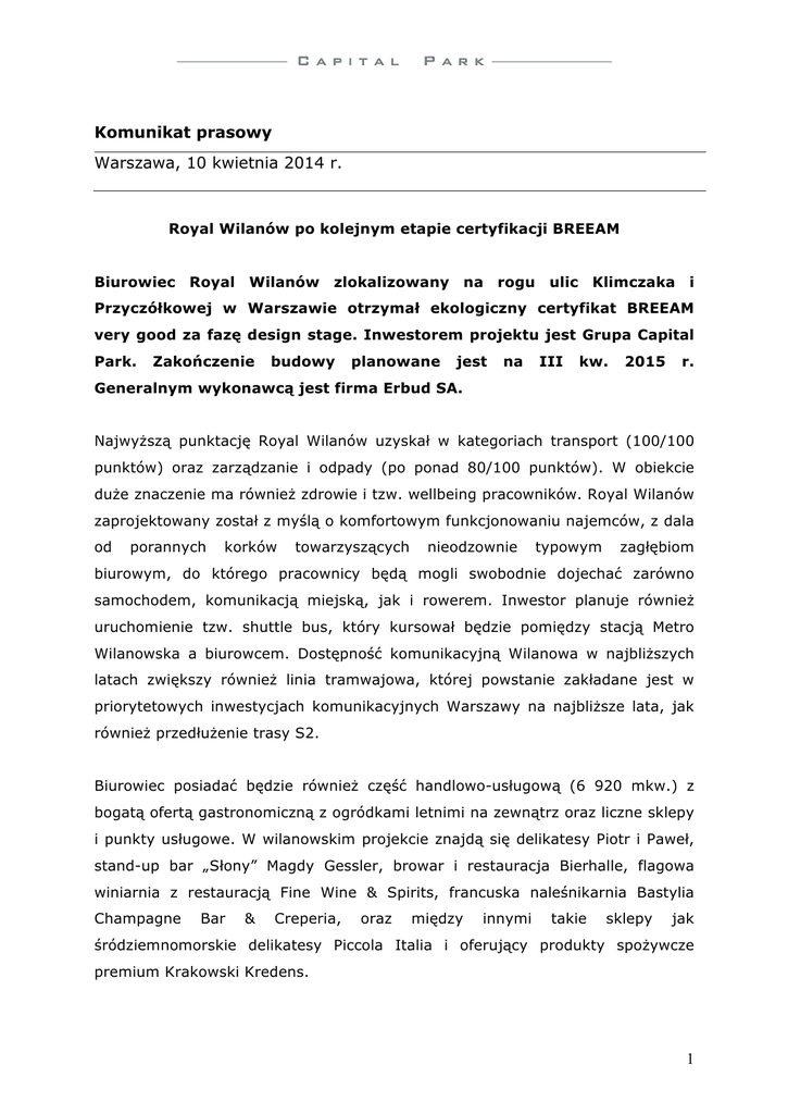 Komunikat prasowy Warszawa, 10 kwietnia 2014 r. INFORMACJA PRASOWA Royal Wilanów po kolejnym etapie certyfikacji BREEAM Biurowiec Royal Wilanów zlokalizowany na rogu ulic Klimczaka i Przyczółkowej w Warszawie otrzymał ekologiczny certyfikat BREEAM very good za fazę design stage. Inwestorem projektu jest Grupa Capital Park. Zakończenie budowy planowane jest na III kw. 2015 r. Generalnym wykonawcą jest firma Erbud SA. Najwyższą punktację Royal Wilanów uzyskał w kategoriach transport (100/100 punktów) oraz zarządzanie i odpady (po ponad 80/100 punktów). W obiekcie duże znaczenie ma również zdrowie i tzw. wellbeing pracowników. Royal Wilanów zaprojektowany został z myślą o komfortowym funkcjonowaniu najemców, z dala od porannych korków towarzyszących nieodzownie typowym zagłębiom biurowym, do którego pracownicy będą mogli swobodnie dojechać zarówno samochodem, komunikacją miejską, jak i rowerem. Inwestor planuje również uruchomienie tzw. shuttle bus, który kursował będzie pomiędzy stacją Metro Wilanowska a biurowcem. Dostępność komunikacyjną Wilanowa w najbliższych latach zwiększy również linia tramwajowa, której powstanie zakładane jest w priorytetowych inwestycjach komunikacyjnych Warszawy na najbliższe lata, jak również przedłużenie trasy S2. Biurowiec posiadać będzie również część handlowo-usługową (6 920 mkw.) z bogatą ofertą gastronomiczną z ogródkami letnimi na zewnątrz oraz liczne sklepy i punkty usługowe. W wilanowskim projekcie znajdą się delikatesy Piotr i Paweł, stand-up bar „Słony” Magdy Gessler, browar i restauracja Bierhalle, flagowa winiarnia z restauracją Fine Wine & Spirits, francuska naleśnikarnia Bastylia Champagne Bar & Creperia, oraz między innymi takie sklepy jak śródziemnomorskie delikatesy Piccola Italia i oferujący produkty spożywcze premium Krakowski Kredens. 1 Już wiadomo, że do części biurowej wprowadzą się m.in. Erbud SA, Varsovia oraz sam inwestor projektu – Grupa Capital Park. Royal Wilanów będzie obiektem pięciokondygnacyjnym, w którym znajdzie się 29 787 mkw. nowoczesnej przestrzeni biurowej. W podziemnej części budynku znajdzie się trzykondygnacyjny parking na 915 miejsc postojowych dla najemców i klientów oraz parking rowerowy. 270 miejsc parkingowych będzie ogólnodostępne, dzięki czemu goście i klienci najemców z łatwością będą mogli pozostawić samochód i udać się na spotkanie, co jest obecnie problamatyczne w większości warszawskich biurowców. Autorem projektu architektonicznego jest pracownia JEMS Architekci. Za komercjalizację części handlowej odpowiada BOIG, zaś biurowej – Colliers International. Finansowanie inwestycji na kwotę 61 mln euro oraz finansowanie VAT do kwoty 20 mln zł zapewniła Powszechna Kasa Oszczędności Bank Polski S.A. *** Dodatkowe informacje: Inwestor Grupa Capital Park jest doświadczonym i aktywnym inwestorem i deweloperem działającym na rynku nieruchomości w Polsce od ponad dziewięciu lat, specjalizującym się w wyszukiwaniu i wykorzystywaniu okazji rynkowych (ang. opportunistic investor). Głównym przedmiotem działalności Grupy jest nabywanie nieruchomości ze znacznym potencjałem budowy wartości, np. poprzez zmianę warunków zagospodarowania przestrzennego lub uzyskanie pozwolenia na budowę, budowę nowych lub przebudowę istniejących obiektów, lub poprawę zarządzania istniejącymi budynkami. Capital Park osiąga dochody z najmu oraz ze sprzedaży nieruchomości lub produktów inwestycyjnych opartych na nieruchomościach. Grupa aktywnie poszukuje możliwości zakupu nowych projektów nieruchomościowych oraz nowych źródeł dochodów i wzrostu wartości w obszarach rynku charakteryzujących się dużym potencjałem rozwoju. Od rozpoczęcia działalności w 2003 roku Grupa przeprowadziła ok. 100 transakcji inwestycyjnych i zarządza portfelem nieruchomości obejmującym 76 projektów o łącznej powierzchni wynajmu brutto ok. 250 tys. mkw., zlokalizowanych w 39 miastach. Spośród tych projektów 39 nieruchomości handlowych typu high-street znajduje się w strukturze 2 nowo utworzonego, innowacyjnego na polskim rynku Real Estate Income Assets FIZ AN, którym Grupa aktywnie zarządza i w którym posiada 15-proc. udział. Biuro prasowe Capital Park Joanna Cybulska tel. 0 48 22 642 24 16, + 48 609 716 113 email: [email protected] Katarzyna Marchewka tel. 0 48 22 642 24 16, + 48 605 418 181 email: [email protected] 3