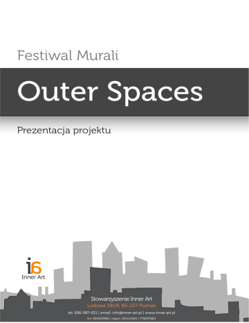 Festiwal Murali Outer Spaces Prezentacja projektu Szanowni Państwo, Jesteśmy Stowarzyszeniem Inner Art działającym od marca 2009 roku. Członkami organizacji są studenci różnych kierunków i artyści. W ciągu dwuletniej działalności zorganizowaliśmy liczne warsztaty artystyczne mające na celu animację poznańskich społeczności lokalnych. Poprzez wykłady, wystawy, konferencje dążyliśmy do integracji środowisk twórczych i lokalnych konkretnych dzielnic naszego miasta. Współorganizowaliśmy również liczne imprezy audiowizualne (m.in. z Kolektywem Ictus oraz Stowarzyszeniem Inicjatyw Cokolwiek). Ze względu na to, że jednym z głównych celów naszej działalności jest promowanie sztuki współczesnej chcemy Państwu zaproponować udział w niepowtarzalnym wydarzeniu, jakim będzie Festiwal Murali Outer Spaces. Opis Wydarzenia Festiwal Outer Spaces Festiwal Outer Spaces to pierwsze tego rodzaju wydarzenie w Poznaniu. Łączy w sobie działalność artystyczną związaną z kulturą Urban artu i rewitalizację przestrzeni miejskiej w kontekście estetycznym i społecznym. Malowanie murali jest głównym elementem festiwalu Outer Spaces 2011. Odbywać się będzie w sześciu miejscach równocześnie. Miejsca te, to wybrane ściany budynków w centrum miasta Poznania. Są to głównie ściany szczytowe, na granicach działek budowlanych. Przez brak okien i jakiegokolwiek detalu -pozbawione wyrazu, często szpecą okolicę. Jednym słowem miejsca wymagające rewitalizacji zarówno materialnej jak i społeczno-kulturowej. Murale to monumentalne dzieła malarskie powstające bezpośrednio na ścianie, suficie lub innej dużej płaszczyźnie (np. mur, skała). Wykonywane różnymi technikach artystycznymi, opowiadają najróżniejsze historie – polityczne, społeczne i zwyczajne. Czasem są tylko popisem brawury oraz artystycznych możliwości ich twórców. Są środkiem wyrazu głównie artystów młodego pokolenia, chcących, aby sztuka była otwarta na ulicę, pozwalała stanąć i zamyślić się nad ważnymi sprawami. Niekiedy chodzi jedynie o to, aby dawać odbiorcom radość i powodować uśmiech na twarzach przechodniów. Współcześnie murale stały się ważnym elementem krajobrazu miejskiego w takich metropoliach jak Barcelona, Berlin, Paryż. Festiwale murali zyskują coraz większą popularność również w Polsce. Organizowane były między innymi we Wrocławiu, Gdańsku i Warszawie. Chcemy, żeby Poznań również pojawił się na mapie muralowych galerii świata. Dlatego wybraliśmy centralne punkty Poznania, tak, aby nikt nie mógł obok nich przejść obojętnie. Staną się charakterystycznymi elementami miasta, które dzięki nim nabierze wyrazu. Planujemy, aby festiwal Outer Spaces stał się cyklicznym wydarzeniem na mapie kulturalnej Poznania oraz stworzył swoistą galerię młodych artystów dostępną dla każdego. Festiwal Outer Spaces ma charakter interdyscyplinarny - równolegle z malowaniem murali odbywać się będzie: ‣ pokaz filmu „ Bomb It 2” o światowym street Arcie; ‣ dyskusja na temat rewitalizacji przestrzeni miejskiej z udziałem specjalistów i profesorów różnych kierunków ‣ koncerty mające na celu promocję lokalnych artystów ‣ warsztaty artystyczne skierowane do mieszkańców Poznania ‣ muralowe jam session, dające możliwość wypowiedzi artystycznej nie tylko artystom, ale również zainteresowanym mieszkańcom Poznania ‣ alleycat – wyścig rowerowy tropem dawnych murali poznańskich Etapy realizacji projektu Etap 1 (styczeń-kwiecień 2011) Przygotowanie formalne projektu i pozyskanie środków finansowych Etap 2 (marzec- maj 2011) Promocja medialna Festiwalu (radio, TV, prasa codzienna i opiniotwórcza, Internet) Etap 3 (maj 2011) Organizacja i realizacja Festiwalu - Program: 16.05.2011 - Otwarcie festiwalu (audiowizualna impreza w klubie 8bitów) Głównym celem wydarzenia będzie zaprezentowanie zebranym idei festiwalu przedstawienie sylwetek artystów biorących w nim udział oraz promocja młodych twórców poznańskiej sceny muzyki alternatywnej. 17.05.2011- 20.05.2011 – Malowanie murali Malowanie murali przez międzynarodowej sławy artystów, wprowadzi na ulice Poznania, klimat artystycznego fermentu, jaki panuje w europejskich metropoliach jak Berlin, Paryż, czy Barcelona. W miarę upływu lat, i powstawaniu kolejnych tego typu projektów, mamy szansę zmienić wizerunek polskiego blokowiska. W szarą, niezwykle zimną, architekturę socrealistyczną wprowadzić kolor, malarstwo, fantazje. Dzięki tym działaniom zdegradowane części miasta zostaną na nowo wcielone do tkanki miejskiej. 17.05.2011 – Projekcja filmu dokumentalnego pt. „Bomb it 2” (Kino Muza) Idea wyświetlenia filmu pt. „Bomb it 2” ma na celu pokazanie graffiti oraz szeroko pojętej sztuki ulicy w sposób innowacyjny i ciekawy. Film ten wyróżnia się swoim transnarodowym charakterem, ponieważ pokazuje sceny sztuki ulicy na sześciu kontynentach. Widz zobaczy, że w zależności od kontekstu kulturowego street art przyjmuje zupełnie inną formę i wymiar. 18.05.2011 – Dyskusja na temat przestrzeni miejskiej (klub 8bitów) Dyskusja pozwoli poznać i zestawić ze sobą różnorodne stanowiska analityczne – społeczne, urbanistyczne, administracyjne, oraz reprezentujące je osoby, które mają ograniczone możliwości skonfrontowania swoich poglądów na co dzień. Zakłada się również wypracowanie wspólnego stanowiska dotyczącego przestrzeni miejskiej oraz ugruntowanie założeń dotyczących sztuki ulicy, a zwłaszcza estetyzacji miasta za pomocą murali. 19.05.2011 – Warsztaty „Zmaluj to” Warsztaty mają charakter otwarty, mogą brać w nich udział wszyscy chętni. Mają one na celu przede wszystkim umożliwienie poznaniakom i turystom realnego, codziennego obcowania ze współczesną sztuką. 19.05.2011 – 20.05.2011 – Muralowe jam session W odróżnieniu od Dużych murali, projekt nie 