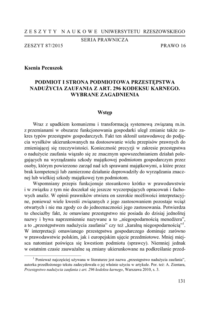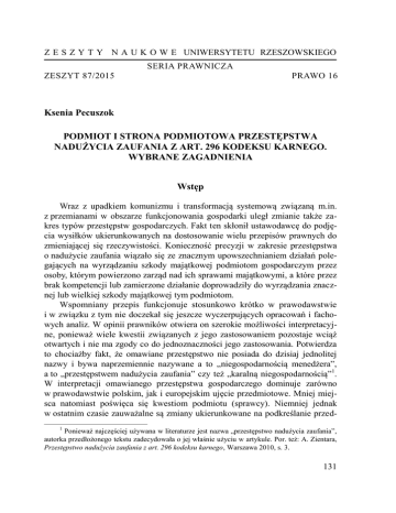 Z E S Z Y T Y N A U K O W E UNIWERSYTETU RZESZOWSKIEGO SERIA PRAWNICZA ZESZYT 87/2015 PRAWO 16 Ksenia Pecuszok PODMIOT I STRONA PODMIOTOWA PRZESTĘPSTWA NADUŻYCIA ZAUFANIA Z ART. 296 KODEKSU KARNEGO. WYBRANE ZAGADNIENIA Wstęp Wraz z upadkiem komunizmu i transformacją systemową związaną m.in. z przemianami w obszarze funkcjonowania gospodarki uległ zmianie także zakres typów przestępstw gospodarczych. Fakt ten skłonił ustawodawcę do podjęcia wysiłków ukierunkowanych na dostosowanie wielu przepisów prawnych do zmieniającej się rzeczywistości. Konieczność precyzji w zakresie przestępstwa o nadużycie zaufania wiązało się ze znacznym upowszechnianiem działań polegających na wyrządzaniu szkody majątkowej podmiotom gospodarczym przez osoby, którym powierzono zarząd nad ich sprawami majątkowymi, a które przez brak kompetencji lub zamierzone działanie doprowadziły do wyrządzania znacznej lub wielkiej szkody majątkowej tym podmiotom. Wspomniany przepis funkcjonuje stosunkowo krótko w prawodawstwie i w związku z tym nie doczekał się jeszcze wyczerpujących opracowań i fachowych analiz. W opinii prawników otwiera on szerokie możliwości interpretacyjne, ponieważ wiele kwestii związanych z jego zastosowaniem pozostaje wciąż otwartych i nie ma zgody co do jednoznaczności jego zastosowania. Potwierdza to chociażby fakt, że omawiane przestępstwo nie posiada do dzisiaj jednolitej nazwy i bywa naprzemiennie nazywane a to „niegospodarnością menedżera”, a to „przestępstwem nadużycia zaufania” czy też „karalną niegospodarnością”1. W interpretacji omawianego przestępstwa gospodarczego dominuje zarówno w prawodawstwie polskim, jak i europejskim ujęcie przedmiotowe. Mniej miejsca natomiast poświęca się kwestiom podmiotu (sprawcy). Niemniej jednak w ostatnim czasie zauważalne są zmiany ukierunkowane na podkreślanie przed1 Ponieważ najczęściej używana w literaturze jest nazwa „przestępstwo nadużycia zaufania”, autorka przedłożonego tekstu zadecydowała o jej właśnie użyciu w artykule. Por. też: A. Zientara, Przestępstwo nadużycia zaufania z art. 296 kodeksu karnego, Warszawa 2010, s. 3. 131 miotowo-podmiotowego charakteru omawianego przestępstwa, co wiąże się szczególnie z upowszechnianiem tzw. white-collar crime2. Celem artykułu jest analiza wybranych zagadnień powodujących trudności interpretacyjne przepisów związanych z ujęciem podmiotu i strony podmiotowej przestępstwa nadużycia zaufania z § 296 k.k. W tym kontekście podjęto próbę określenia takich pojęć, jak: „zajmowanie się” i „prowadzenie”, „działalność gospodarcza”, „przedsiębiorca” oraz „sprawy majątkowe”. Zamierzeniem autorki publikacji jest chęć ukazania przestępstwa nadużycia zaufania w szerszym kontekście prawa gospodarczego i/lub karnego, co pozwali na lepsze jego zrozumienie i da podstawę do rozpoznania wielu zjawisk mogących mieć znaczenie dla sposobu jego interpretacji w przyszłości. Analiza problemu oparta została m.in. na opracowaniach, które w wielu przypadkach zaliczyć można do klasyki literatury prawniczej. Wystarczy tu wymienić chociażby prace O. Górniok, C. Kuleszy, P. Ochmana, J. Skorupki czy R. Zawłockiego i A. Zientary. Wymieniona literatura posiada w odniesieniu do art. 296 k.k. w dużej mierze ograniczone znaczenie, a to ze względu na nieco marginalne potraktowanie przestępstwa nadużycia zaufania – oprócz monografii A. Zientary poświęconej w całości temu zagadnieniu. Przestępstwo z art. 296 k.k. omawiane jest najczęściej niejako przy okazji analizy szerszych zagadnień. Z tego powodu kolejną i istotną bazę źródłową pracy stanowią liczne „Dzienniki Ustaw”, wyroki Sądu Najwyższego, Najwyższego Sądu Administracyjnego, rozporządzenia Rady Ministrów, a także artykuły poświęcone problematyce prawniczej opublikowane w formie elektronicznej. Charakter podmiotu przestępstwa nadużycia zaufania Przestępstwo o nadużycie zaufania zostało zdefiniowane w art. 296: § 1 k.k.: „Kto, będąc obowiązany na podstawie przepisu ustawy, decyzji właściwego organu lub umowy do zajmowania się sprawami majątkowymi lub działalnością gospodarczą osoby fizycznej, prawnej albo jednostki organizacyjnej niemającej osobowości prawnej, przez nadużycie udzielonych mu uprawnień lub niedopeł2 Pojęcie white-collar crime zostało wprowadzone do nauki w 1949 r. przez socjologa amerykańskiego E. Sutherlanda. Stworzona przez niego definicja opierająca się na klasowej koncepcji przestępstwa mówiła, że jest to „przestępstwo popełnione w trakcie pełnienia obowiązków zawodowych przez osobę cieszącą się powszechnym szacunkiem i zajmującą wysoki status społeczny”. Takie ujęcie przyczyniło się z pewnością do faktu, że prawodawstwo amerykańskie zorientowane jest bardziej na podmiot omawianego przestępstwa niż na przedmiot. Por. J.S. Baker, The Sociological Origins of „White-Collar Crime”, http://www.heritage.org/research/reports/2004/10/the-sociologicalorigins-of-white-collar-crime. 132 nienie ciążącego na nim obowiązku, wyrządza jej znaczną szkodę majątkową, podlega karze pozbawienia wolności od 3 miesięcy do lat 5. § 2. Jeżeli sprawca przestępstwa określonego w § 1 działa w celu osiągnięcia korzyści majątkowej, podlega karze pozbawienia wolności od 6 miesięcy do lat 8. § 3. Jeżeli sprawca przestępstwa określonego w § 1 lub 2 wyrządza szkodę majątkową w wielkich rozmiarach, podlega karze pozbawienia wolności od roku do lat 10. § 4. Jeżeli sprawca przestępstwa określonego w § 1 lub 3 działa nieumyślnie, podlega karze pozbawienia wolności do lat 3. § 5. Nie podlega karze, kto przed wszczęciem postępowania karnego dobrowolnie naprawił w całości wyrządzoną szkodę”3. Przestępstwo z art. 296 k.k. jest przestępstwem indywidualnym właściwym, ponieważ odpowiedzialność karna uwa