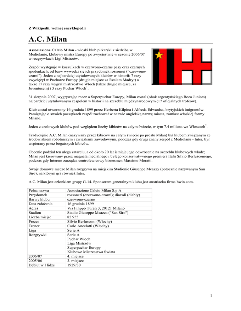 spodenkach; od barw wywodzi się ich przydomek rossoneri ("czerwonoczarni"). Jeden z najbardziej utytułowanych klubów w historii: 7 razy