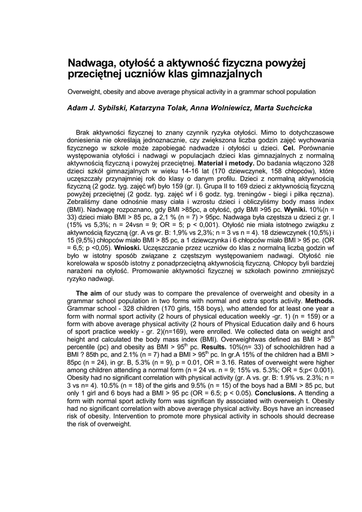 Nadwaga, otyłość a aktywność fizyczna powyżej przeciętnej uczniów klas gimnazjalnych Overweight, obesity and above average physical activity in a grammar school population Adam J. Sybilski, Katarzyna Tolak, Anna Wolniewicz, Marta Suchcicka Brak aktywności fizycznej to znany czynnik ryzyka otyłości. Mimo to dotychczasowe doniesienia nie określają jednoznacznie, czy zwiększona liczba godzin zajęć wychowania fizycznego w szkole może zapobiegać nadwadze i otyłości u dzieci. Cel. Porównanie występowania otyłości i nadwagi w populacjach dzieci klas gimnazjalnych z normalną aktywnością fizyczną i powyżej przeciętnej. Materiał i metody. Do badania włączono 328 dzieci szkół gimnazjalnych w wieku 14-16 lat (170 dziewczynek, 158 chłopców), które uczęszczały przynajmniej rok do klasy o danym profilu. Dzieci z normalną aktywnością fizyczną (2 godz. tyg. zajęć wf) było 159 (gr. I). Grupa II to 169 dzieci z aktywnością fizyczną powyżej przeciętnej (2 godz. tyg. zajęć wf i 6 godz. tyg. treningów - biegi i piłka ręczna). Zebraliśmy dane odnośnie masy ciała i wzrostu dzieci i obliczyliśmy body mass index (BMI). Nadwagę rozpoznano, gdy BMI >85pc, a otyłość, gdy BMI >95 pc. Wyniki. 10%(n = 33) dzieci miało BMI > 85 pc, a 2,1 % (n = 7) > 95pc. Nadwaga była częstsza u dzieci z gr. I (15% vs 5,3%; n = 24vsn = 9; OR = 5; p < 0,001). Otyłość nie miała istotnego związku z aktywnością fizyczną (gr. A vs gr. B: 1,9% vs 2,3%; n = 3 vs n = 4). 18 dziewczynek (10,5%) i 15 (9,5%) chłopców miało BMI > 85 pc, a 1 dziewczynka i 6 chłopców miało BMI > 95 pc. (OR = 6,5; p <0,05). Wnioski. Uczęszczanie przez uczniów do klas z normalną liczbą godzin wf było w istotny sposób związane z częstszym występowaniem nadwagi. Otyłość nie korelowała w sposób istotny z ponadprzeciętną aktywnością fizyczną. Chłopcy byli bardziej narażeni na otyłość. Promowanie aktywności fizycznej w szkołach powinno zmniejszyć ryzyko nadwagi. The aim of our study was to compare the prevalence of overweight and obesity in a grammar school population in two forms with normal and extra sports activity. Methods. Grammar school - 328 children (170 girls, 158 boys), who attended for at least one year a form with normal sport activity (2 hours of physical education weekly -gr. 1) (n = 159) or a form with above average physical activity (2 hours of Physical Education daily and 6 hours of sport practice weekly - gr. 2)(n=169), were enrolled. We collected data on weight and height and calculated the body mass index (BMI). Overweightwas defined as BMI > 85th percentile (pc) and obesity as BMI > 95th pc. Results. 10%(n= 33) of schoolchildren had a BMI ? 85th pc, and 2.1% (n = 7) had a BMI > 95th pc. In gr.A 15% of the children had a BMI > 85pc (n = 24), in gr. B, 5.3% (n = 9), p = 0.01, OR = 3.16. Rates of overweight were higher among children attending a normal form (n = 24 vs. n = 9; 15% vs. 5.3%; OR = 5;p< 0.001). Obesity had no significant correlation with physical activity (gr. A vs. gr. B: 1.9% vs. 2.3%; n = 3 vs n= 4). 10.5% (n = 18) of the girls and 9.5% (n = 15) of the boys had a BMI > 85 pc, but only 1 girl and 6 boys had a BMI > 95 pc (OR = 6.5; p < 0.05). Conclusions. A ttending a form with normal sport activity form was significan tly associated with overweigh t. Obesity had no significant correlation with above average physical activity. Boys have an increased risk of obesity. Intervention to promote more physical activity in schools should decrease the risk of overweight.