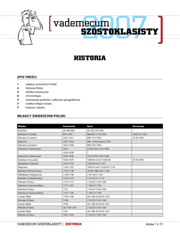 HISTORIA Spis treści 1 2 5 6 7 7 7 władcy zwierzchni Polski historia Polski źródła historyczne chronologia ważniejsze podróże i odkrycie geograficzne wielkie religie świata kultura i sztuka WŁADCY ZWIERZCHNI POLSKI Władca Panowanie Życie Mieszko I ok. 960-992 ok. 935-25 V 992 Bolesław I Chrobry 992-1025 966/967-17 VI 1025 18(23) IV 1025 25 XII 1025 Mieszko II Lambert 1025-1031 990-10 V 1034 Bezprym 1031-1032 986 - zima/wiosna 1032 Mieszko II Lambert 1032-1034 990-10 V 1034 25 VII 1016-19 III 1058 Kazimierz I Odnowiciel 1034 ? 1034-1038 ? Kazimierz I Odnowiciel 1039-1058 25 VII 1016-19 III 1058 Bolesław II Szczodry 1058-1079 1040/42-2/3 IV 1081/82 Władysław I Herman 1079-1102 1042/44-4 VI 1102 Zbigniew 1102-1107 1070/73-ok.1112(8 VII 1113) Bolesław III Krzywousty 1102-1138 20 VIII 1086-28 X 1138 Władysław II Wygnaniec 1138-1146 1105-30 V 1159 Bolesław IV Kędzierzawy 1146-1173 1121/22-5 I 1173 Mieszko III Stary 1173-1177 1122/25-13 III 1202 Kazimierz II Sprawiedliwy 1177-1191 1138-5 V 1194 Mieszko III Stary 1191 1122/25-13 III 1202 Kazimierz II Sprawiedliwy 1191-1194 1138-5 V 1194 Leszek I Biały 1194-1198 ok.1186-23/24 XI 1227 Mieszko III Stary 1198 1122/25-13 III 1202 Leszek I Biały 1198 ok.1186-23/24 XI 1227 Mieszko III Stary ok.1199-1201 1122/25-13 III 1202 Leszek I Biały 1201 ok.1186-23/24 XI 1227 Mieszko III Stary 1201-1202 1122/25-13 III 1202 VADEMECUM SZÓSTOKLASISTY | HISTORIA Koronacja 25 XII 1076 strona z 11 Władysław III Laskonogi 1202-1206 1161/66-18 VIII (3 XI) 1231 Leszek I Biały 1206-1210 ok.1186-23/24 XI 1227 Mieszko I Plątonogi 1210-1211 1131/32-16 V 1211 Leszek I Biały 1211-1227 ok.1186-23/24 XI 1227 Władysław III Laskonogi 1228-1231 1161/66-18 VIII (3 XI) 1231 Henryk I Brodaty 1231-1238 1165/70-19 III 1238 Henryk II Pobożny 1238-1241 1196/1204-9 IV 1241 Konrad I Mazowiecki 1241-1243 1187/88-30 VIII 1247 Bolesław V Wstydliwy 1243-1279 21 VI 1226-7 XII 1279 Leszek II Czarny 1279-1288 1240/42-30 IX 1288 Henryk IV Probus 1288-1290 1257/58-23 VI 1290 Przemysł II 1290-1291 14 X 1257-8 II 1296 Wacław II Czeski 1291-1305 17 IX 1271-21 VI 1305 VIII 1300 Przemysł II 1295-1296 14 X 1257-8 II 1296 26 VI 1295 Wacław III Czeski 1305-1306 6 X 1289-4 VIII 1306 Władysław I Łokietek 1305-1333 17 IX 1260-2 III 1333 20 I 1320 Kazimierz III Wielki 1333-1370 30 IV 1310-5 XI 1370 25 IV 1333 Ludwik Andegaweński 1370-1382 5 III 1326-11 IX 1382 17 XI 1370 Jadwiga Andegaweńska 1384-1399 15/18 II 1374-17 VII 1399 15 X 1384 Władysław II Jagiełło 1386-1434 ok.1351-1 VI 1434 4 III 1386 Władysław III Warneńczyk 1434-1444 31 X 1424-10 XI 1444 25 VII 1434 Kazimierz IV Jagiellończyk 1447-1492 29 XI 1427-7 VI 1492 25 VI 1447 Jan I Olbracht 1492-1501 27 XII 1459-17 VI 1501 23 IX 1492 Aleksander I Jagiellończyk 1501-1506 5 VIII 1461-19 VIII 1506 12 XII 1501 Zygmunt I Stary 1506-1548 1 I 1467-1 IV 1548 24 I 1507 Zygmunt II August 1548-1572 1 VIII 1520-7 VII 1572 20 II 1530 Henryk Walezy 1573-1574 19 IX 1551-2 VIII 1589 21 II 1574 Anna Jagiellonka 1575 18 X 1523-9 IX 1596 Stefan I Batory 1575-1586 27 IX 1533-12 XII 1586 Zygmunt III Waza 1587-1632 10 VI 1566-30 IV 1632 1 V 1576 27 XII 1587 Władysław IV Waza 1632-1648 9 VI 1595-20 V 1648 6 II 1633 Jan II Kazimierz Waza 1648-1668 22 III 1609-20 XI 1672 17 I 1649 Michał Korybut Wiśniowiecki 1669-1673 21 VII 1640-10 XI 1673 29 IX 1669 Jan III Sobieski 1674-1696 17 VIII 1629-17 VI 1696 2 II 1676 August II Mocny 1697-1706 12 V 1670-2 II 1733 15 IX 1697 Stanisław Leszczyński 1704-1709 20 X 1677-23 II 1766 4 X 1705 August II Mocny 1709-1733 12 V 1670-2 II 1733 15 IX 1697 Teodor Andrzej Potocki 1733 13 II 1664-12 XI 1738 Stanisław Leszczyński 1733-1736 20 X 1677-23 II 1766 4 X 1705 August III Sas 1733-1763 7 (17) X 1696-5 X 1763 17 I 1734 Stanisław August Poniatowski 1764-1795 17 I 1732-12 II 1798 25 XI 1764 HISTORIA POLSKI Chrzest Polski Państwo polskie powstało na ziemiach pomiędzy Wisłą, Wartą i Odrą ponad 1000 lat temu. Sąsiadami Polski byli na zachodzie Niemcy, na południu Czesi, a na wschodzie Rusini. Pierwszym polskim władcą, o którym zapisano informacje za jego życia, był Mieszko I. Panował w X wieku, w latach ~960–992. W tamtych czasach wielkie obszary naszego kraju zajmowała ogromna puszcza. Mieszkały w niej liczne dzikie zwierzęta. Ludzie poruszali się duktami leśnymi, które, zwłaszcza w okresie zimy, wczesnej wiosny i późnej jesieni, były trudne do przebycia. VADEMECUM SZÓSTOKLASISTY | HISTORIA strona z 11 Na ziemiach polskich mieszkało wówczas około miliona osób. Polacy uprawiali rolę, hodowali bydło, owce i kozy, polowali i łowili ryby. Mieszkali w otoczonych wałami ziemnymi grodach lub na wsi. Stolicą państwa było Gniezno. W 966 roku Mieszko I wraz ze swoim dworem przyjął chrzest. Oznaczało to również chrystianizację całego kraju. Wydarzenie to miało ogromne znaczenie dla dalszych dziejów Polski. Jej książę został postawiony na równi z innymi władcami chrześcijańskimi łatwiej mu było nawiązywać kontakty polityczne i kulturalne z innymi państwami chrześcijańskiej Europy. Dzięki przyjęciu przez Mieszka chrztu do Polski przybywali wykształceni duchowni. Zorganizowali oni i prowadzili kancelarię książęcą, pomagali w zarządzaniu państwem, wnosili w życie kraju zdobycze cywilizacyjne i duchowe chrześcijańskiego Zachodu. Zjazd Gnieźnieński Bolesław Chrobry był synem Mieszka I. Za jego panowania Polska stała się państwem silnym, z którym liczyli się sąsiedzi. W 997 roku udzielił pomocy w misji chrystianizacyjnej do Prusów biskupowi praskiemu Wojciechowi. Po męczeńskiej śmierci misjonarza Bolesław wykupił jego zwłoki i pochował w Gnieźnie. W ten sposób Polska uzyskała własnego męczennika, który został w Rzymie uznany za świętego, a katedra gnieźnieńska stała się jeszcze ważniejszym miejscem kultu. W 1000 roku doszło do wydarzenia, które odbiło się głośnym echem w całym świecie chrześcijań
